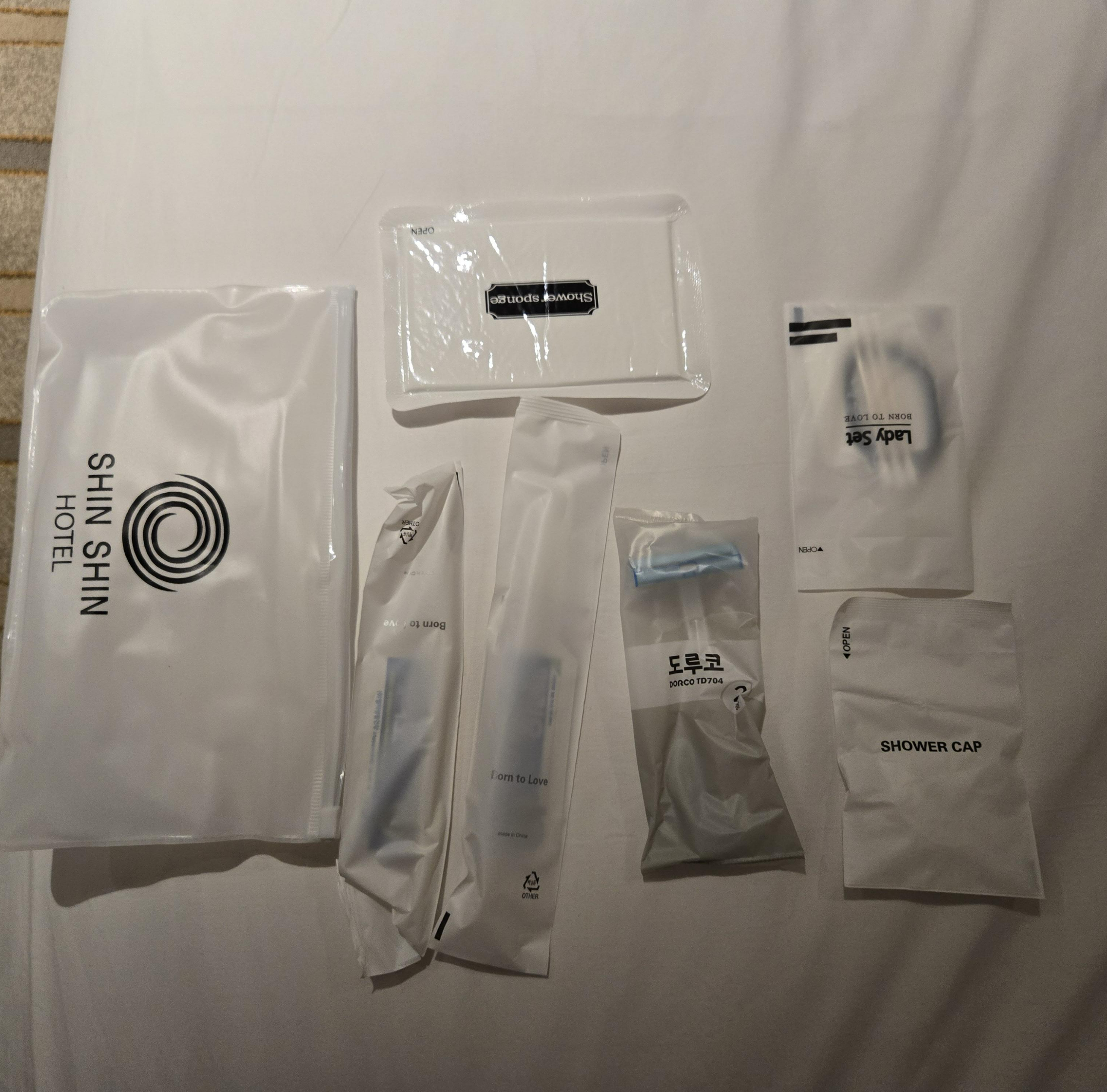 천 원짜리 백 안에 샤워스펀지 / 칫솔 치약 2세트 / 면도기/ 샤워캡 / 샤워스펀지 / 머리끈 / 면봉 이 들어있는데 예전에 급하게 숙소를 잡고 편의점에서 4,000원가량 하던 여행용 칫솔 세트를 샀던 걸 생각하면 아깝다. 여행용 칫솔을 이후에 쓰면 다행이지만 보통 급하게 산 것들은 내 입 속 치열에 잘 안 맞아서 얼마 못 쓰고 버리는 일이 많았기 때문이다. 이제라도 알았으니 다음 서귀포 출장으로 신신호텔에 묵게 되면 꼭 일회용품 구매를 해야겠다.
