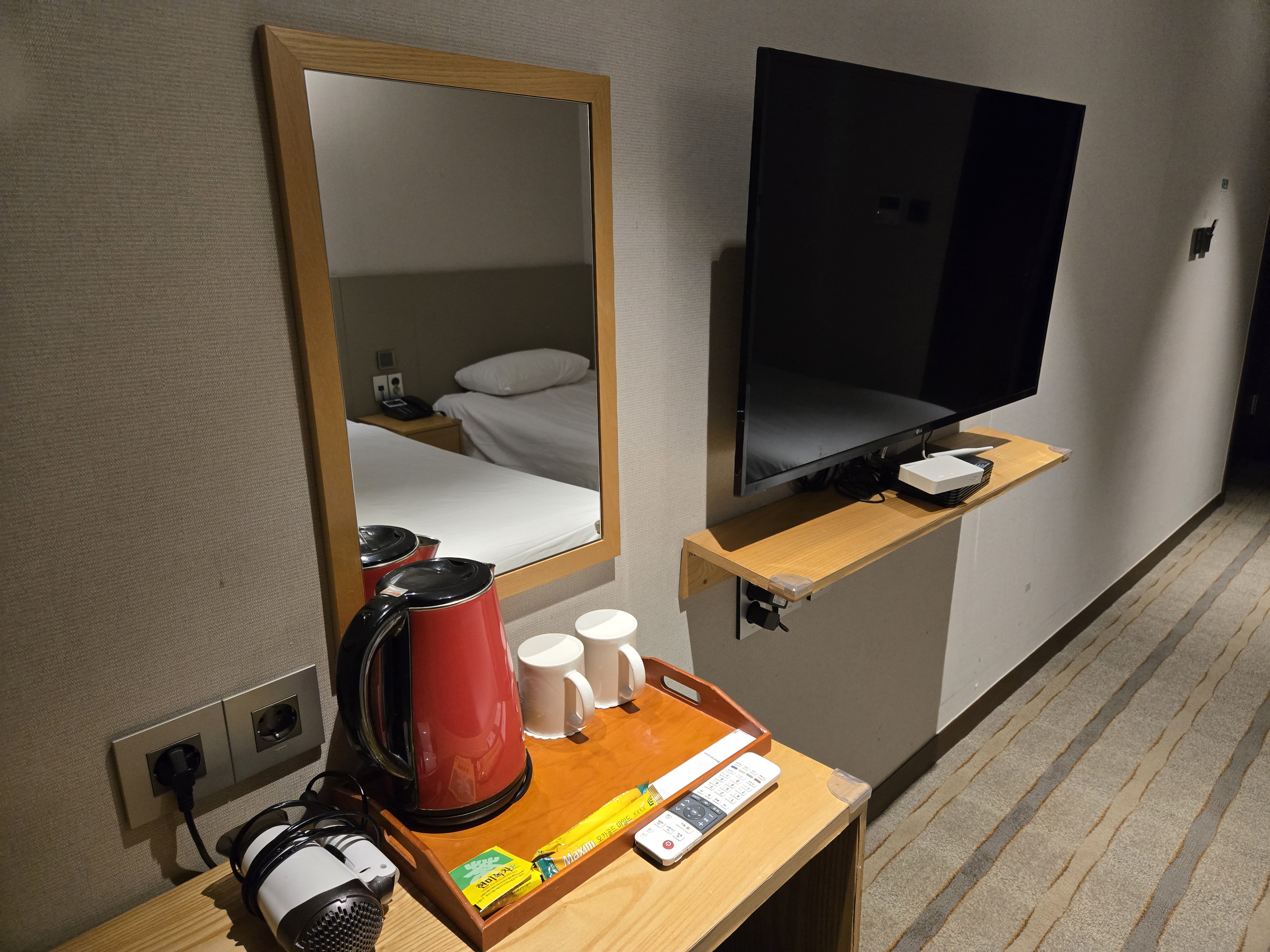 참고로 나는 이 날 제일 저렴한 특가 방으로 묵었기 때문에 다른 방은 어떤 지 모른다. 하지만 작다는 느낌은 들지 않았다. 늦은 예약과 늦은 체크인 때문에 좋은 방은 다 나가서인지 야경은 딱히 볼 수는 없었고 서귀포의 주택가가 바라보이는 방이였다. 입구에 카드키를 꽂으면 전체 조명이 작동되고 에어컨도 자동으로 작동되는데 여담으로 서로를 배려하던 일행과 나는, "더워서 에어컨을 켰나?" 하고 추워도 춥다고 말을 못 하고 에어컨을 밤새 키고 잤다. 아침이 되고서야 서로의 오해를 풀 수 있었다.