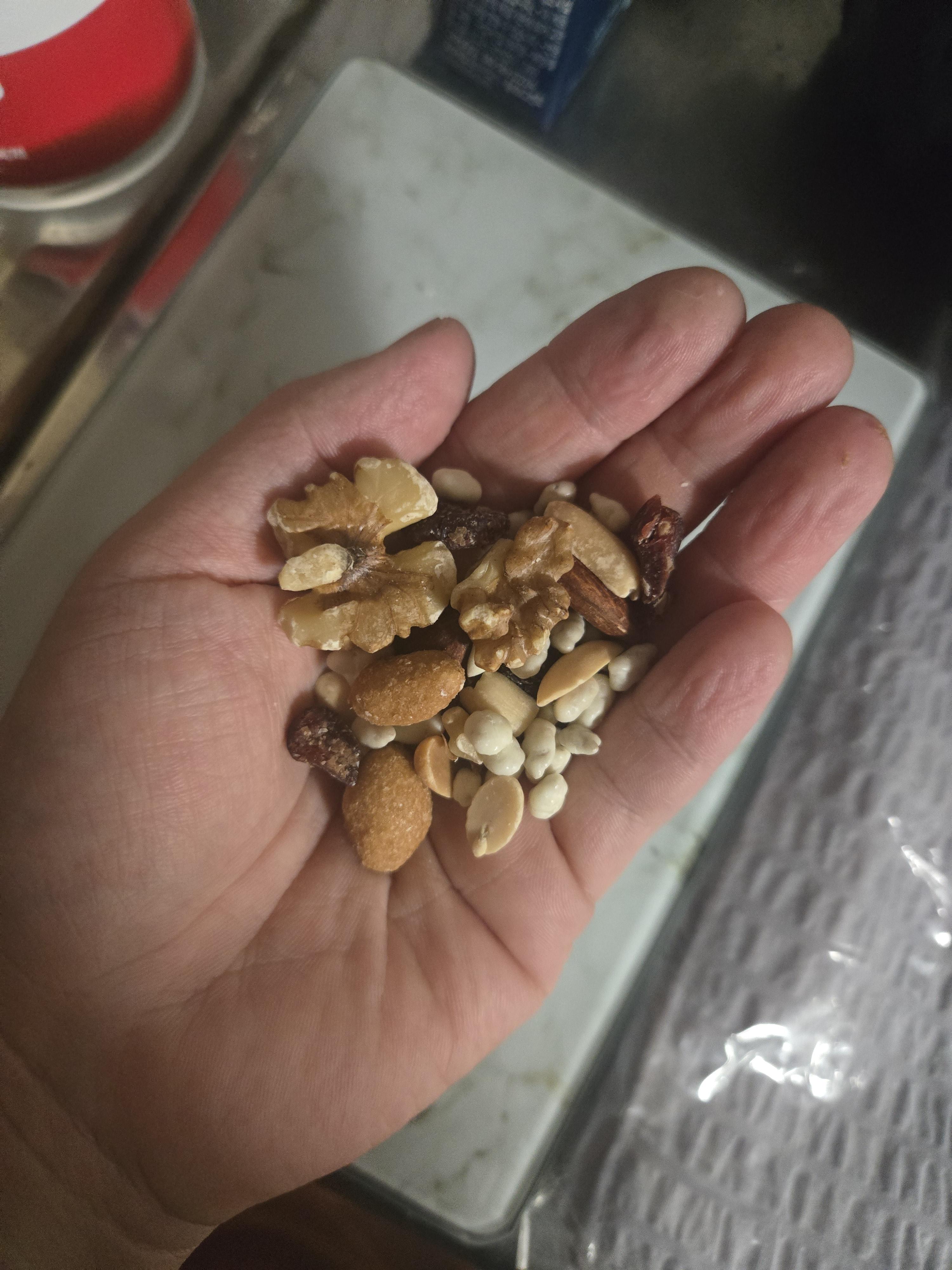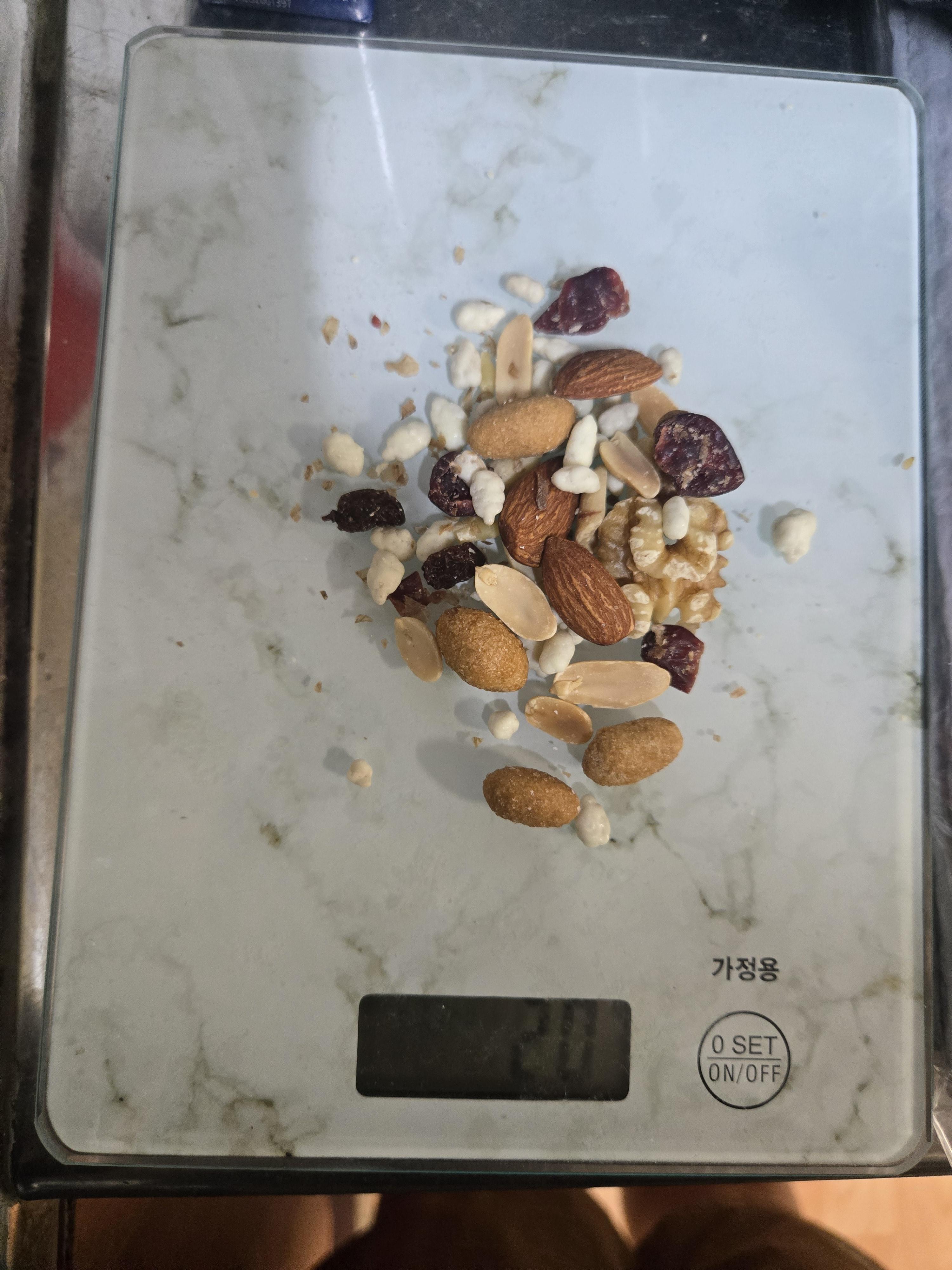 절대 과다 섭취는 금지야. 칼로리가 엄청 높거든. 나처럼 등짝 맞기 싫으면 소분된 걸 사 먹거나 소분해서 먹거나 해야 해. 하루 섭취 권장량이 30g인데 한 줌 정도의 양인데 난 한 줌이 두 줌 되고 세 줌 되고 네 줌 되더라고. 가정용 주방저울이 있다면 30g을 재서 먹기를 추천해. 정말 '에게?' 하는 양인데 그 양이 적정량이야. 딱 이만큼이야!