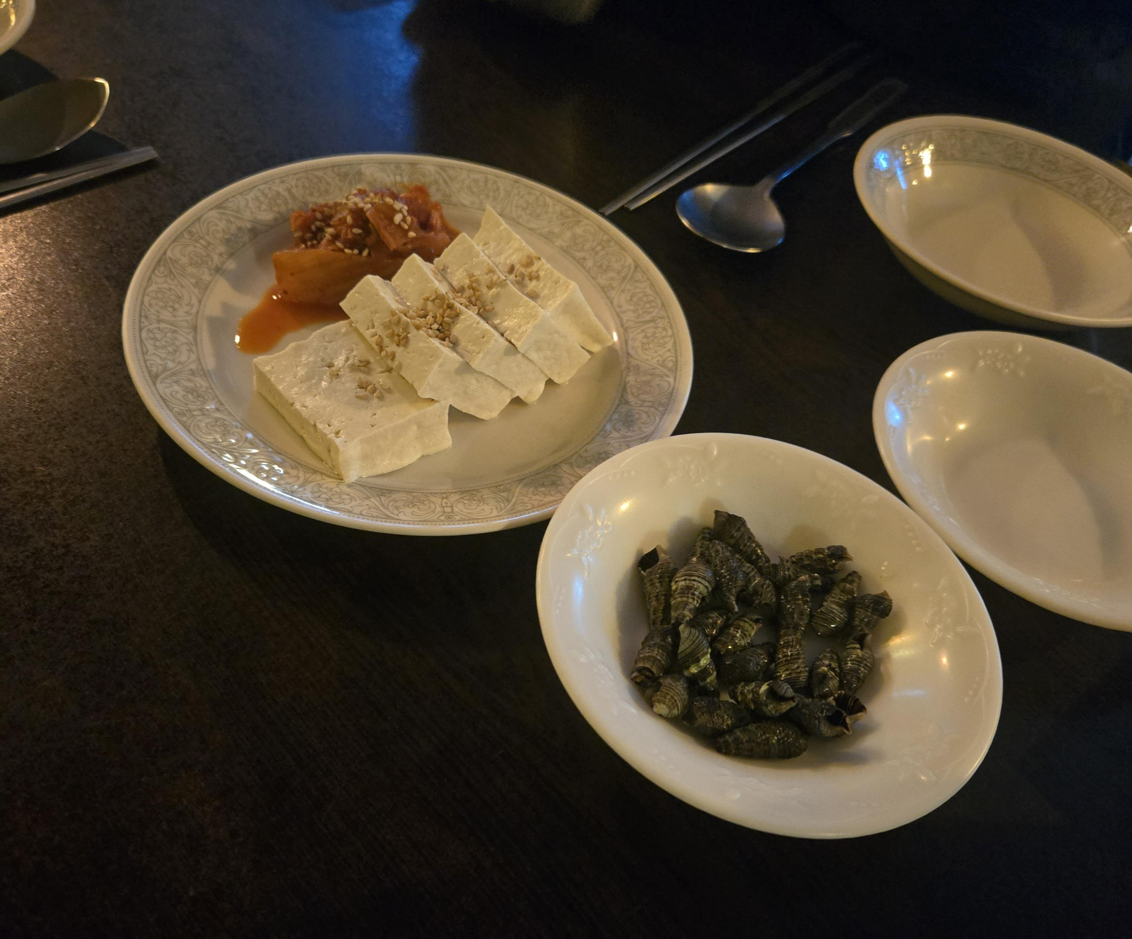 기본으로 나오는 두부김치 / 고동(다슬기) 다슬기는 초등학교 운동회 때 몇 백 원 주고 종이컵에 사서 먹었었는데 그 맛이 가끔 생각나서 오일장 가면 냉큼 사서 한 컵을 쇽쇽 비운다. 그리고 물통은 델몬트 유리병. 옛날에는 이게 보리차를 담는 국민템이었단 말이지. 이게 물때가 생기면 얼마나 씻기 어렵고 귀찮았는지에 대해서 아니? 암요. 알다마다요. 3M 초록색 수세미를 담고 젓가락으로 테두리를 긁어댔었지요.