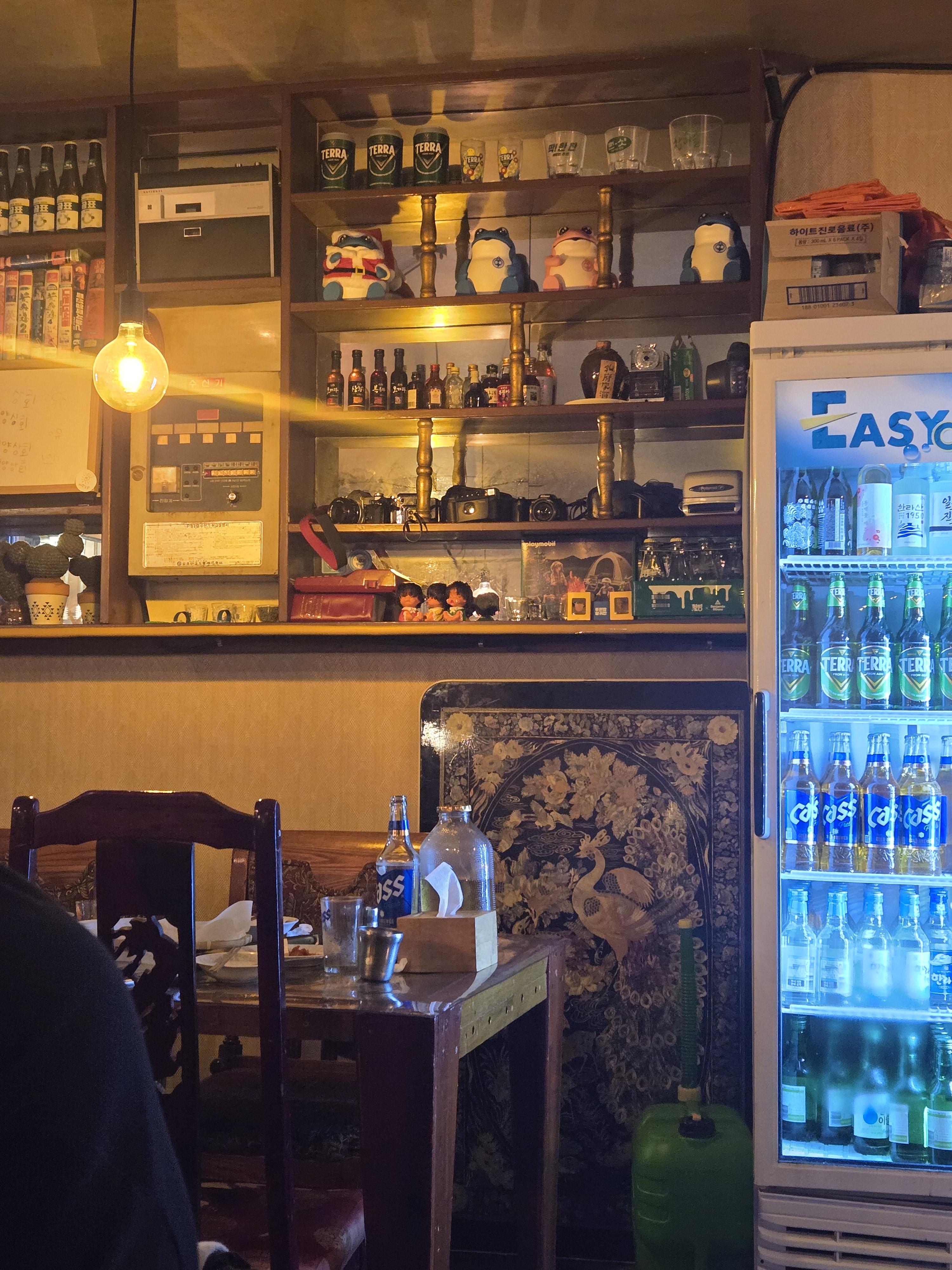 조용한 골목길 사이로 혼자만 북적이는 가게가 있다. 옛 제주에선 '점빵'이라고 불릴 말한 곳. 밖에서 보니 사람들이 제법 차있다. 예전에 젊음이 느껴지는 힙한 공간이었다면 오늘 들어선 이 가게는 '어린 시절을 회상하게 되는' 가게랄까? 70년대생 선배님을 모시고 가게 되니, 옛날 전통혼례 1호셨다. 제주식 3일 결혼잔치를 하셨다는 얘기를 해주시는데 우와 복고 인테리어 아닐까 봐. 손님까지 복고 손님이 오셔버렸네?😊 내가 방문한 이날은 마침 연령대가 좀 있으신 분들이 많이 계셨어서 밖에 잠깐 바람 쐬러 나갔을 때 어린 친구들이 "여기 연령대가 좀 있네?"라고 갸우뚱거리면서 들어갔다. "이보게 친구, 나 아직 어려. 영 포티 young forty 야!" 속으로 외쳐봤다. 그런데 솔직히 오늘은 직장인 3040이 많은 것 같다. 네들이 뭘 알겠니? 이거 다 나 어릴 적 할머니집에 있던 물건인데. 봐본 적이 있겠니? 네들은 박물관 오는 느낌 아니겠니? 나는 외할머니집 오는 기분이 든다고!