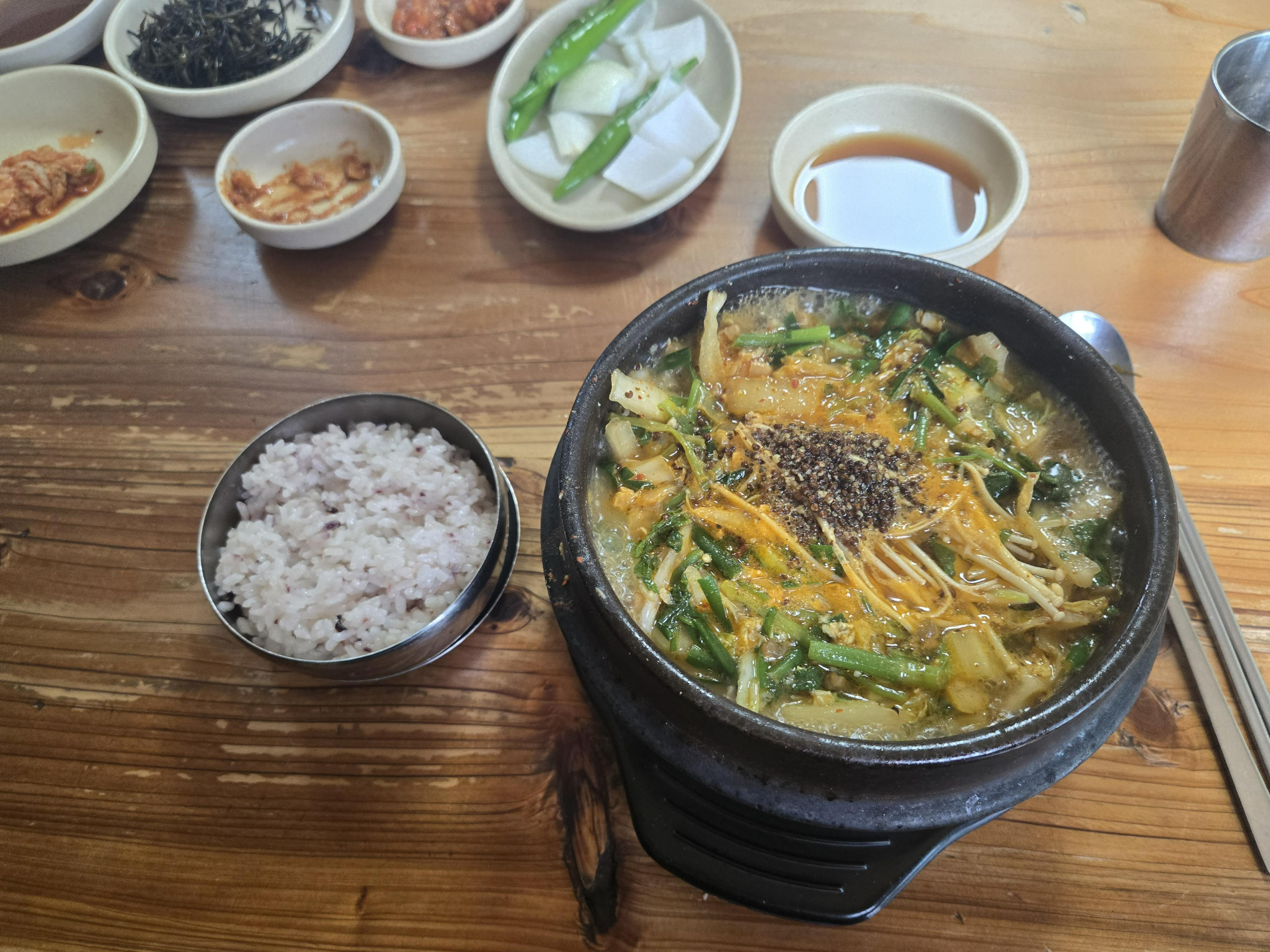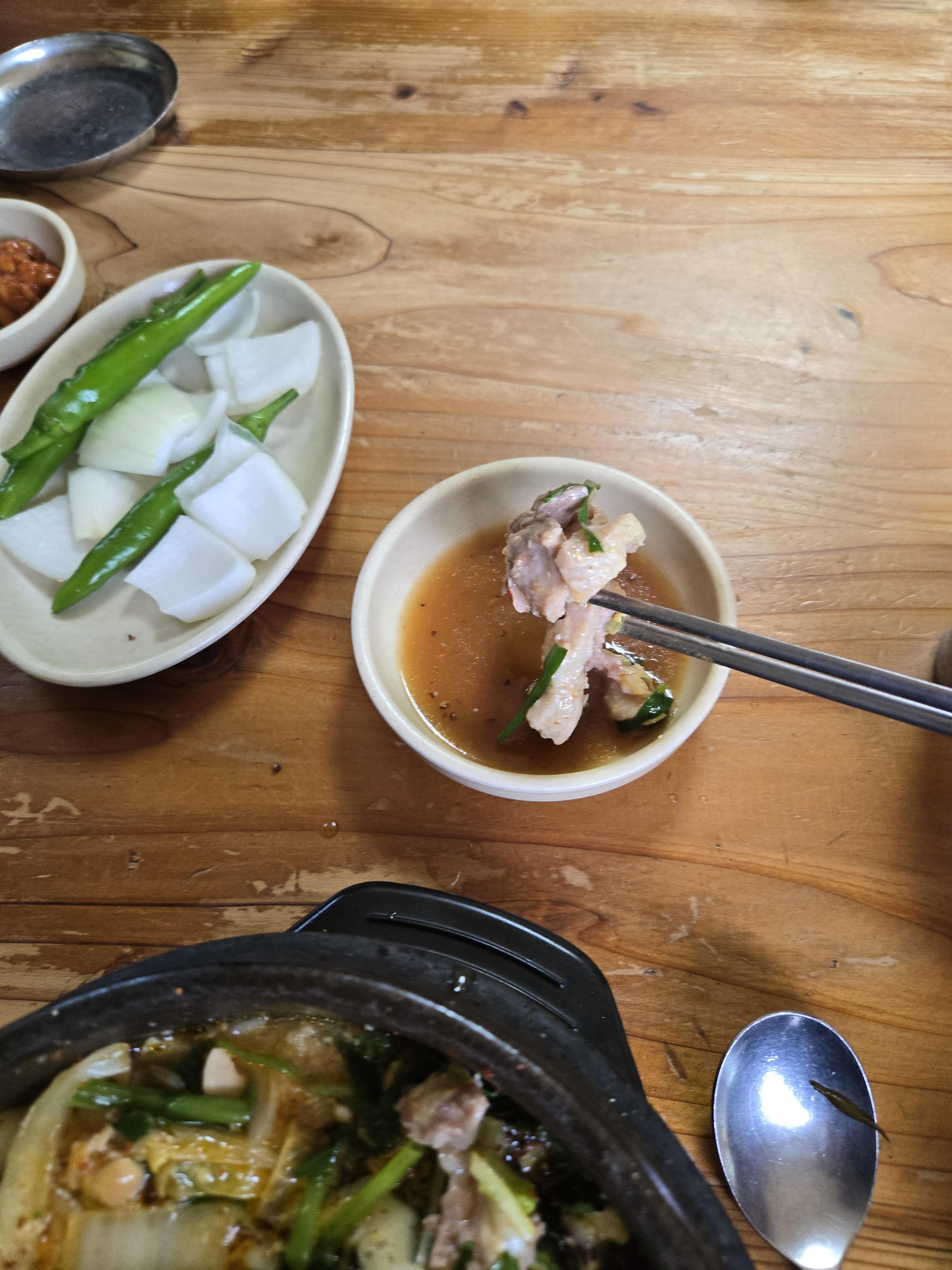 양파/고추/김치/톳무침/깍두기 기본으로 준비되어 나왔고. 추가로 필요하면 셀프코너에서 떠오면 된다. 어머님께서 정성껏 만드신 반찬이니 남기지 않을 만큼 양껏 떠드시라는 문구가 붙어있다. 들깨가루가 더 필요하면 직원분께 말씀드리면 더 가져다 주신다.
