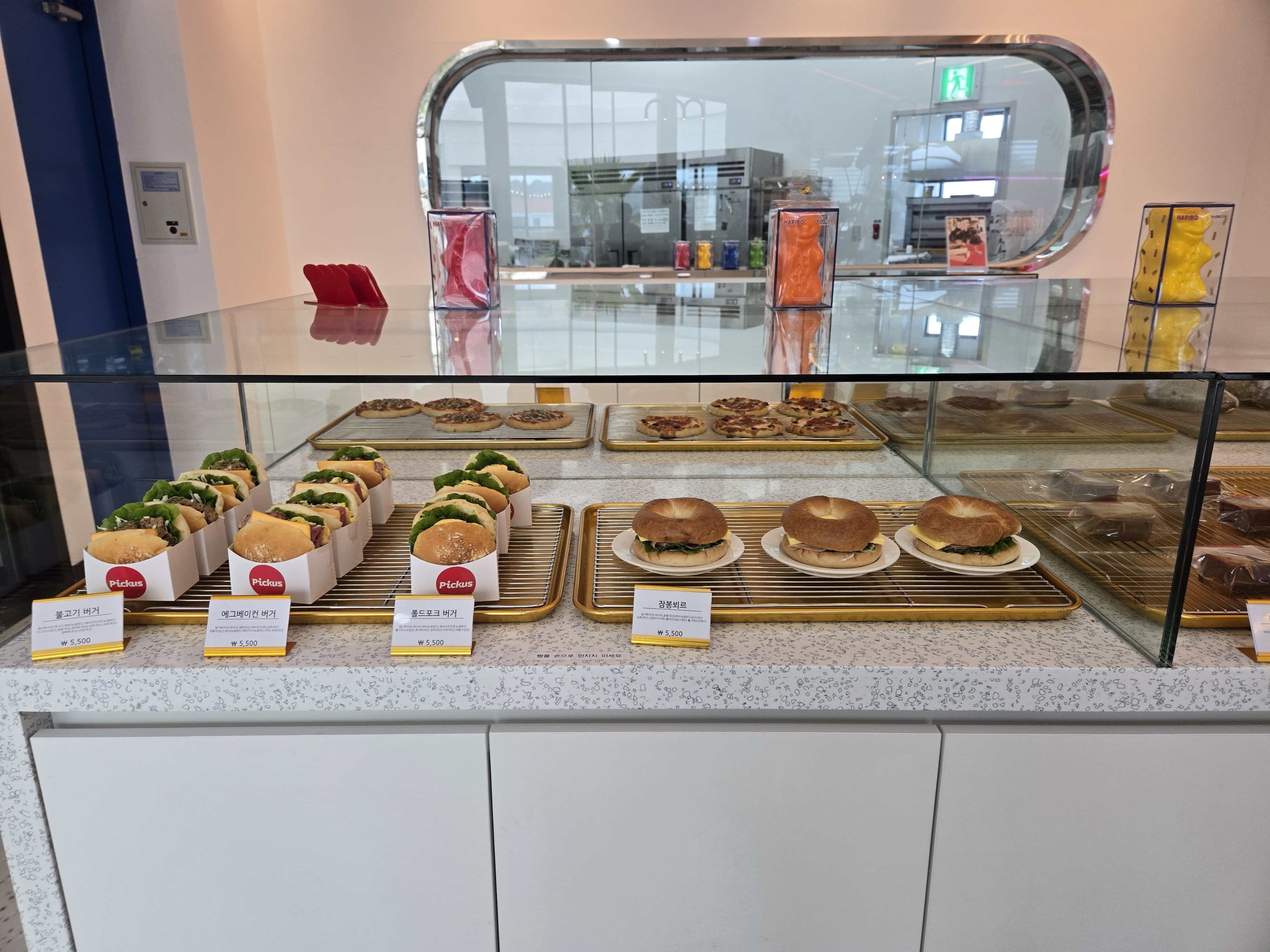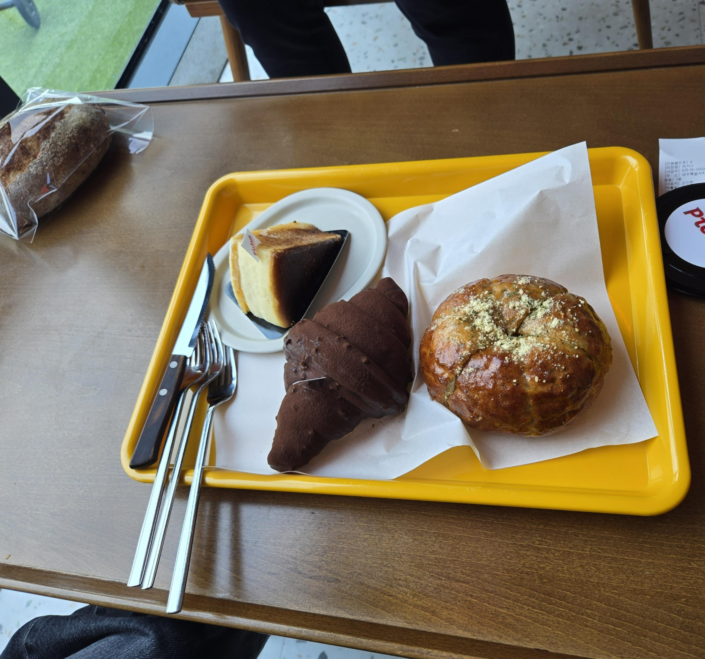빵 쟁반/ 빵 집게 들어서 먹고 싶은 빵들을 골라본다. 빵 종류가 그렇게 많다고는 할 수 없지만 적은 종류도 아니다. 이 정도면 충분하지! 밥도 먹고 왔는데. 다 먹어보고 싶지만 그래도 꼭 먹고 싶은 것만 추려내서 쟁반에 담는데 가격대는 조금 나간다고 생각했는데 카운터에 가니 제주도민은 10% 할인이라고 적혀있는게 아닌가. 역시 제주도민은 신분증을 꼭 챙겨야 한다. 모바일 신분증 딱 꺼내서 제주도민 인증받고 10%할인까지 받으니 꽤 매력적인 가격인데? (이 정도면 관광지치고 비싼건 아니야. 어떤 곳은 아메리카노가 8,000원이나 한다고) 빵4개를 계산하고 커피 3잔을 주문하고 자리에 앉아서 커피를 한 잔 딱 들이키는데 이 원두 기억하겠다. 커피가 맛있다. 커피만 마시러 올만 하겠다.