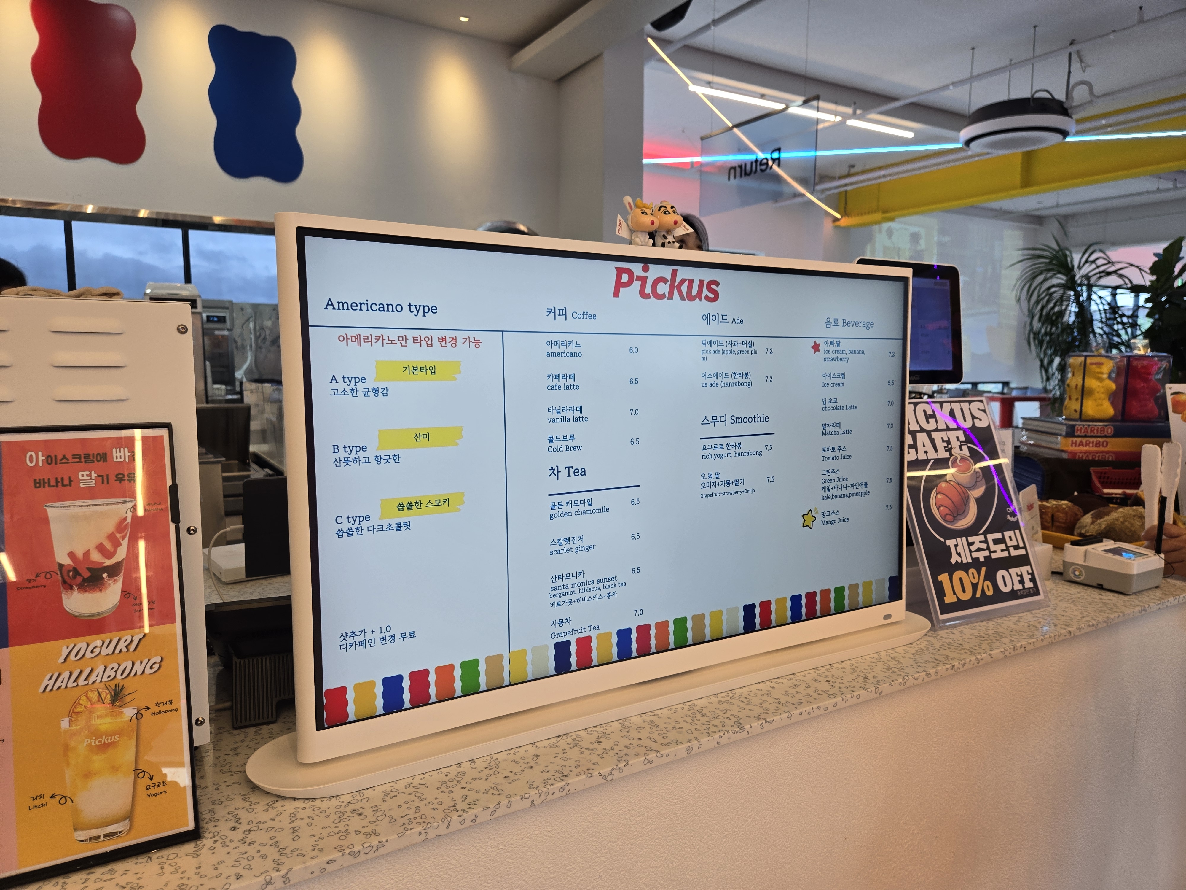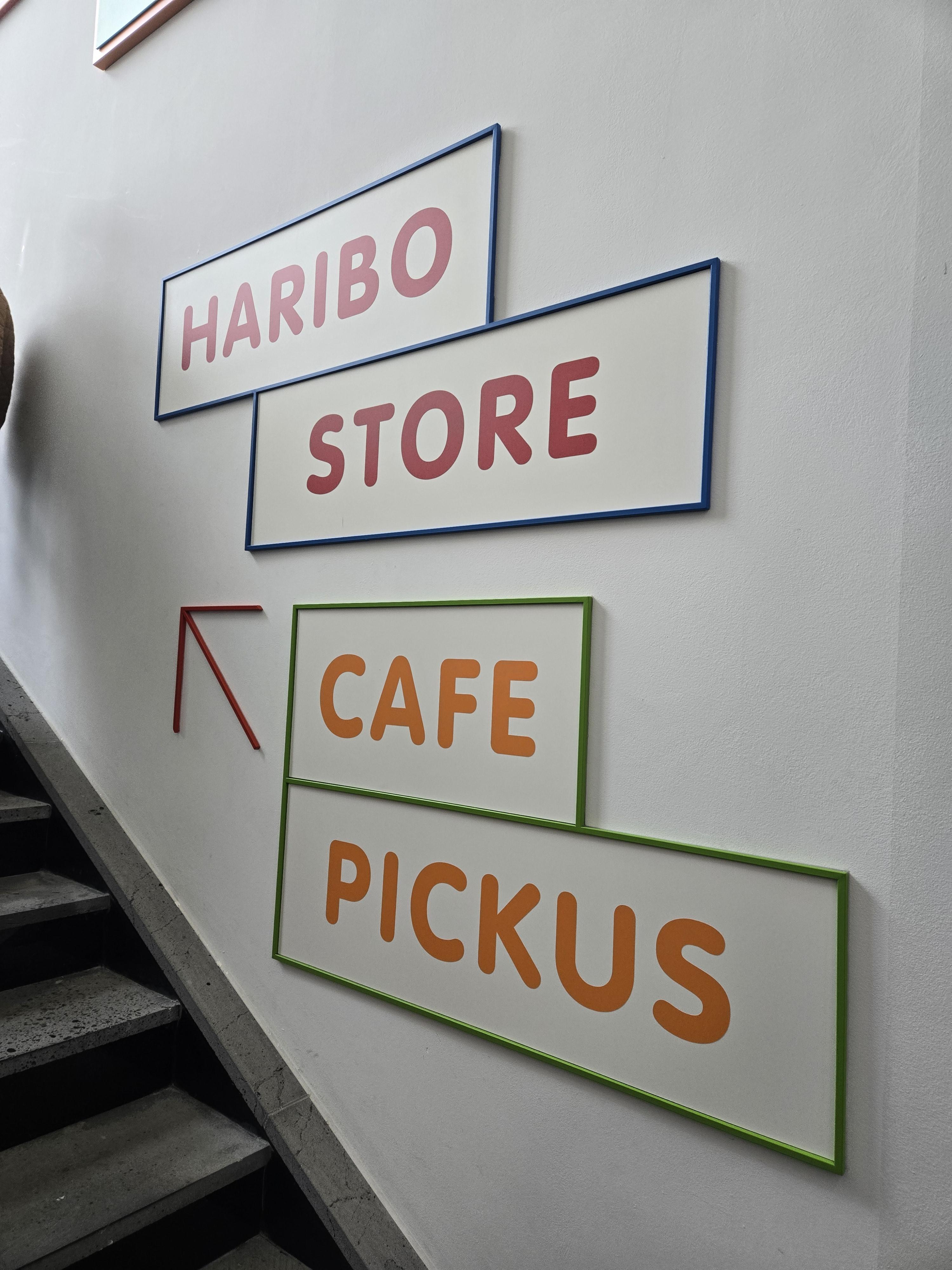 2층으로 올라서면 한 켠에는 하리보 스토어가 있고 다른 한 편에 카페 피커스가 있다. 카페도 하리보 콜라보 인테리어를 볼 수 있는데 여기저기 레고처럼 보이는 알록달록 한 것들이 다 하리보 무늬다.