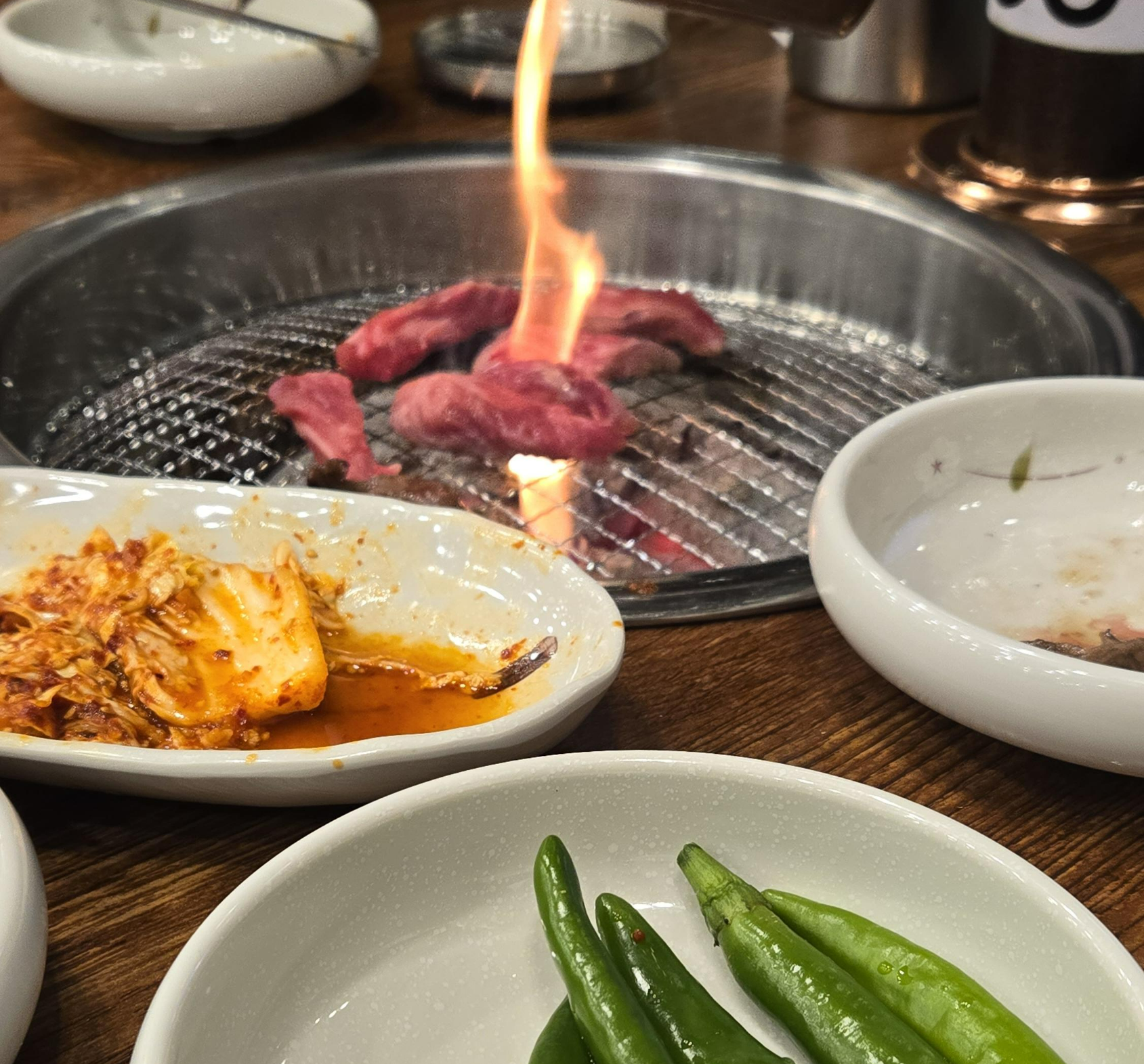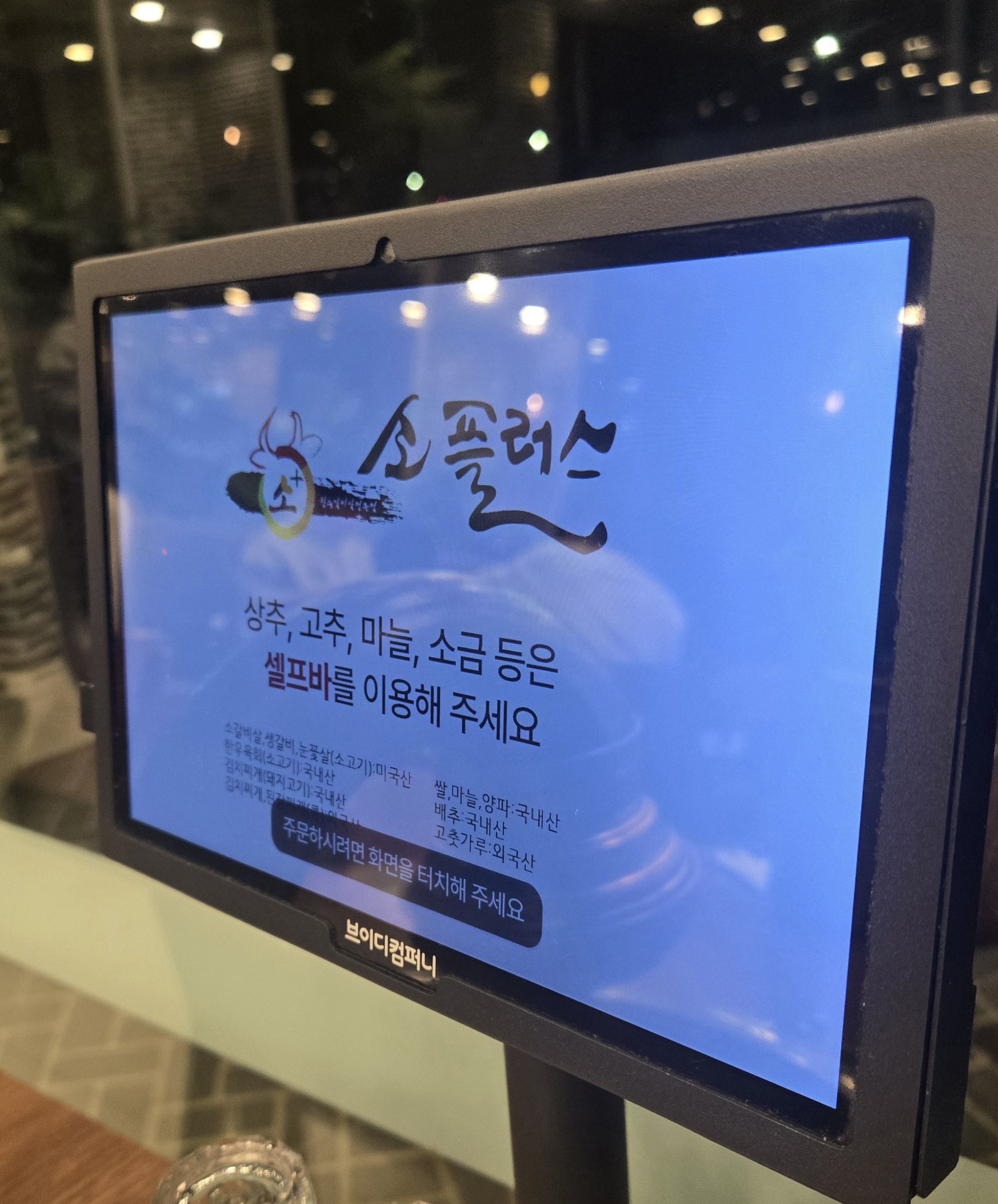 기본찬이 준비가 되고 셀프바에 [앞접시/ 양파 / 상추 / 마늘 / 소금 / 참기름 / 양파소스 ]가 준비가 되어있으니 필요하면 셀프로 이용하면 된다. 그 외에 반찬은 호출벨도 있지만 테이블 오더로 불판교체 / 샐러드 추가 / 김치 추가 를 해주는 것이 직원들도 좋고 이용하는 사람 입장에서도 사람을 호출해서 주문하는 것보다 시간과 인력이 절약되서 좋은 것 같다.
