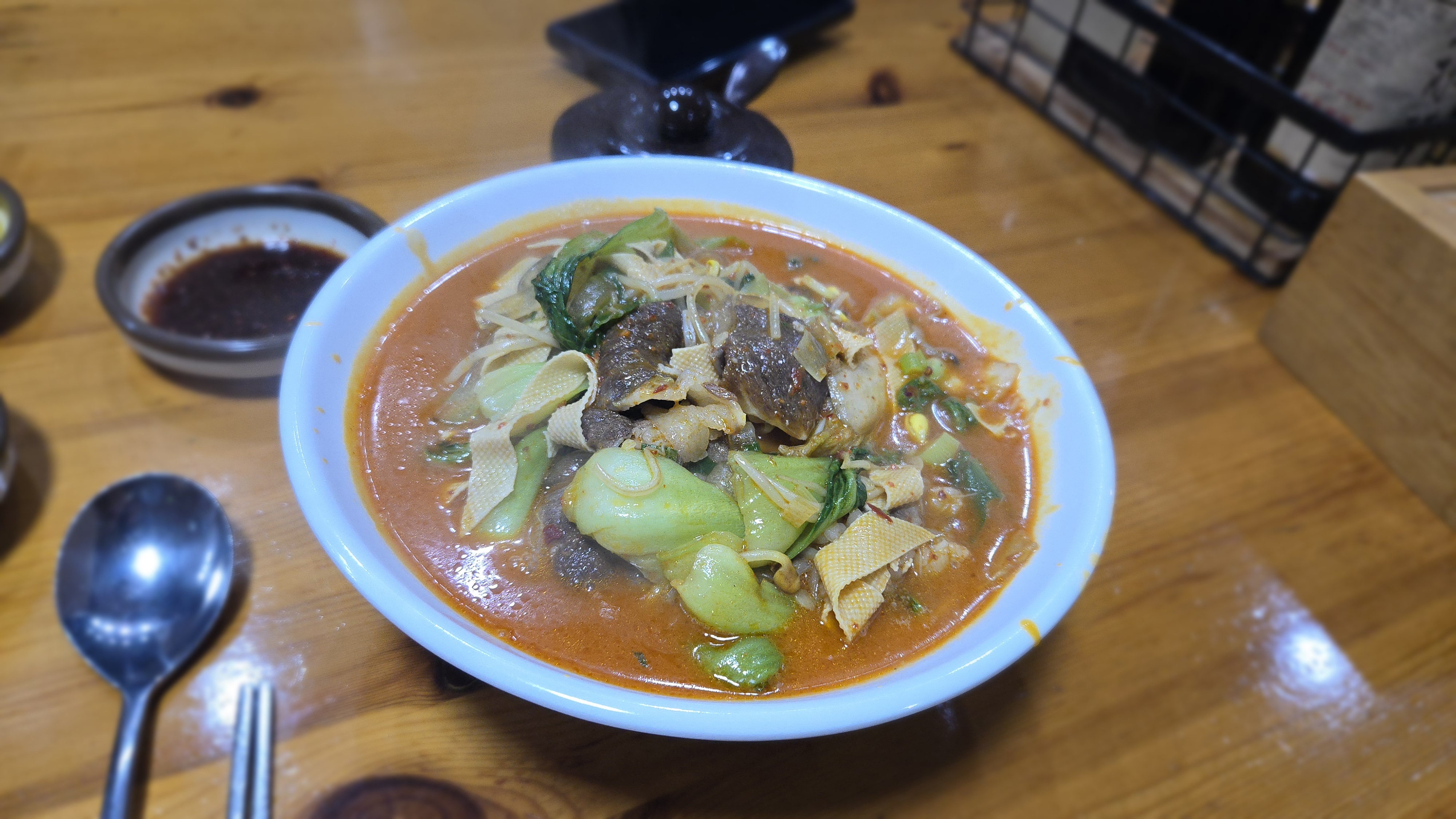 우리는 지금껏 친절한 마라탕만 먹어왔다. 고수의 첨가 여부는 물어봐주시질 않는다. 얄짤없이 고수가 들어갔다. 같이 동행한 친구가 고수를 잘 못 먹는데. 덕분에 나는 개꿀. 한 그릇 마라탕을 완봉했다. 땅콩향이 은은하게 퍼지면서 입이 조금씩 얼얼해지는 이 느낌 때문에 내가 마라탕을 못 끊는다. 마라탕이라는 게 우리나라 김치찌개처럼 이 집, 저 집 맛이 다르듯. 내가 지금껏 먹어왔던 마라탕과 같으면서 다른 느낌? 나쁘지 않다. 매운맛도 적당하다.
