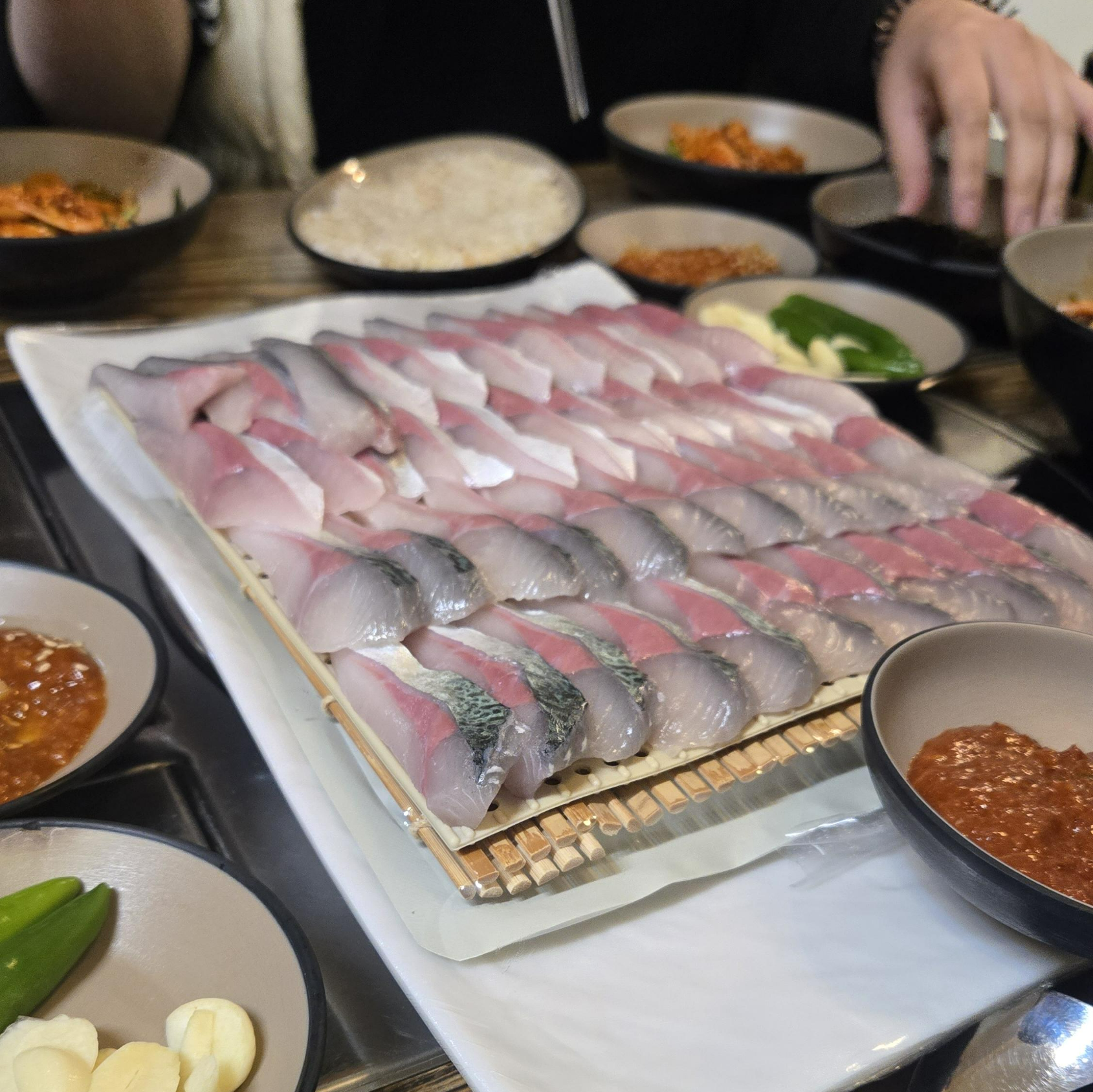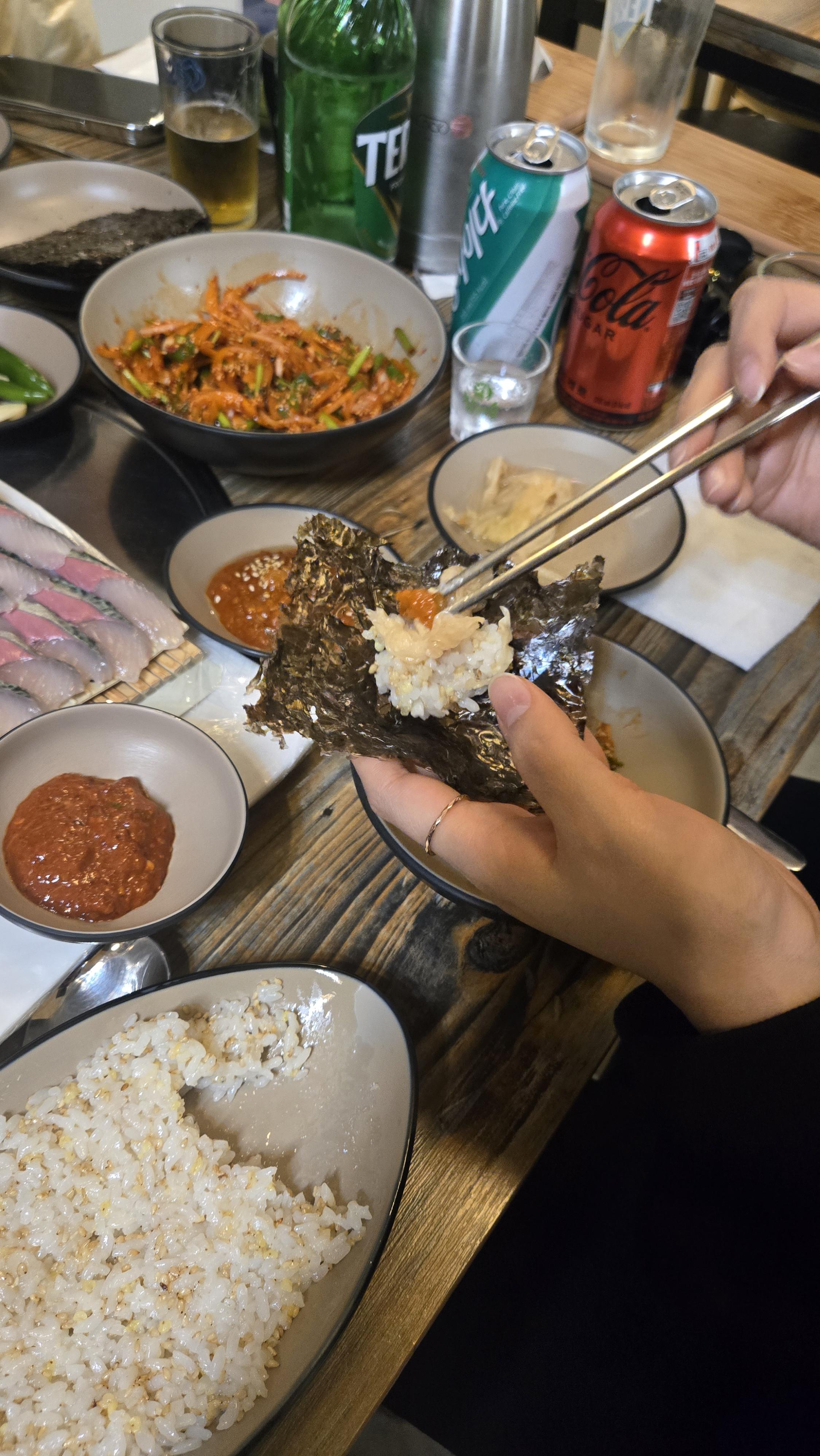 각자 저마다의 방식으로 고등어회를 먹어보는데 가게에서 알려준 방식을 최대한 따라해보자. 쌈장에 찍어도 맛있고 김에 양념장 야채에 싸 먹어도 맛있다. 백김치에다 싸 먹어도 보고, 갈치속젓과 마늘에다 싸 먹어도 맛있었다. 회의 양이 많으니 어떤 방법으로 먹어도 넉넉하다. 고등어회도 두께가 있다 보니 입안에서 오물오물 씹다 보면 곁들인 재료에 따라 입안에서 느껴지는 풍미. 이것은 뭐가 최상의 마리아주라 말할 수 없다. 이 것이야말로 저마다의 매력이 있다는 말이로구나. 난 이제까지 양파에 간장 양념장이 고등어회의 정석인줄 알았는데. 이렇게 또다른 고등어회의 매력을 배워본다.