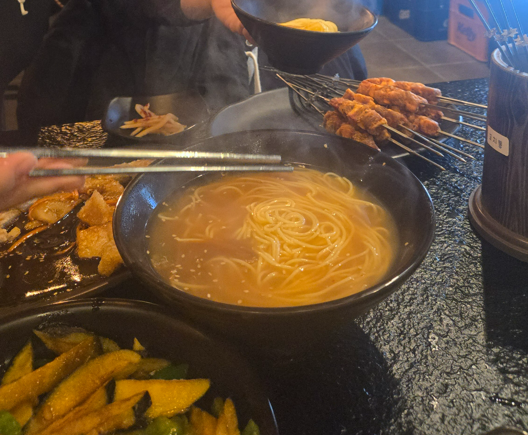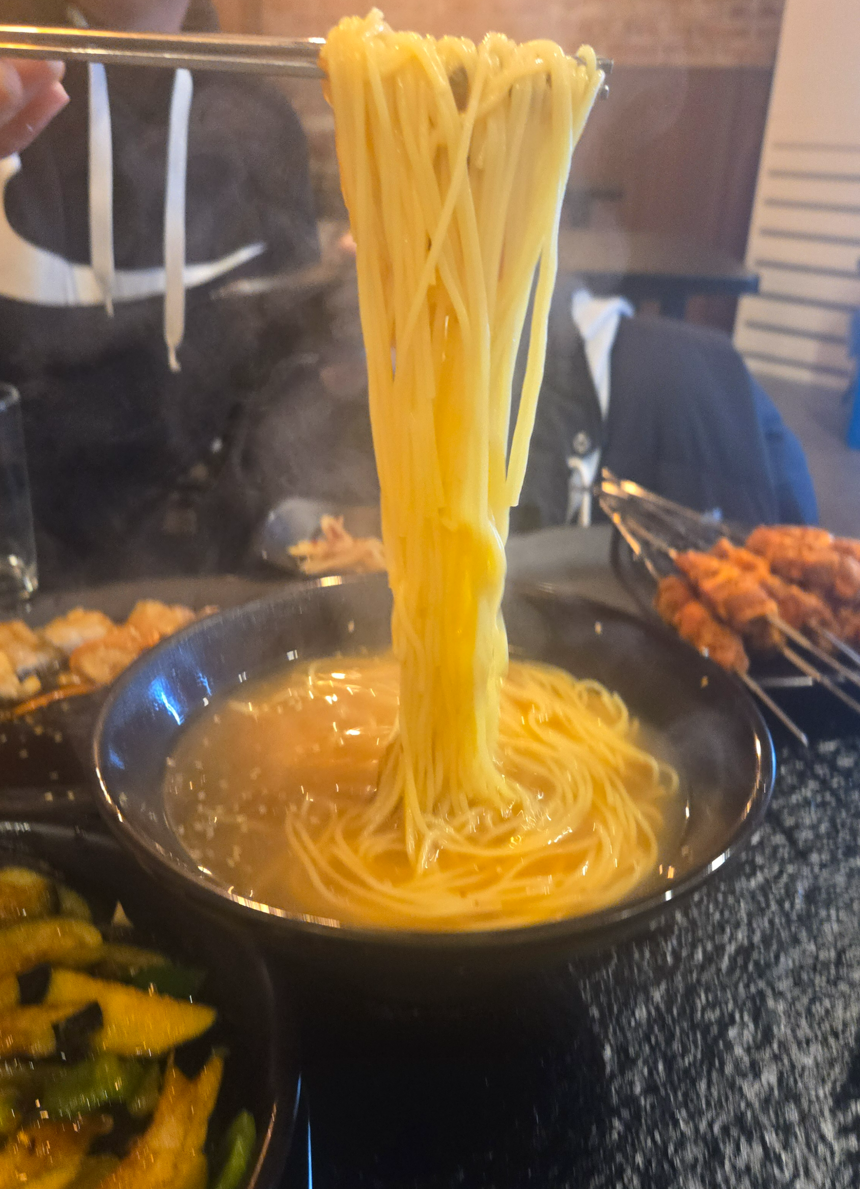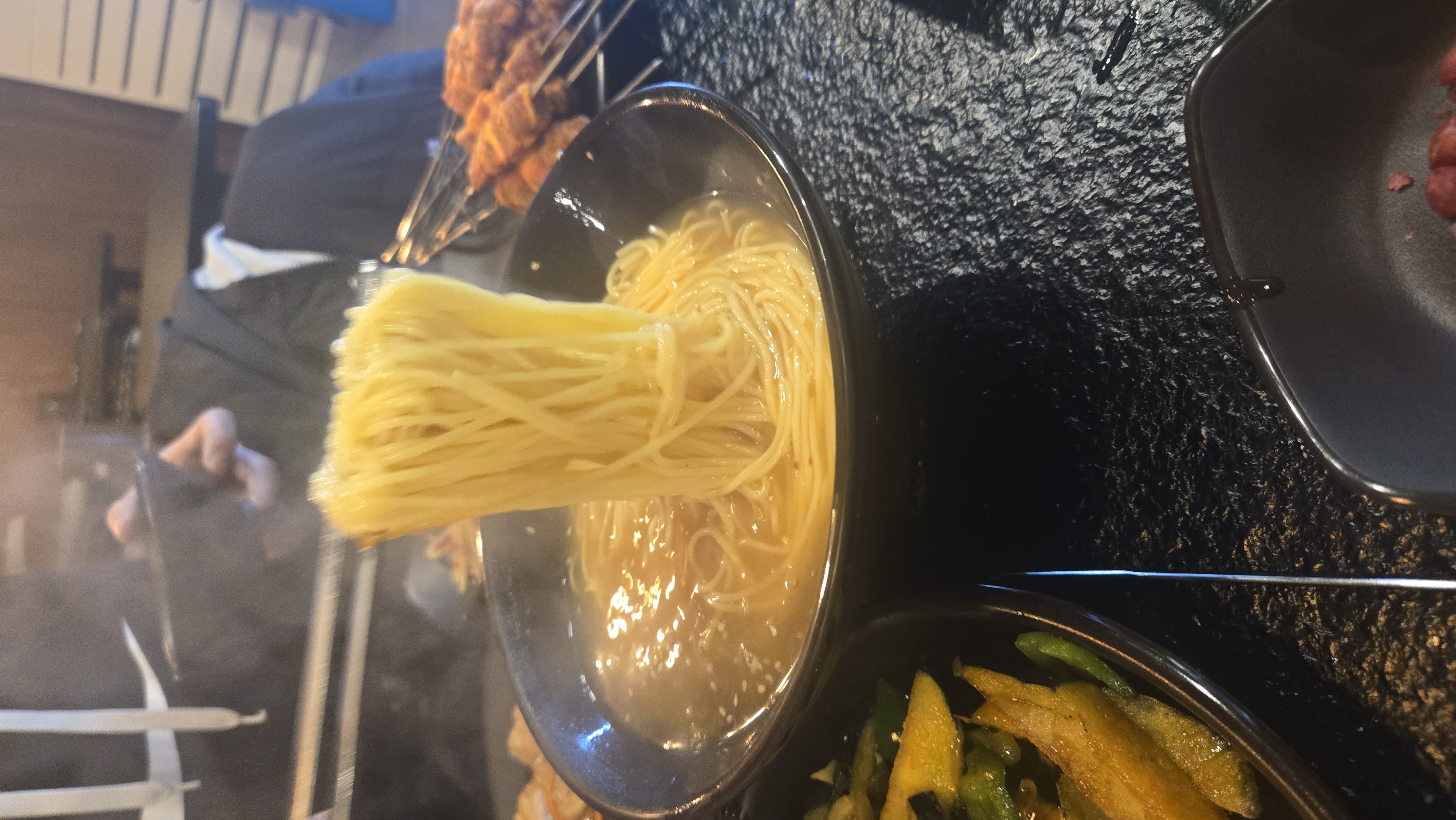 보통 온면이라 불리는 옥수수국수. 양꼬치집에 필수 메뉴 중 하나라고 하는데 와. 진짜 나는 메뉴판을 보면서 느끼는 게 필수메뉴가 아닌 게 없어. 건두부무침/마장양장피/오이무침 이거 다 양꼬치집 필수메뉴지. 고민하다가 온면을 주문했는데, 온면도 마라탕과 마찬가지로 집집마다 맛이 다르지만 온면은 특히나 집 주인장마다 맛에 큰 차이가 있다. 풍양양꼬치 옥수수국수를 표현해 보자면 강한 자극 없이 부드러운 따뜻함이라 할까? 짜지 않으면서 삼삼하니 간이 딱 알맞고 추운 날씨에 내가 소주는 먹지 않지만 소주 안주로 딱이라는 그 국물!