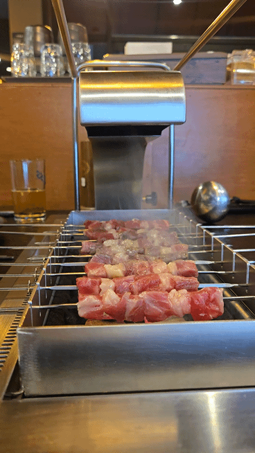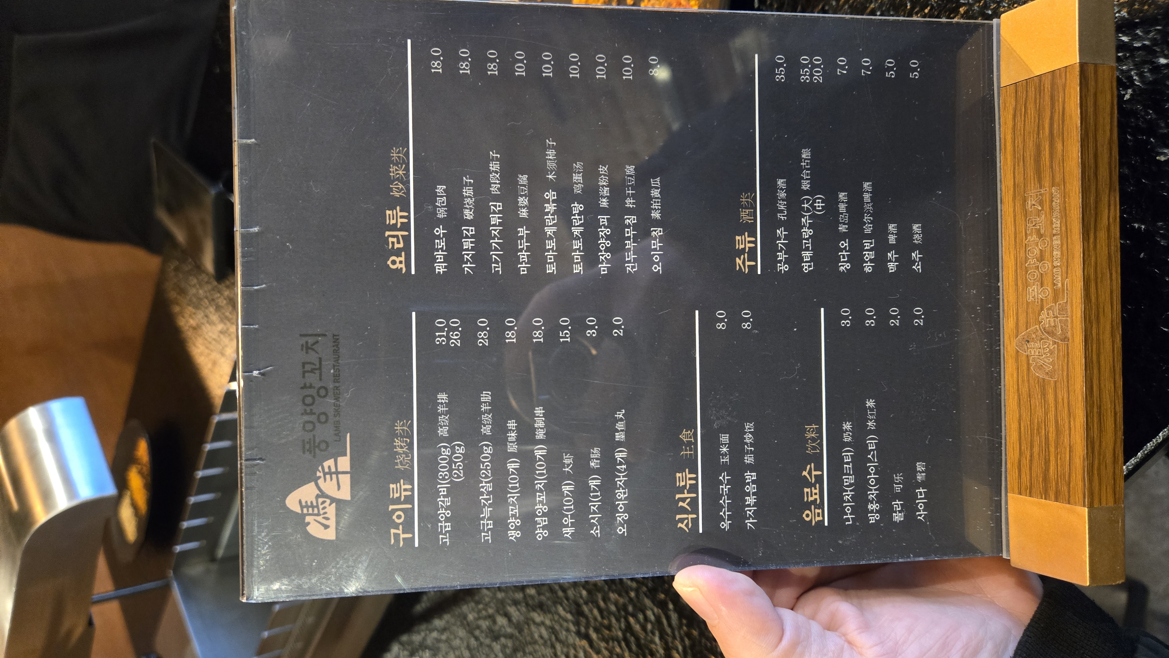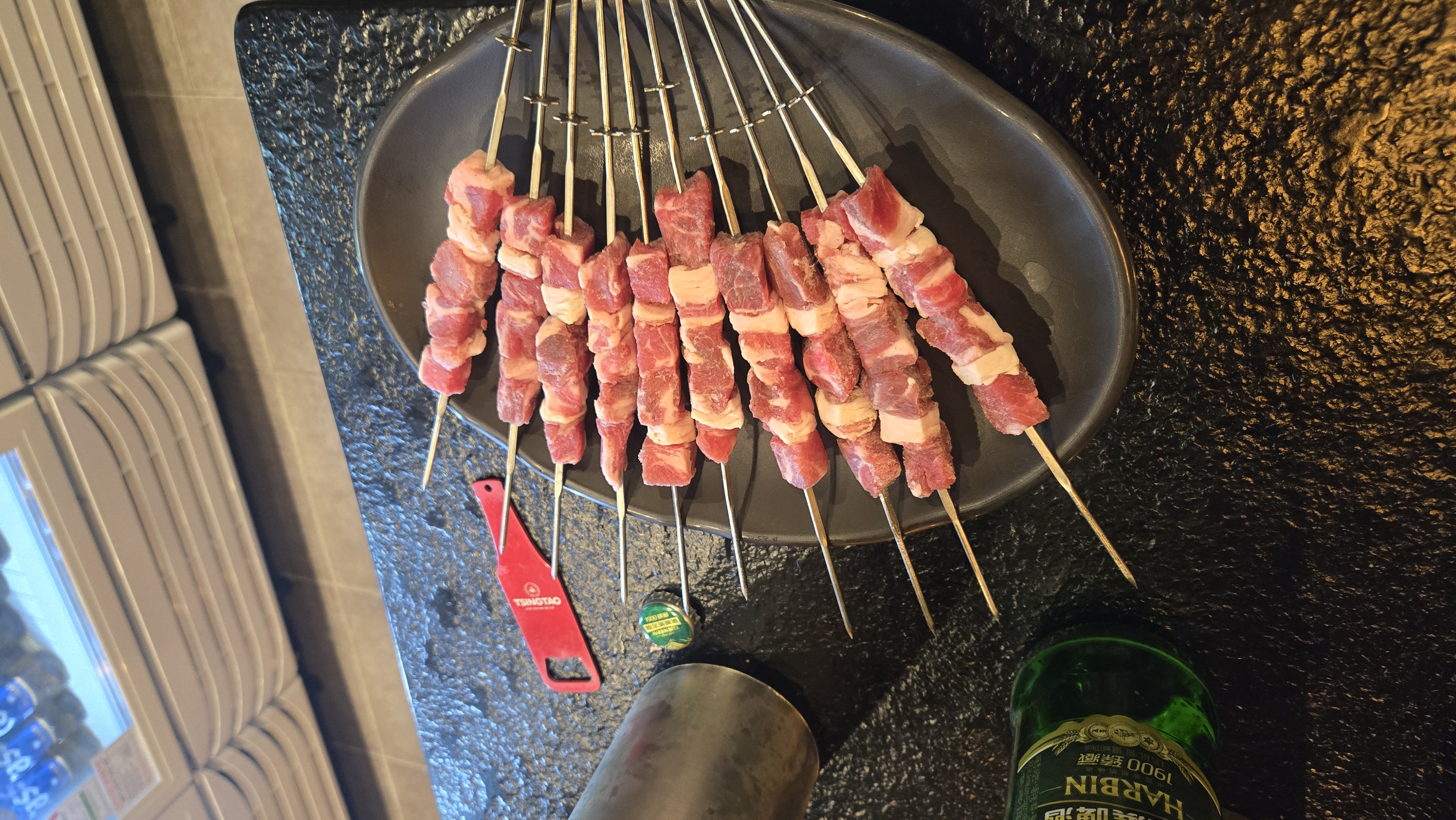 말 그대로 오픈한지 얼마 되지 않은지, 솔직히 이렇게 깔끔한 인테리어의 양꼬치집은 처음이다. (서귀포에서 유명한 양꼬치 맛집으로 확장이전한지 얼마 안되었다고) 동행한 사람들께 폐를 끼칠까 카메라를 최소로 사용하니 내부 인테리어 사진이 위 사진 한 장밖에 없다😂위에서도 언급했듯이, 양꼬치 레스토랑이라 할 만큼 고급지다. 억한 냄새도 나지않고, 중국인 사장님 특유의 왁왁 거리는 고성이 오고 가지 않는다. 그렇게 우리는 5시에 오픈런으로 풍양양꼬치에 입성을 했고, 자리에 앉으려고 하니, 여러 자리가 예약석인듯하여 비어있는 좌석 중 하나를 차지했다. 예약석이 있는 것을 보니 "나중에 우리 회사 회식장소로 이 곳으로 추천해 봄이 어떨까요?" Yes!
