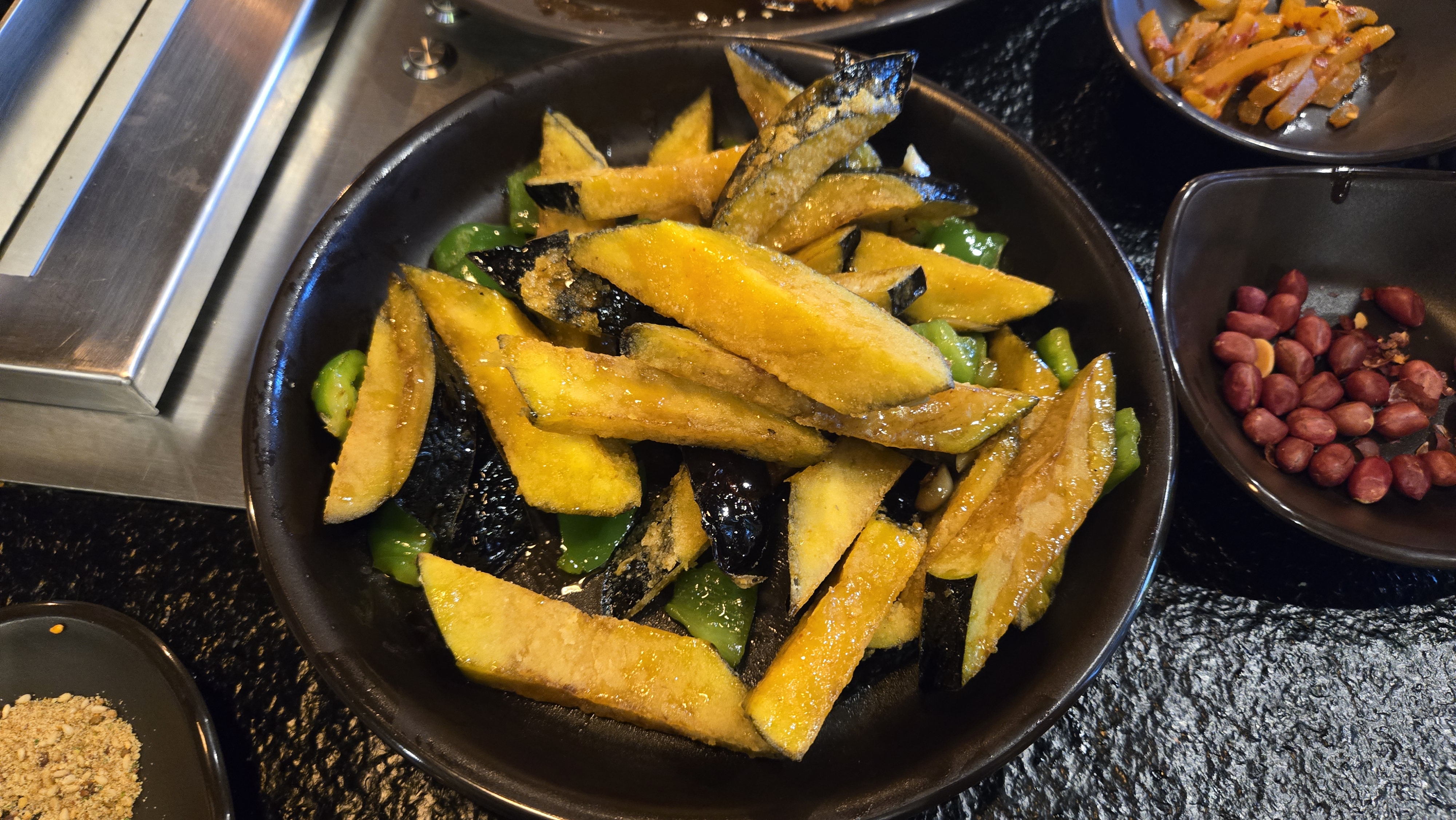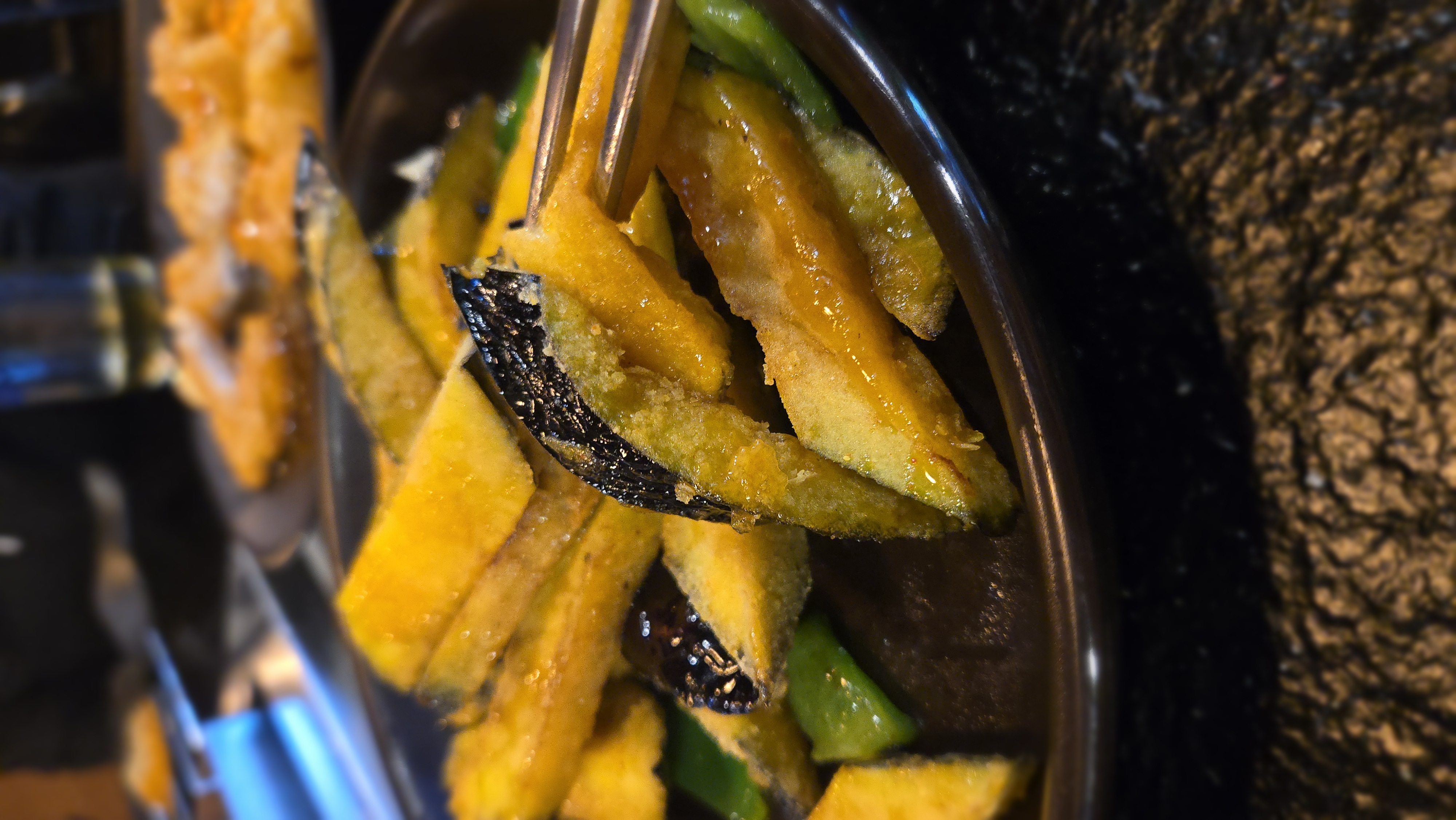 블로그 하다가 메뉴판을 다시 봤는데 내가 어떻게 이 메뉴판을 못 읽었지? 가지튀김 바로 밑에 고기가지튀김이 있었어! 내 선택은 항상 고기서 고기인데 고기가지튀김을 못 보고 가지튀김을 시켰다. 심지어 같은 가격인데. 먹었을 때는 정말 맛있게 먹었는데 고기 가지튀김이 더 괜찮았을 것 같은 이 억울함에 분노에 타이핑을 하고 있다. 하지만 나는 가지도 좋아요. (가지가지한다 정말!) 가지를 좋아함에도 인생 살면서 튀긴 가지는 처음 먹어봤다. 가지를 생으로도 좋아하고 볶아서도 좋아하는데 튀겨서 먹어보는 건 처음이라 젓가락으로 요리조리 잡고 보는데 이게 또 별미네. 피망 향이 같이 풍기는 것이 풋풋해.