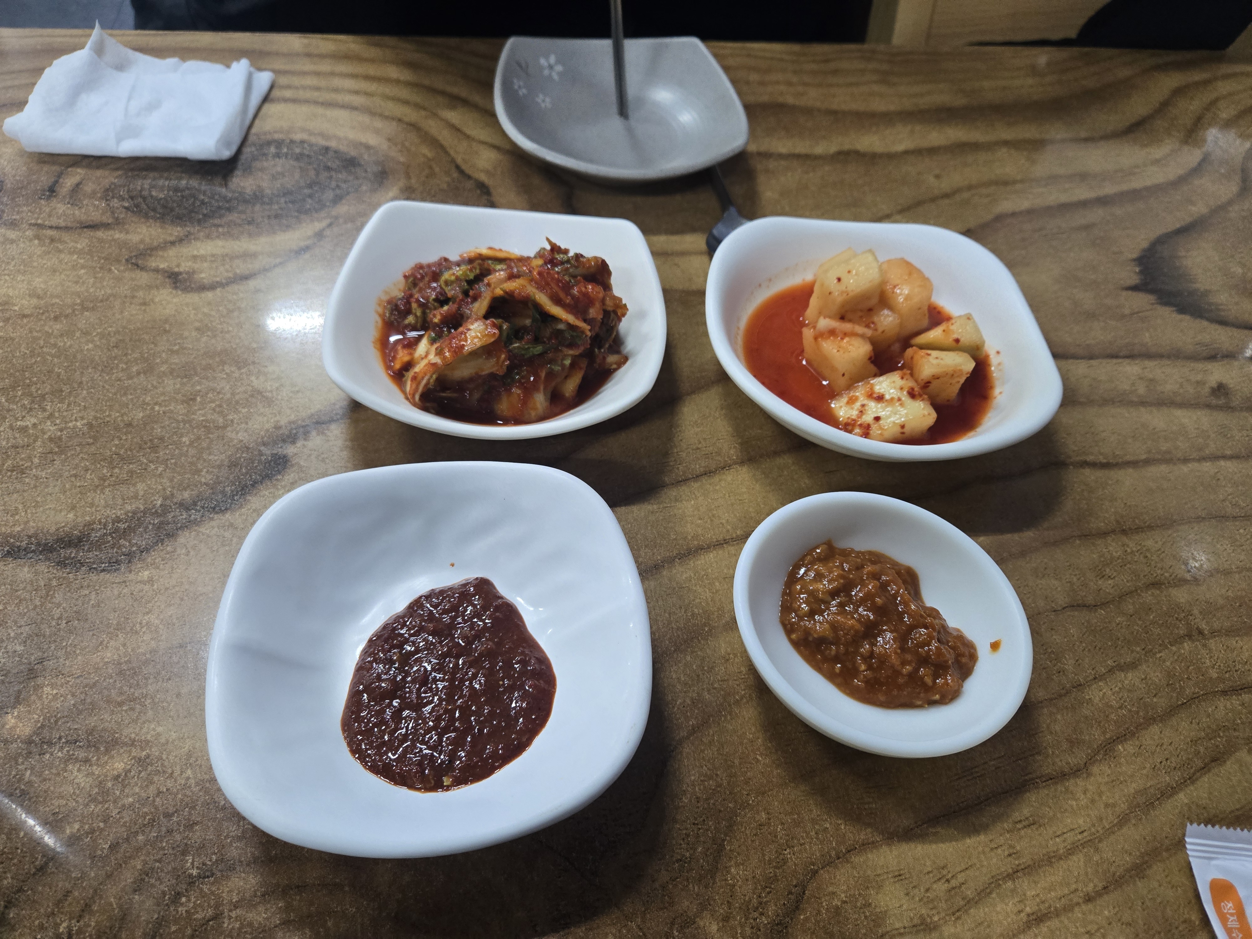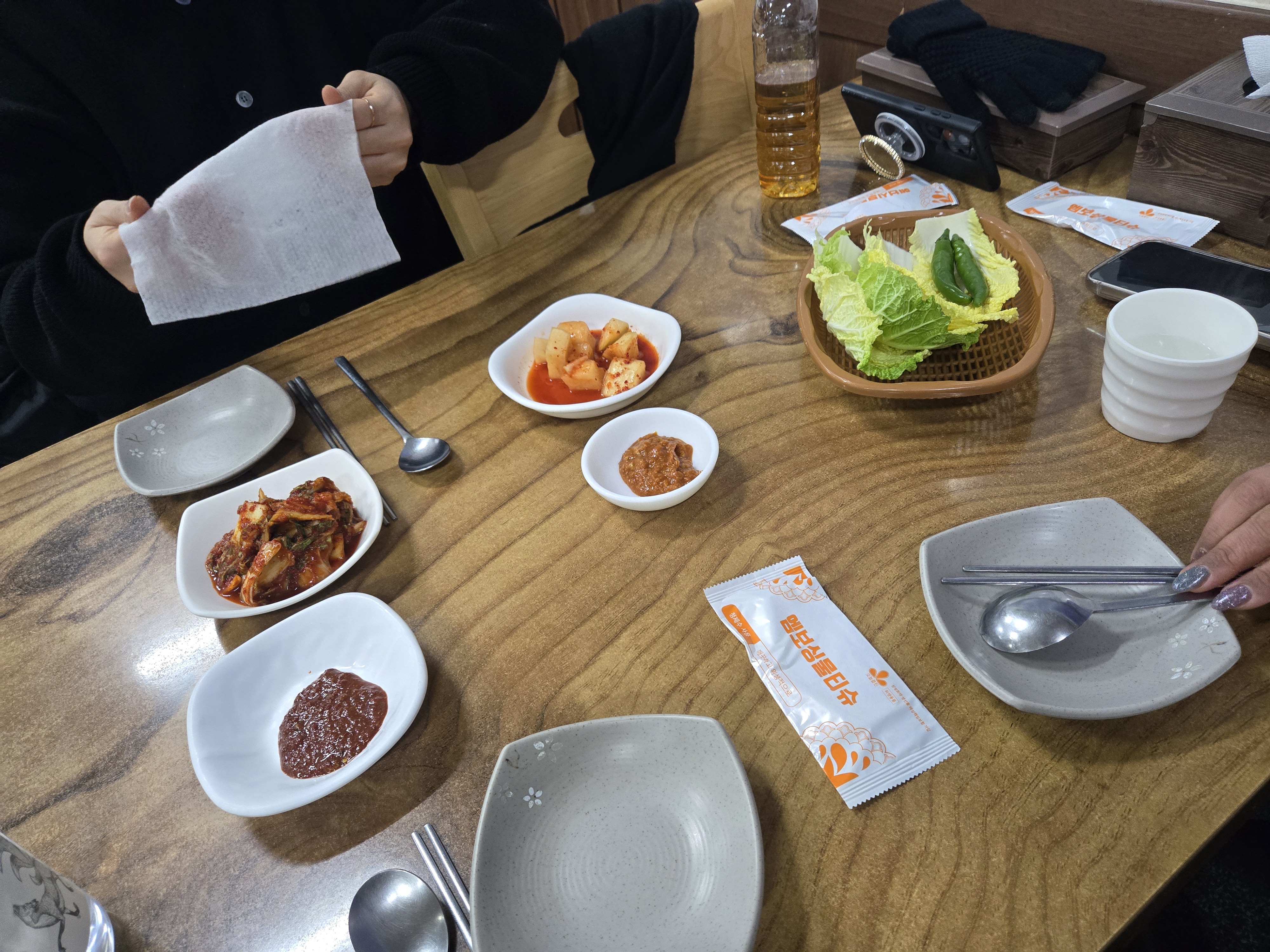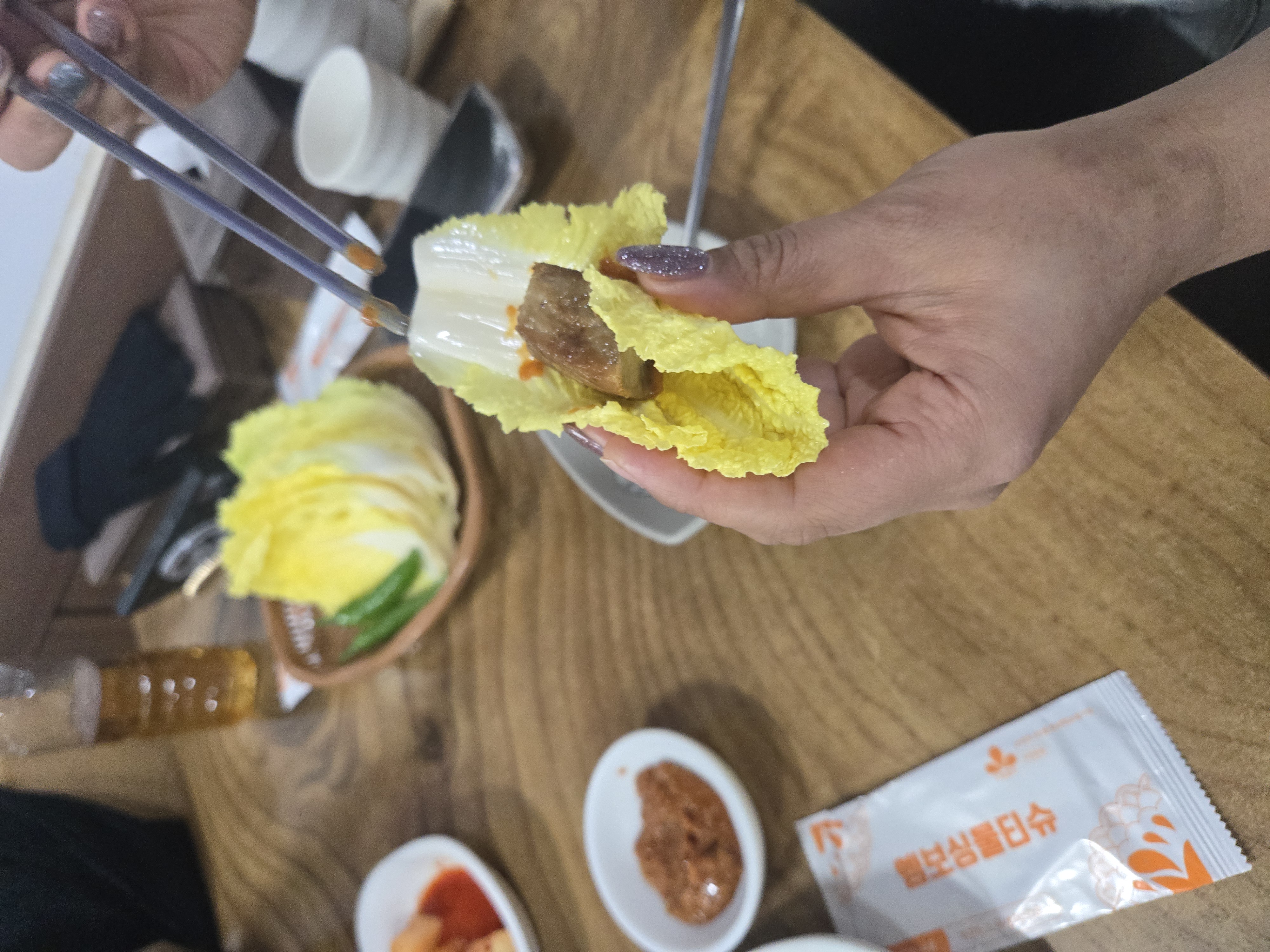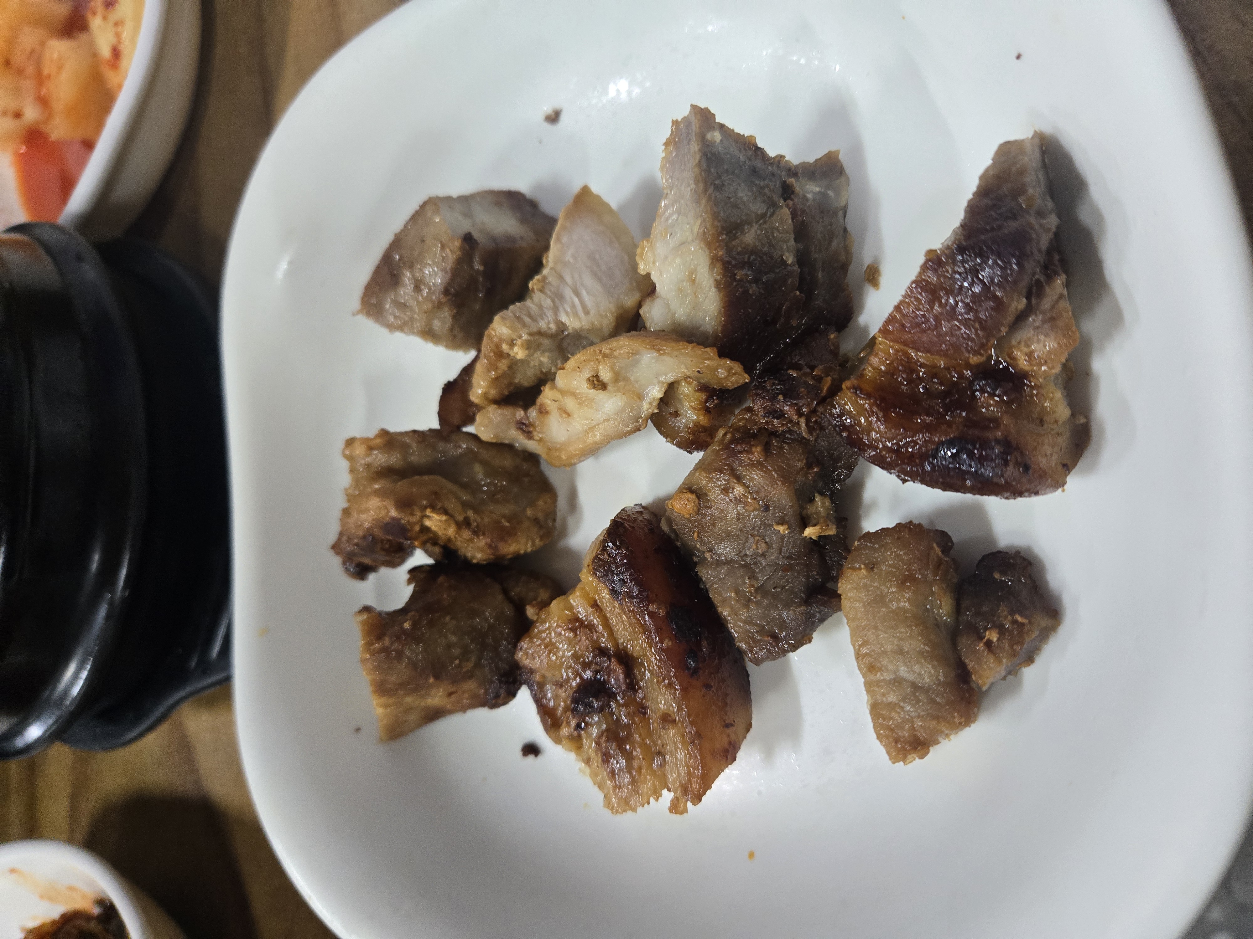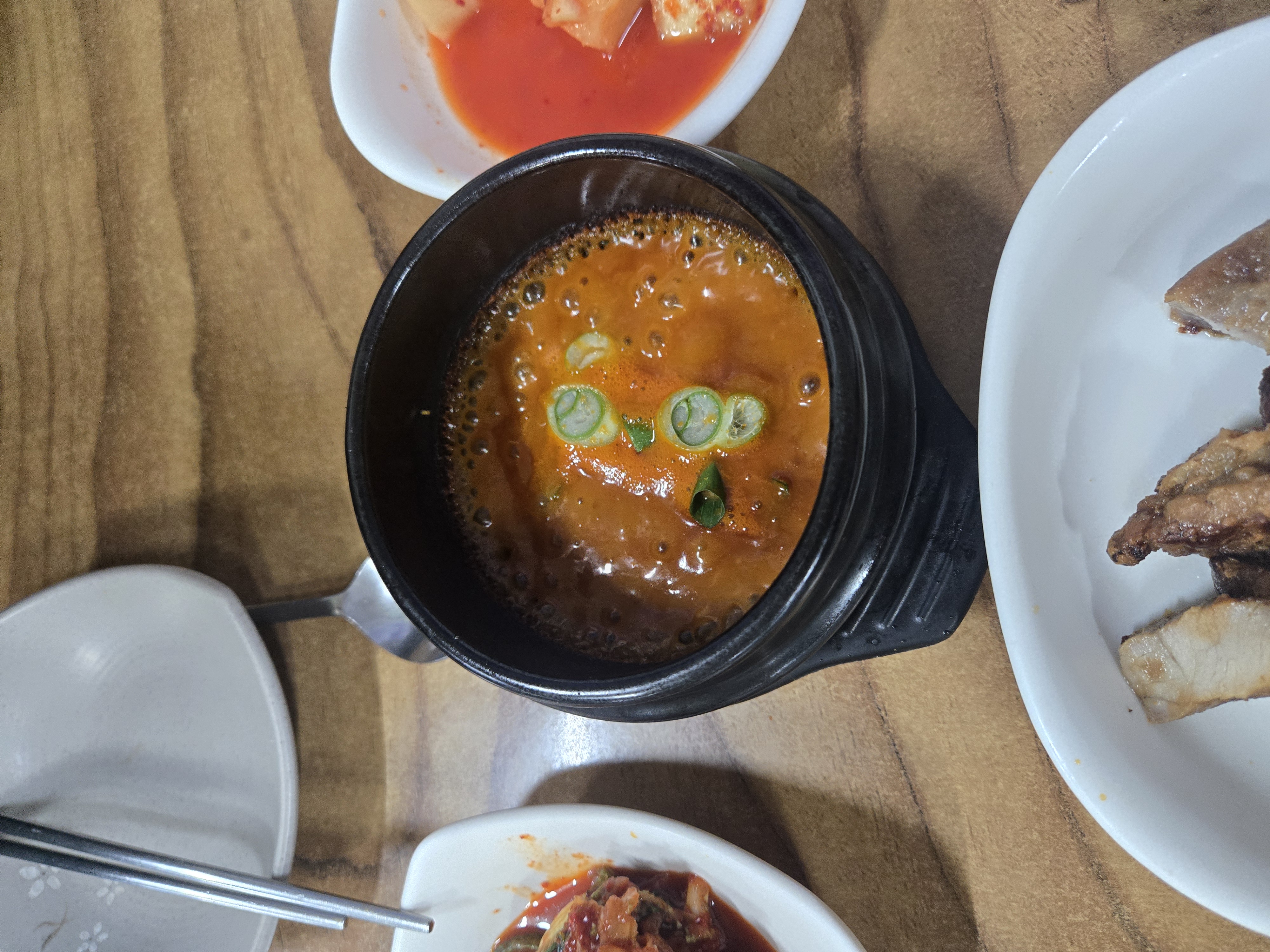 이 집도 김치가 꽤나 맛있는 집이다. 반찬으로 먹어야 할걸, 맛본다고 한입씩 먹다 보니 순식간에 비워서 한 번 리필! 구워 나온 고기와 뚝배기에 팔팔 끓인 강된장과 젓갈. 고기는 그냥저냥 이었는데 그런 부분을 커버할 수 있는 강된장과 젓갈이었어. 강된장 추가가 1,000원이었는데 추가가 필요 없을 정도로 세 명이 먹기에 양이 많고 충분했다.