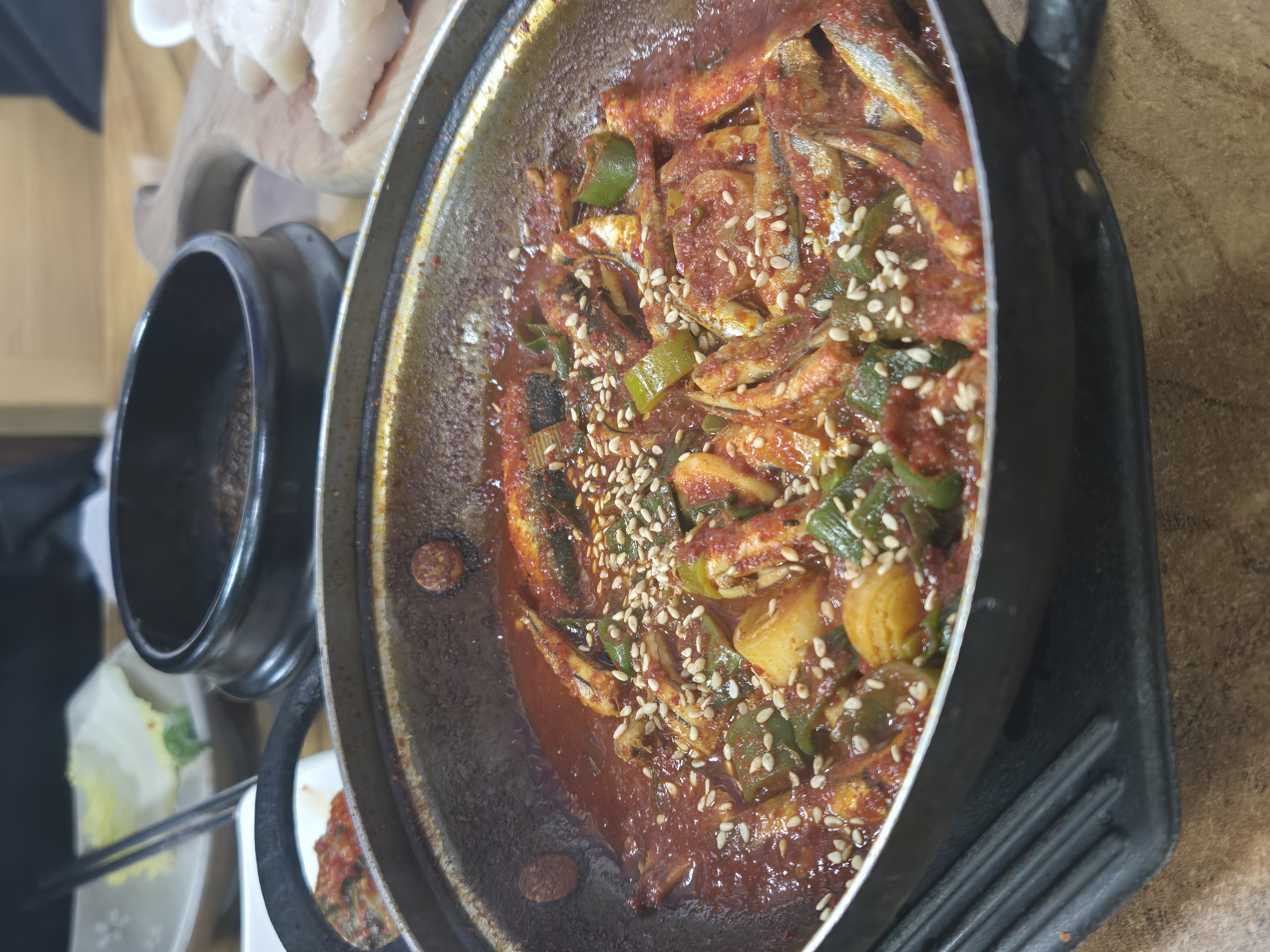 공깃밥을 시켜야 되는 타이밍이다. 먹어보며 시키자던 공깃밥. 멜조림이 테이블 위에 등판하자마자 여자 세 명이 눈 맞춤을 한다. 그래 이건 공깃밥이야. (이럴 때만 마음 맞는 친구들이다) 마치 경매라도 하듯 하나? 둘? 셋? 다시 두 개? 아니지! 세 개지. 그렇게 1인 1 공깃밥을 주문하게 한 멜조림. 이게 8,000원이라니. 내가 아버지 다음으로 제일 사랑하는 우리 이모부께 이 사진 한 장 들이밀고 "이모부, 인제. 멜조림 8,000원"이라고 말씀드리니 바로 "우와 나도 가고 싶다. 여기 어디냐?" 멘트가 절로 나온 비주얼. 제주 토박이인 어르신한테 추천해드릴정도면 이미 맛은 보장된 거지!