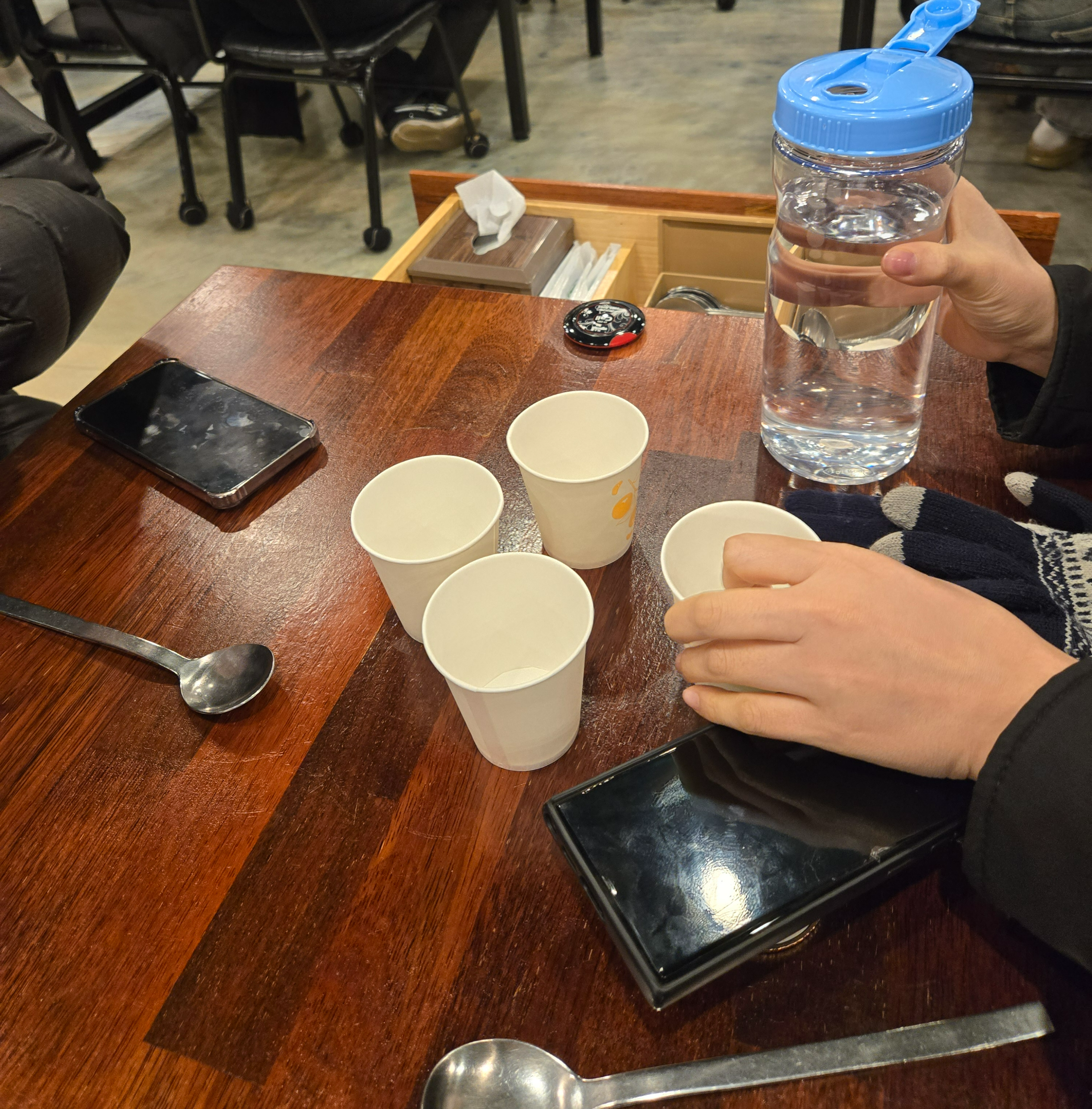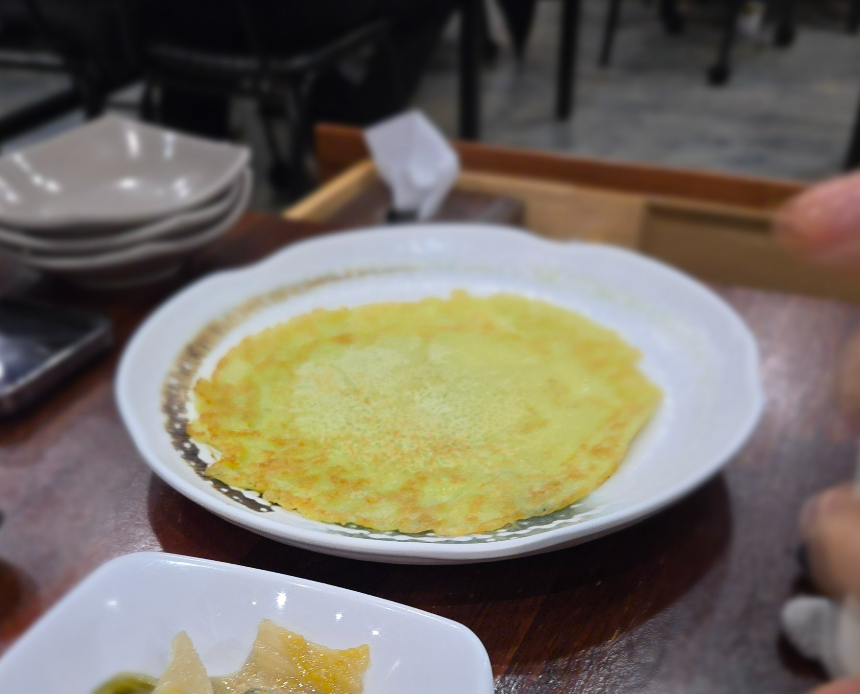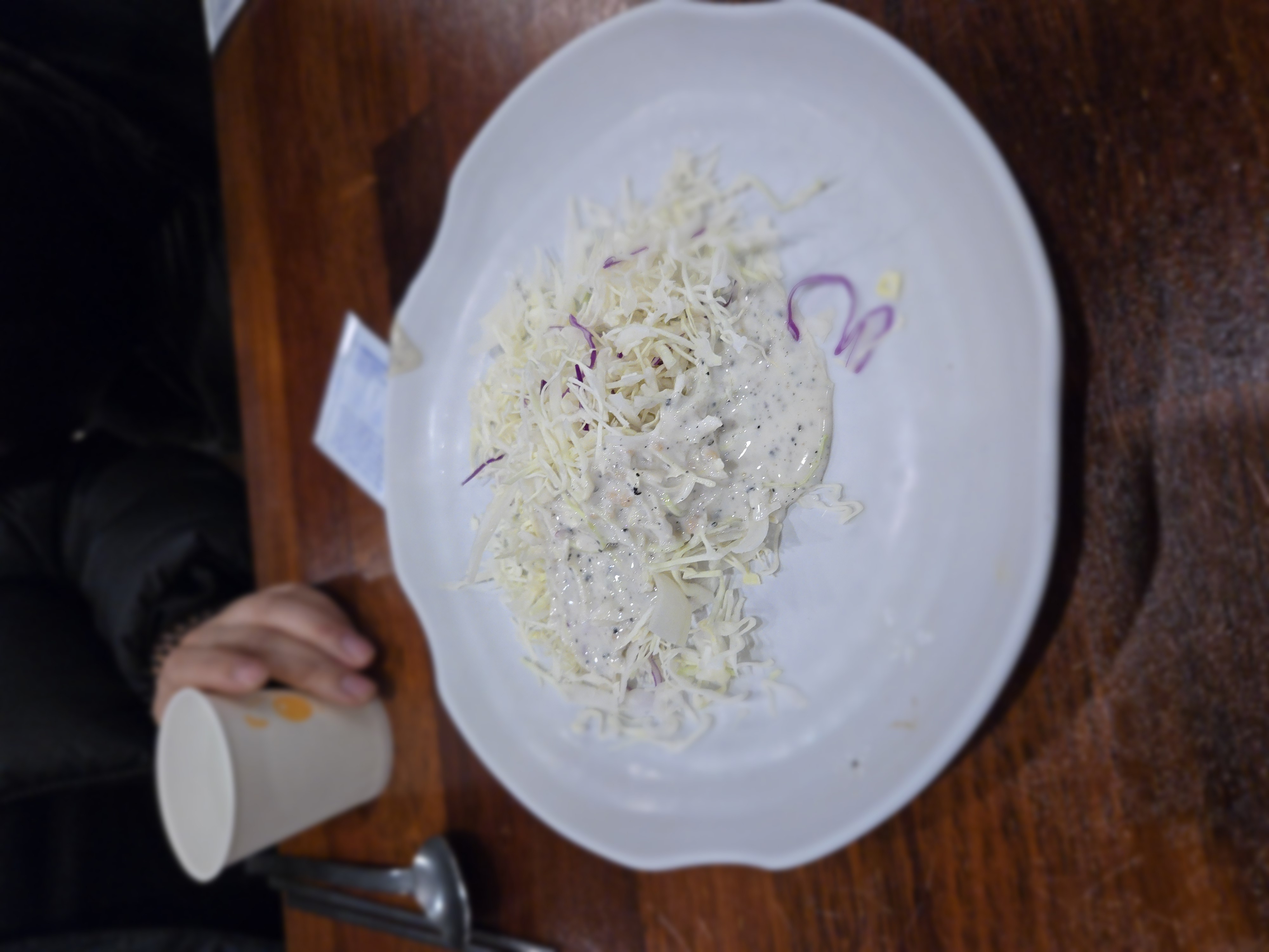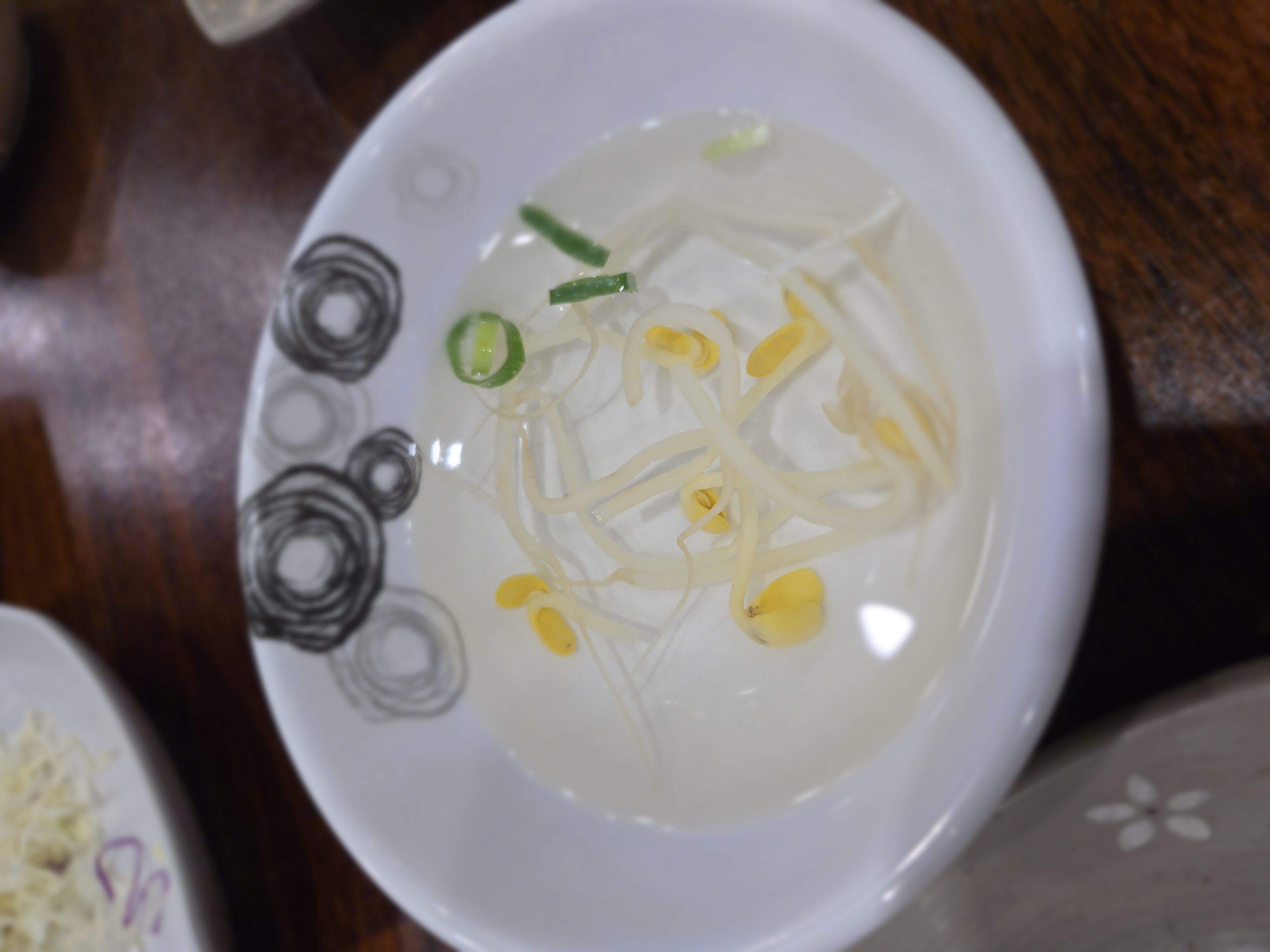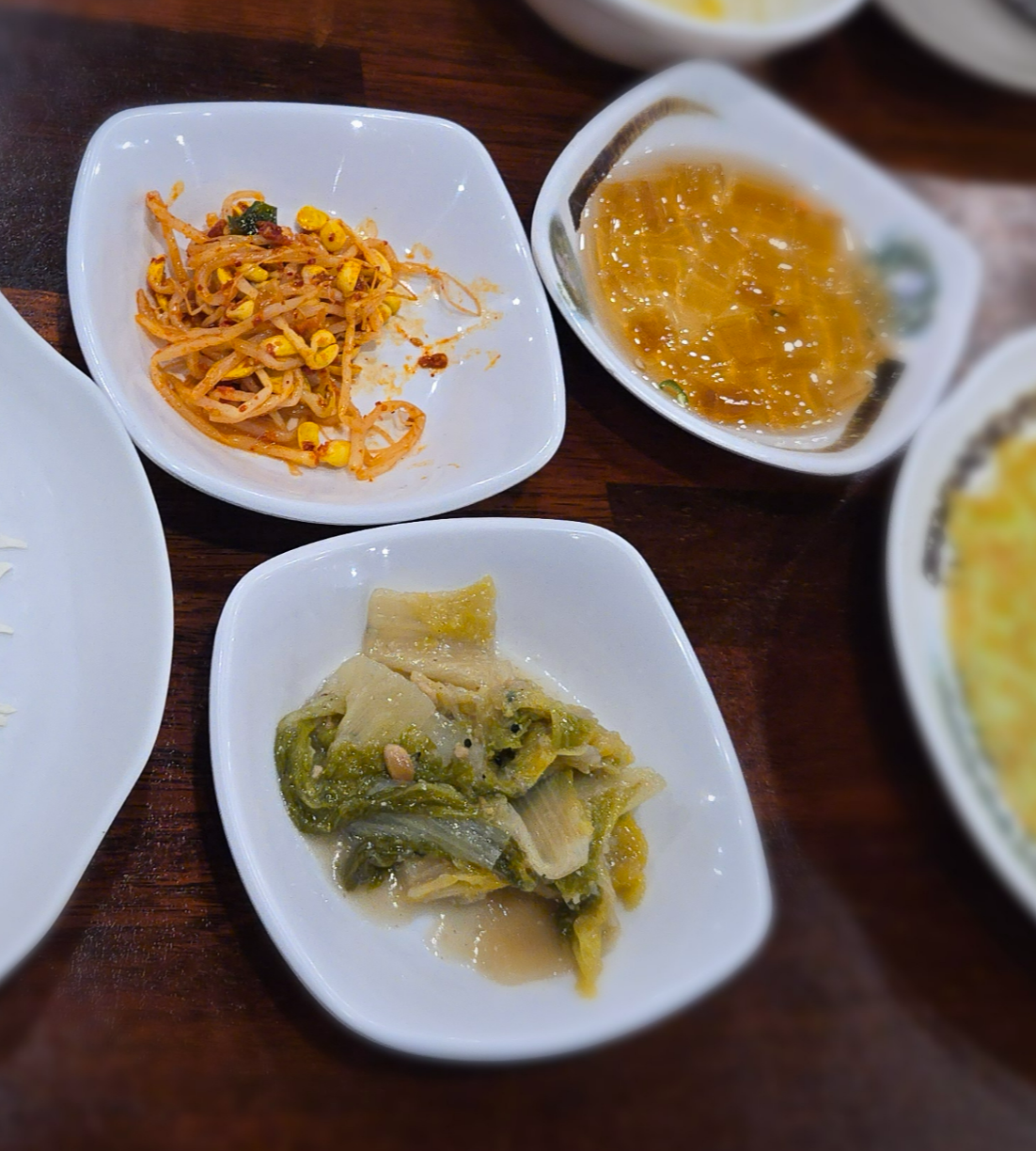 자리가 꽉 차서 입구 바로 앞에서 먹었는데 웨이팅 안 하는 게 어디야. 추웠지만 먹다 보면 따뜻해 질거라 서로를 위로하며, 주문! (컵은 종이컵으로 테이블 옆 서랍에 수저와 같이 준비되어 있다.) 정말 바쁜 가게임에도 주문과 동시에 밑반찬이 바로 준비되는데 콩나물국/샐러드/부침개/콩나물무침/시래기볶음? [샐러드도 리필가능했고, 콩나물국 전원 2번, 시래기볶음 3번 리필했음] 친절히 가져다주셔서 좋았다. (리필해서 저는 결코 남기지 않으니까, 걱정 마세요😜)