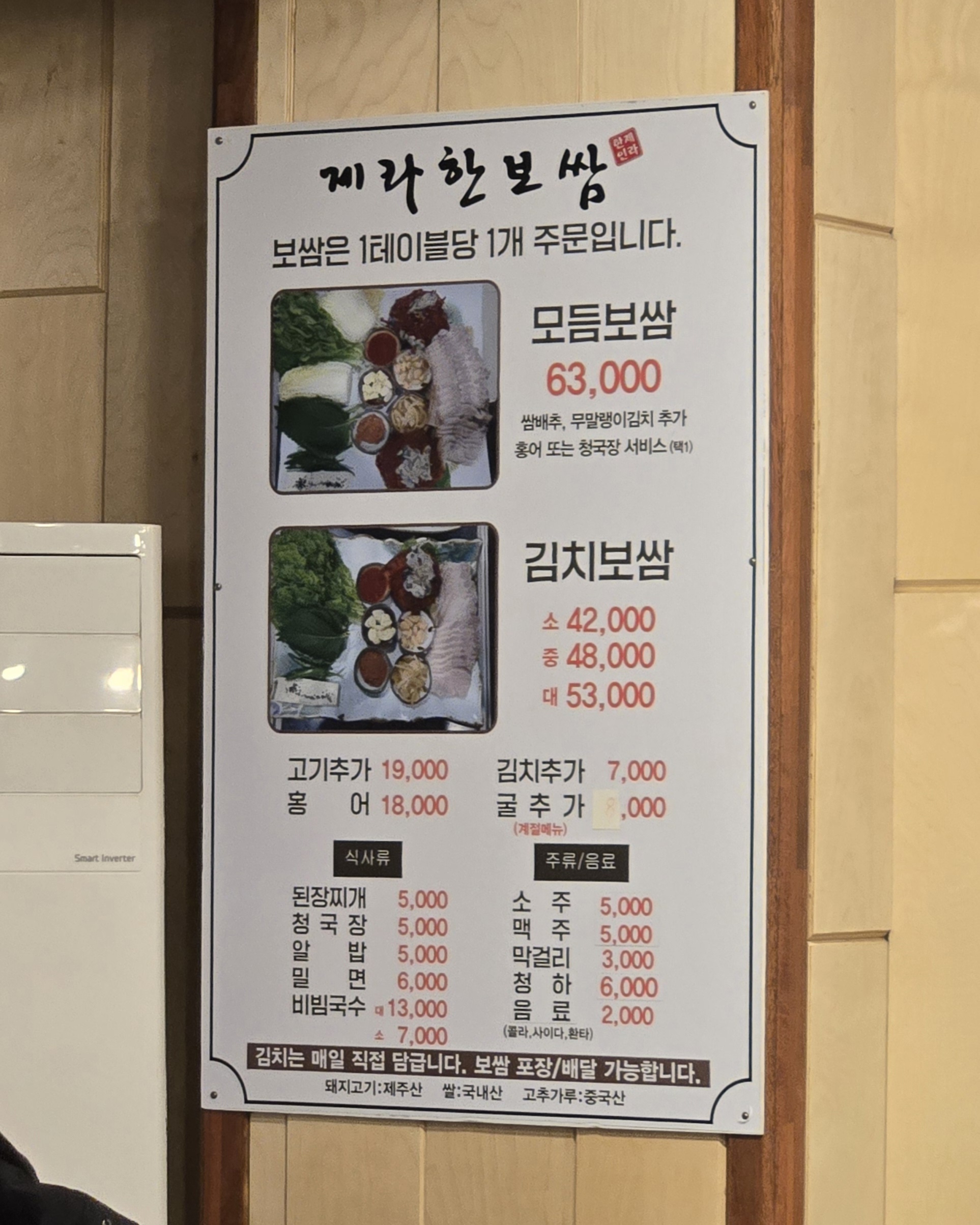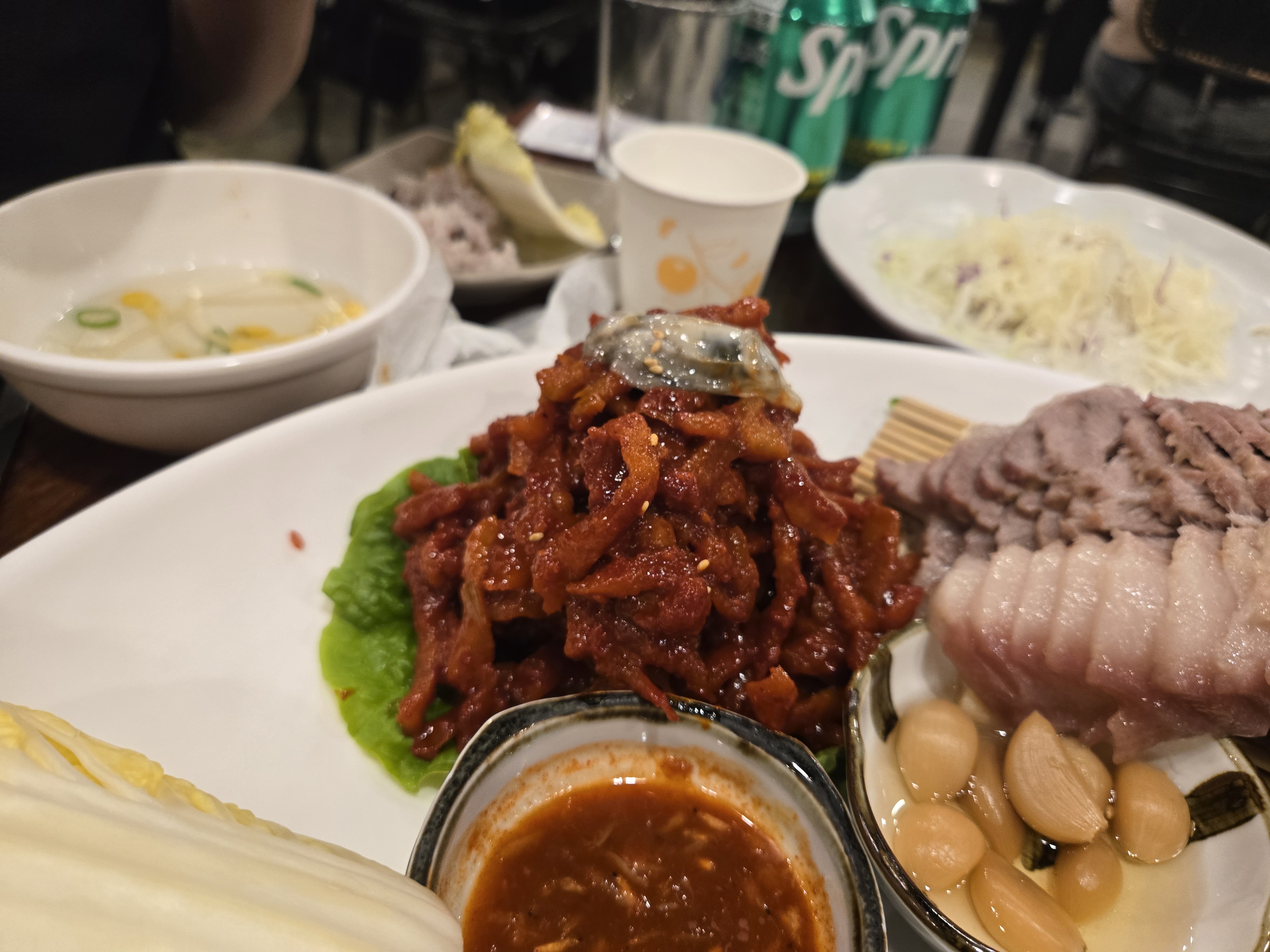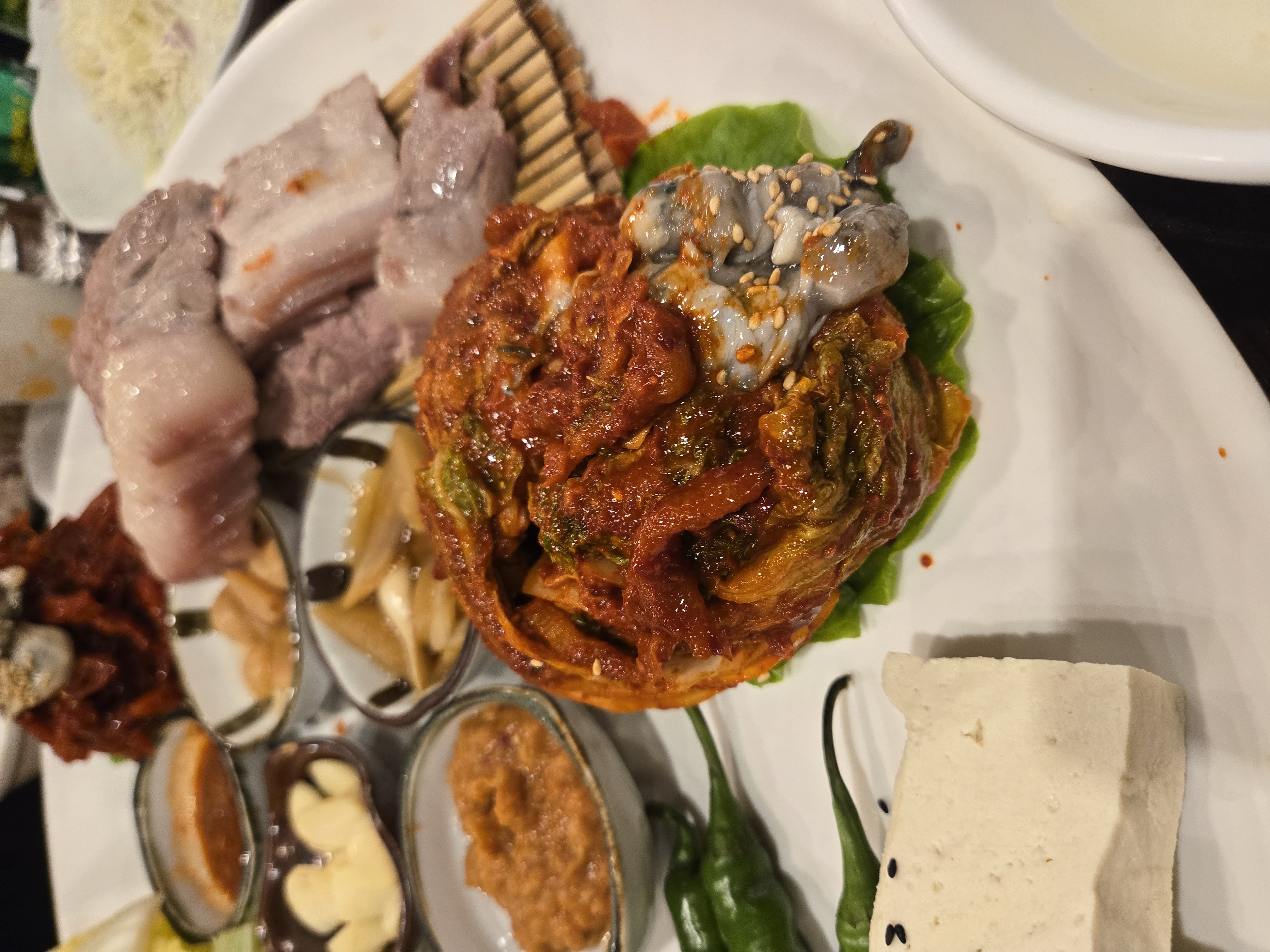 제라한 보쌈의 일반보쌈을 주문하지 않고 모듬보쌈을 주문하는 이유는, 무말랭이 김치와 쌈배추 그리고 선택메뉴(홍어 또는 청국장) 서비스가 있기 때문이다. 일반 보쌈을 주문하면 위의 말한 서비스를 주지 않는다고 한다. 나는 한 번도 일반보쌈을 주문해 본 적이 없다. 지금껏 모듬보쌈만을 고집해 왔지. 그리고 내가 홍어를 좋아하는 탓에 홍어서비스 준다 하니 첫 방문했을 때부터 이기적으로 모듬보쌈을 주문한 이후로 꾸준히 모듬보쌈을 주문하고 있다. 4명 중 유일하게 홍어 먹는 나를 위해 서비스로 홍어를 선택하고 청국장은 별도 추가로 주문했다. 청국장 냄새가 가게 안을 풍길 법도 한데, 매장이 워낙 넓은 데다 입구에 앉은 이유도 있고, 오고 가는 사람이 많아서 문이 계속 열려서 환기가 되는 모양이다. 청국장 냄새가 테이블 위에 올려지니 풍겨온다.