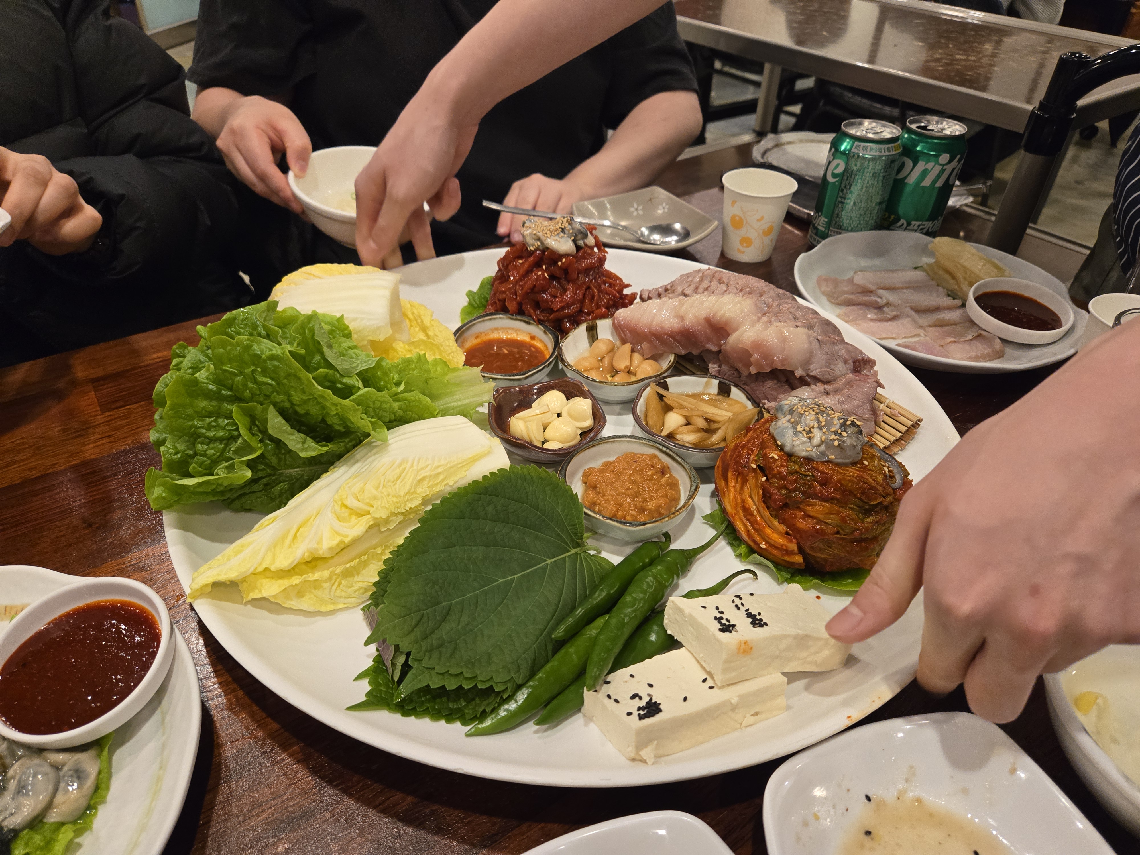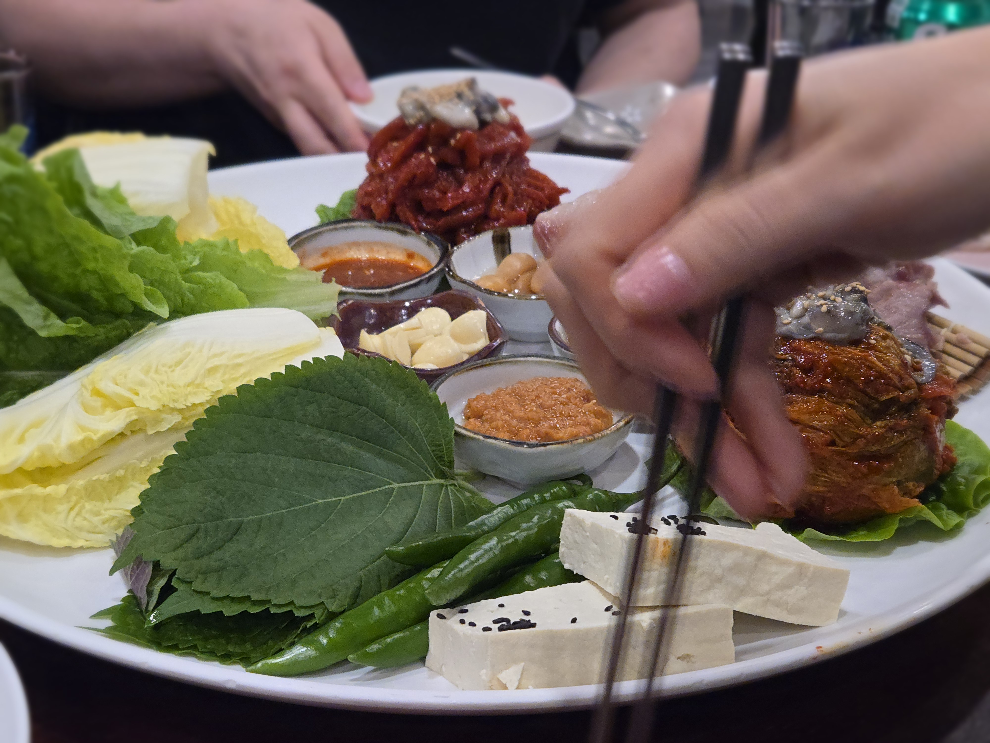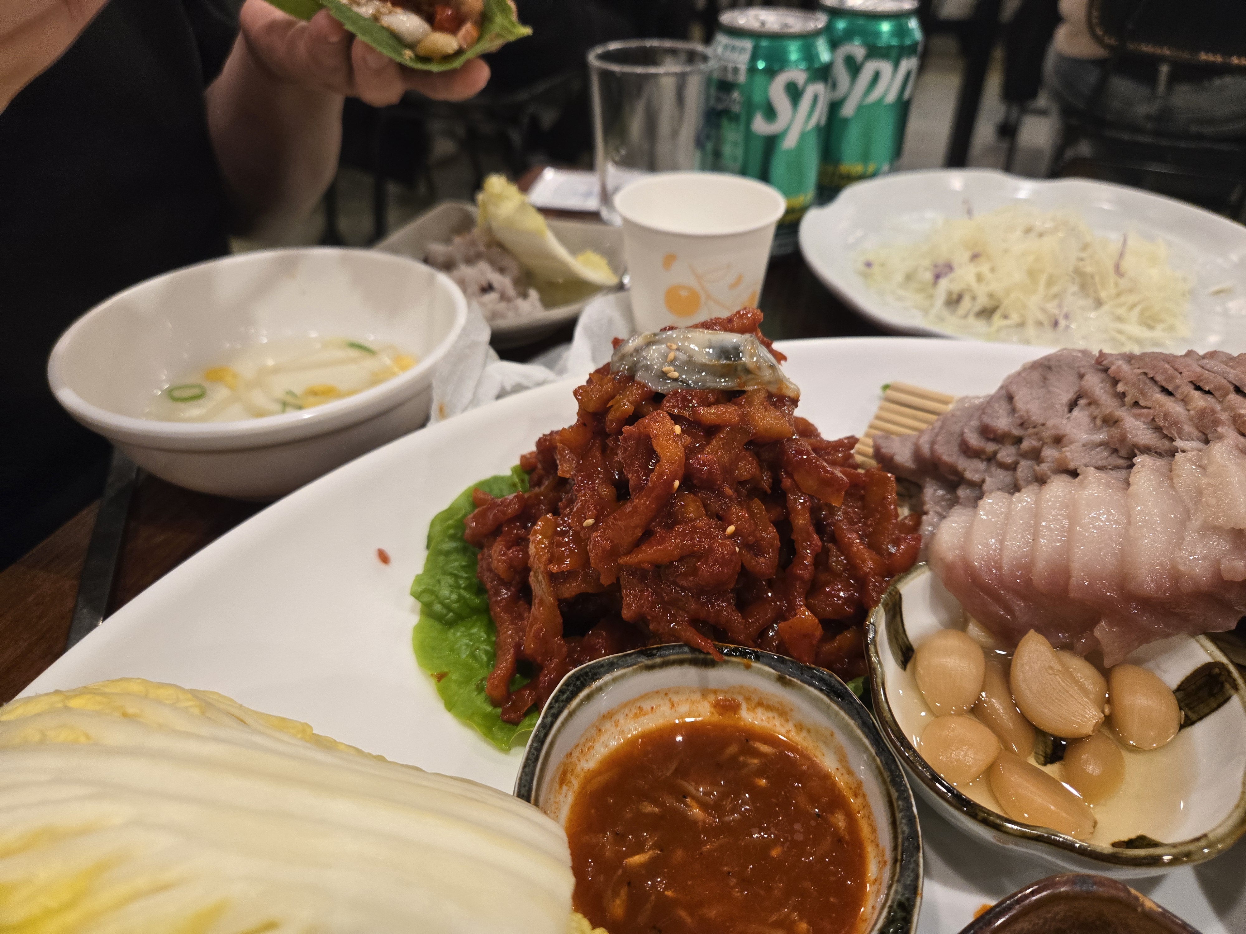 상을 뒤덮는 모듬보쌈 그릇. 그릇이 예전에 왔을 때보다 먼가 더 커진 것 같은 기분. 이 정도 그릇 사이즈면 주문제작한 거 아닐까? 완전 쟁반이다. 그릇 위에 신선한 깻잎/상추/쌈배추/데친 쌈배추/고추/데친 두부/마늘/쌈장/마늘장아찌/새우젓/무말랭이김치/보쌈김치/보쌈고기가 담겨 있다. 열거하기도 매우 힘드네? 내가 자주 찾는 가게인 만큼 맛이야, 물어서 뭐 해. 단 김치와 무말랭이 김치가 너무 달아서 호불호가 있는데. 김치는 어느 집이나 호불호가 있기 마련이다. 나는 이 보쌈김치가 달달한 게 딱 좋다. (보쌈김치는 달아야 된다는 주의)