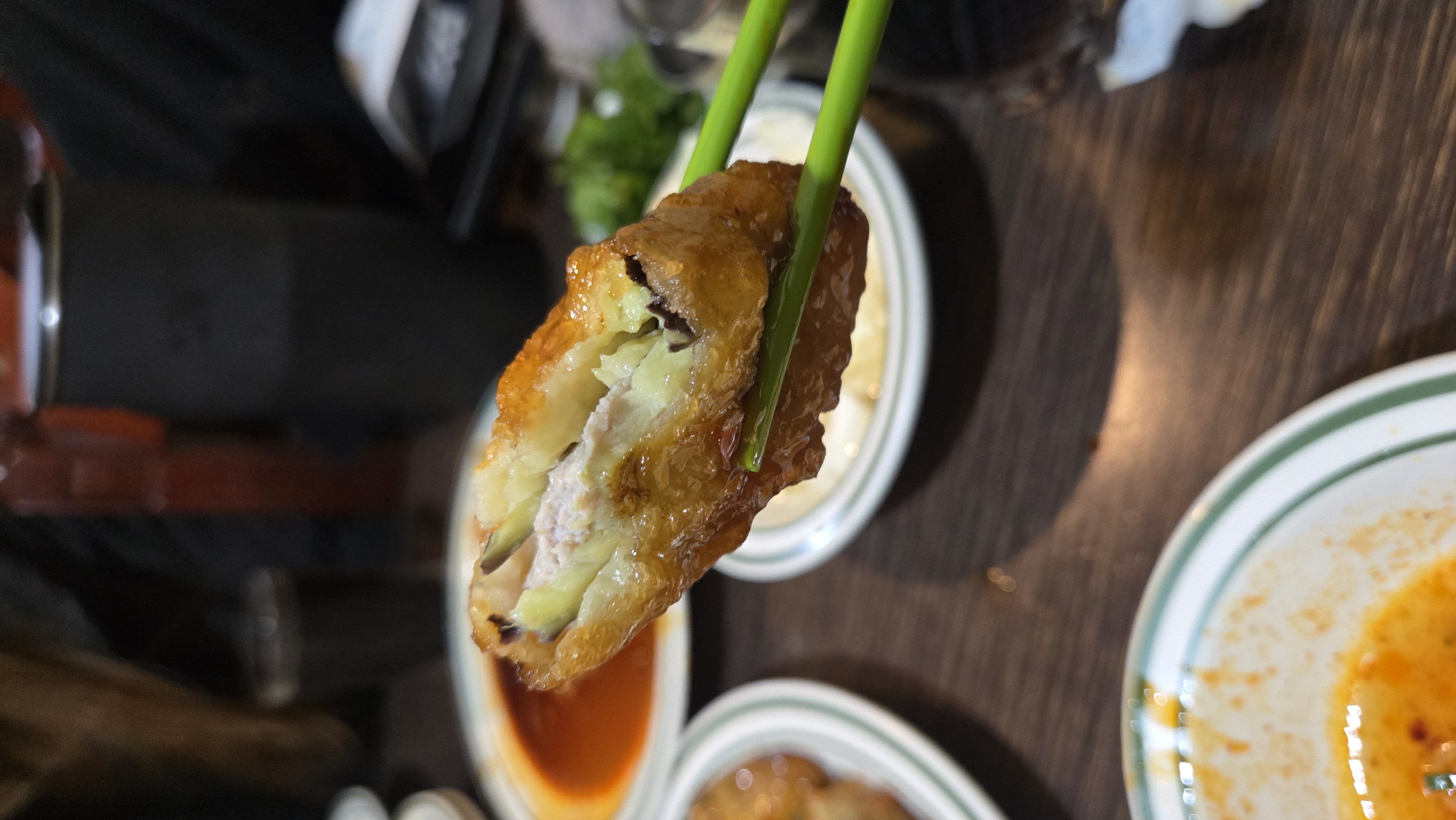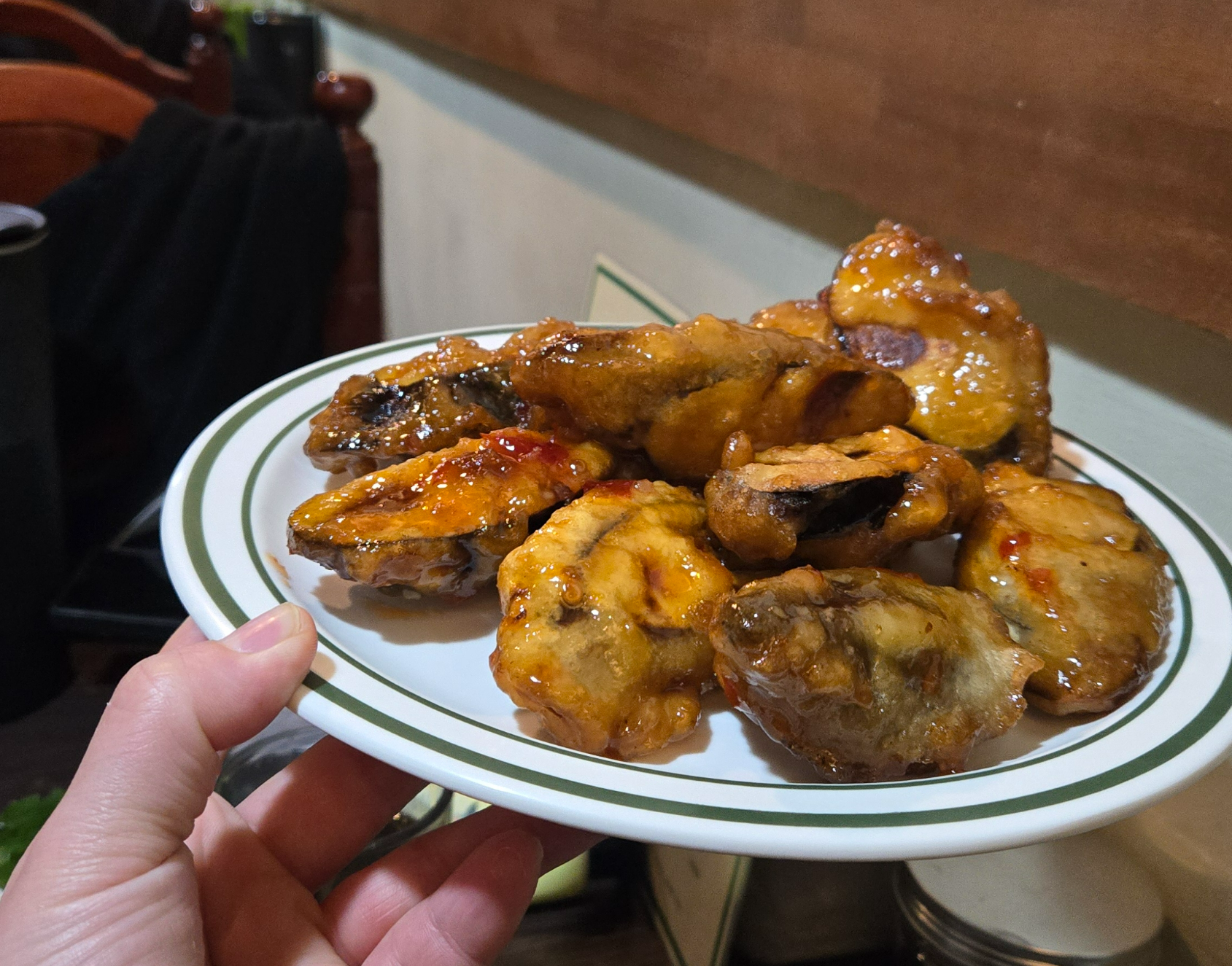 뜨겁다. 가지가 통으로 튀겨진 줄 알았는데 가지와 가지 사이에 고기가 들어있는 가지고기 튀김 되시겠다. 강한 단맛의 칠리소스가 겉을 감싸고 한 입 베어 문 후에 나오는 담백해 보이는 하얀 고기와 가지의 속살이 조화롭게 어우러져 있다. 친구는 너무 달다고 했지만, "나는, 딱 좋은데? 안에 내용물이 담백하니까 융화가 되잖아."