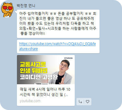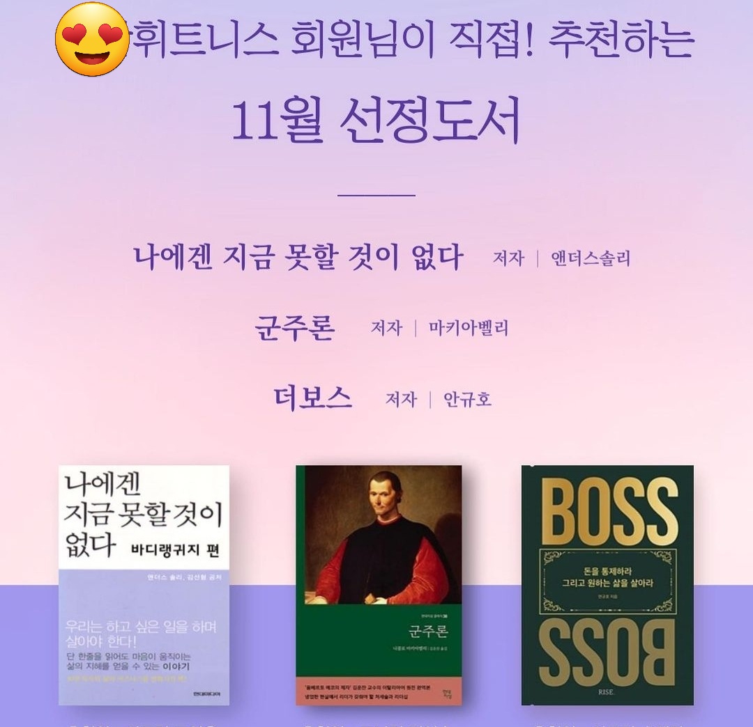 여담으로 사촌오빠가 몸담았던 이랜드 그룹에서는 독서를 정말 중요시해서 정말 많은 책을 읽어야 했었답니다. 오빠 집 서재를 구경하다 그때 당시의 필독서라면서 도움이 됐노라고 추천을 해주는데, 35년 인생을 살며 우리 사촌오빠가 멋있어본 적이 그때가 처음이자 마지막이었던 것 같습니다. 😊책을 통해 성공한 회장이 그룹의 전 직원에게 책을 우선순위로 두라고 한 것은 직원의 성장이 그룹의 성장으로 이어진다는 것을 회장님은 알고 계셨던 거죠. 이랜드 그룹 외에도 제 주변에 헬스클럽이나 미용실 같은 곳에서 이 달의 도서를 선정해서 같이 읽고 저자를 초빙해서 강연을 하고 토론을 하는 문화가 있는 것을 발견했습니다. 제가 무슨 생각을 했을까요?