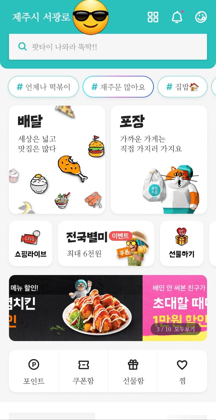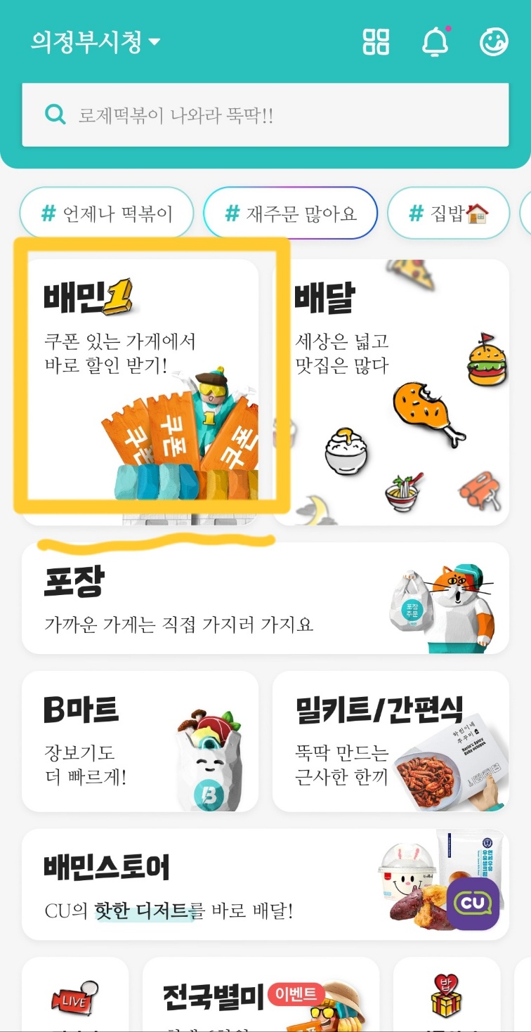 왼쪽은 제가 있는 지역인 제주도에요. 제주도에는 배민1이 없어요. 2도 없구요.제주사람~ 배민원 아는 사람? 손! (잘 모를거야. 코로나로 그렇게 배달음식 많이 시켜먹었어도 제주도엔 배민원이 뜨지 않는다구요) 오른쪽은 그냥 생각나는 서울을 찍었어요. 의정부시청! 이렇게 지역 설정을 해두니, 난생 처음 보는 배민1을 영접하게 되었어요.