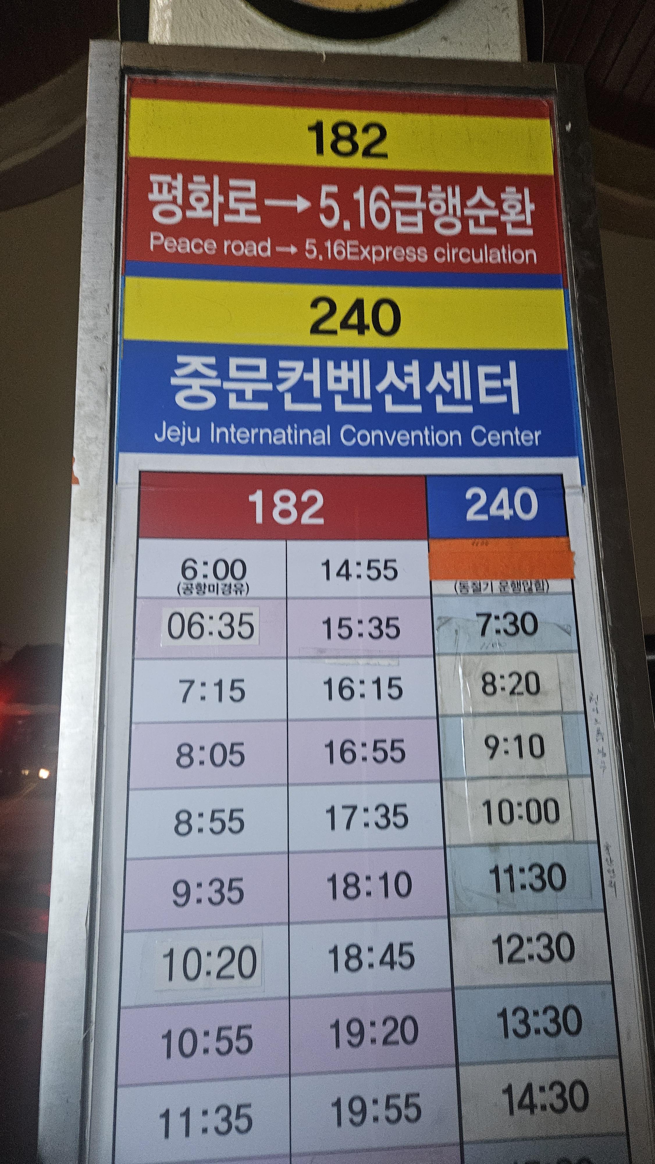 516 도로가 통제되면서 281번 버스만 이용하던 나에게 시련이 닥쳤다. 카카오맵을 지나치게 의존했던 게 화근이었다. 다른 버스 노선을 알기는커녕 버스시간표가 카카오맵에는 나와있지 않아서 이 일을 어쩐다 새벽까지 발만 동동 구르다, 새벽 5시 30분에 집에서 출발! 40분여를 걸어 터미널에 도착했다. 기존 281번 버스 없는 대신 평화로로 우회한다는 182번 급행 버스를 이용했다.  제주 버스 정보시스템을 사람들이 얼마나 검색했길래, 사이트가 먹통이어서 정류장에 서있는 분께 이 버스가 맞냐고 물어보고 탔다.