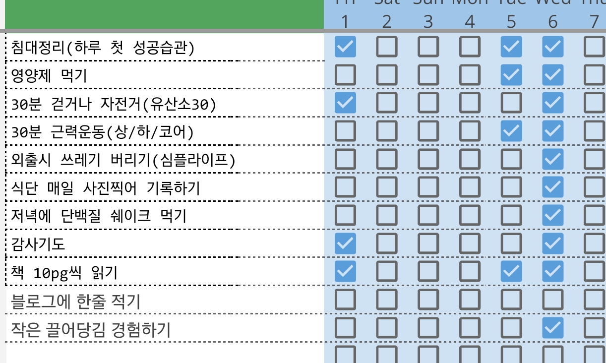 쓰고 보니 6가지 스텝인데? 동영상에서는 일곱 가지라고 했는데 한 가지는 맨 처음 목표를 정하는 과정인가 보다. 에밀리한테 구입한 엑셀스프레드 시트로 목표달성의 체크리스트도 만들어보아서 3달 사용했는데 목표가 너무 많으니 귀찮아 져서 몇 개 더 줄여야겠다.