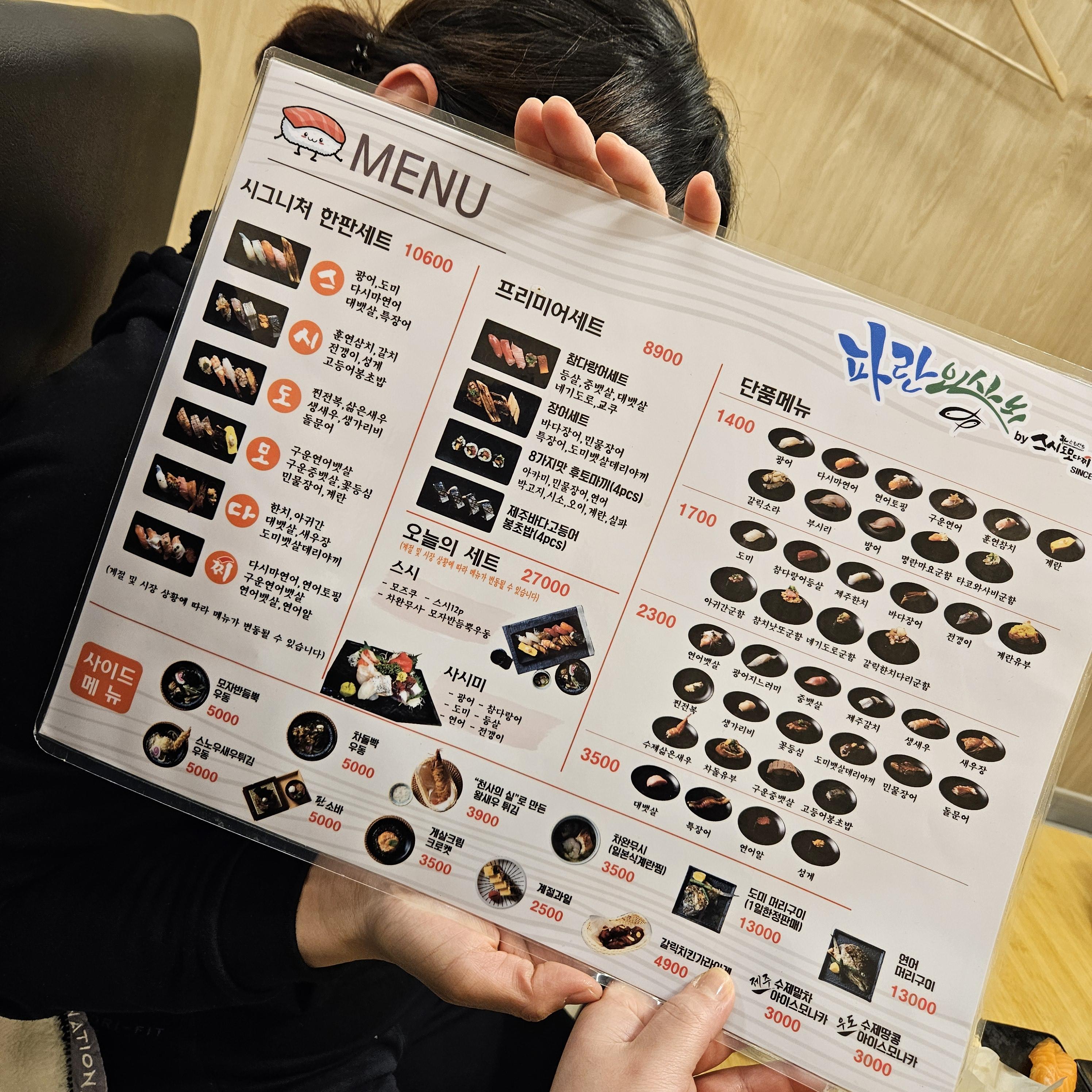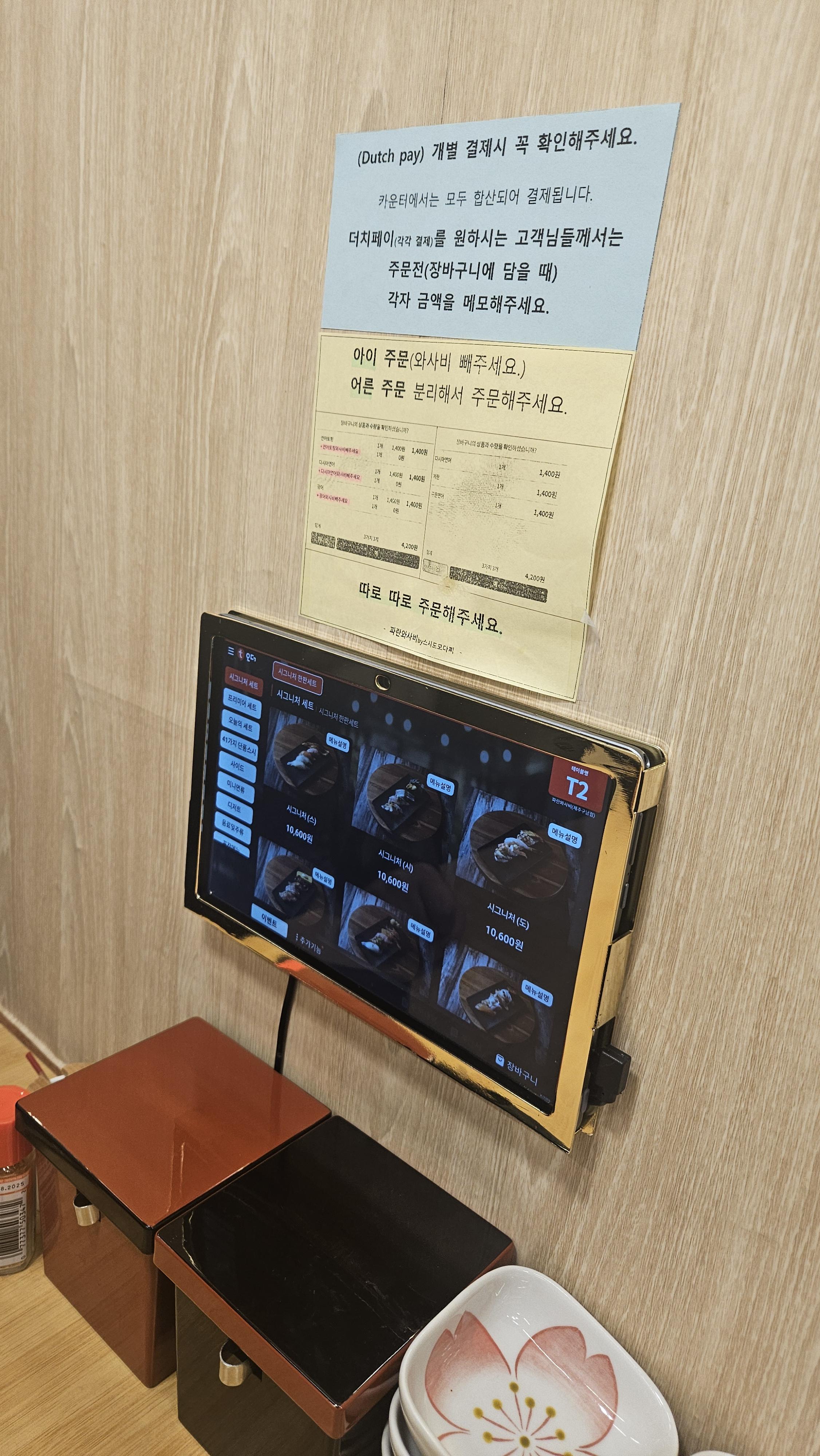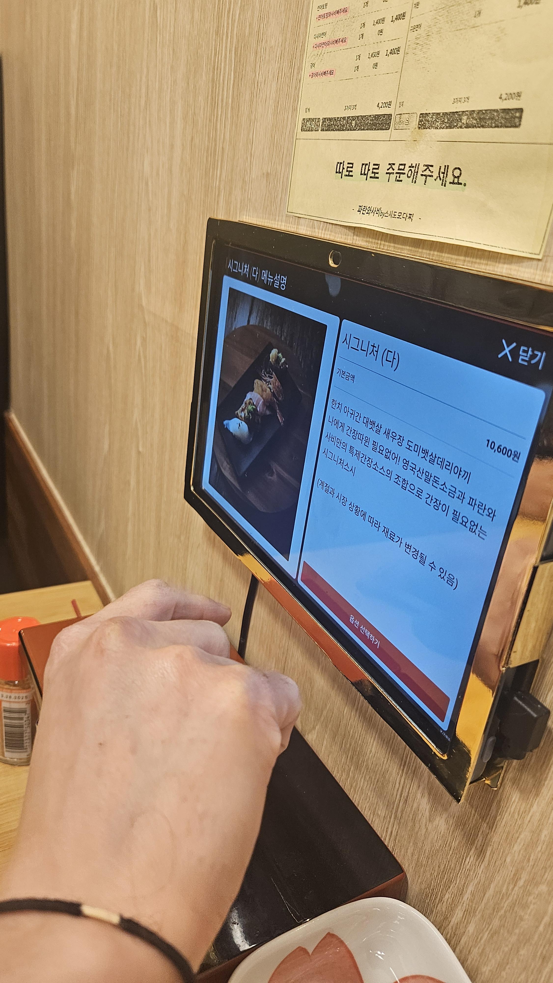 다른 지점은 회전초밥이라고 하는데 이곳은 회전 레일이 있는 곳은 아니고 티오더로 테이블에서 주문하는 방식이다. 레일 위에 올려져 있는 것을 가져다 먹는 방식에 익숙해져서 그런지 하나씩 주문하는 것이 되려 생소해져 버렸다.