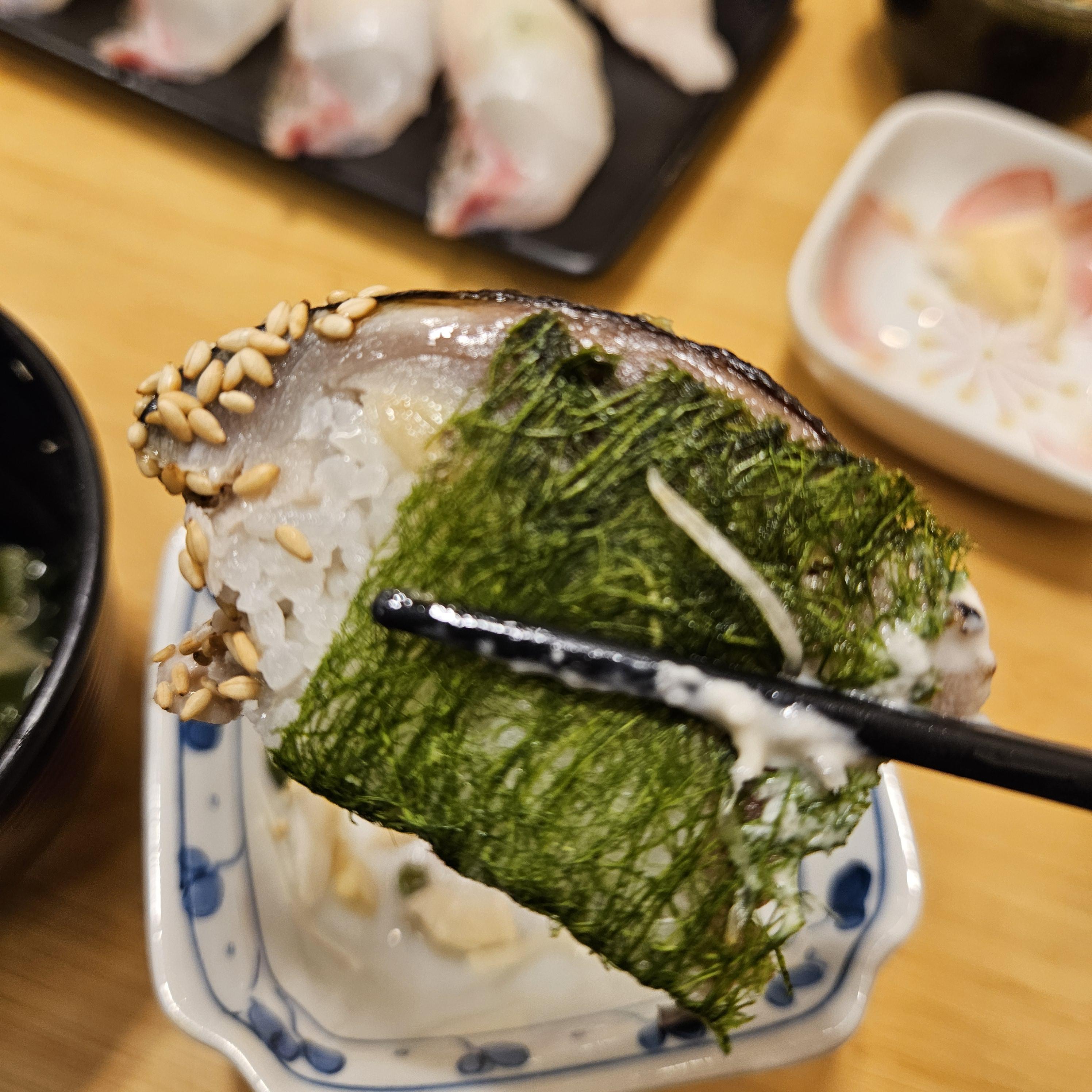 세트 주문 이후 추가로 주문한 고등어 봉초밥 은 감태로 감싸놓은 게 독특했다. 초밥을 전체적으로 다 리뷰해보고 싶었는데 너무 카메라만 들이대기에는 일행에게 미안해서 많이 찍지 못했다. 주변에 호불호가 갈려 조금은 걱정하고 갔는데 난 너무 맘에 들었다.