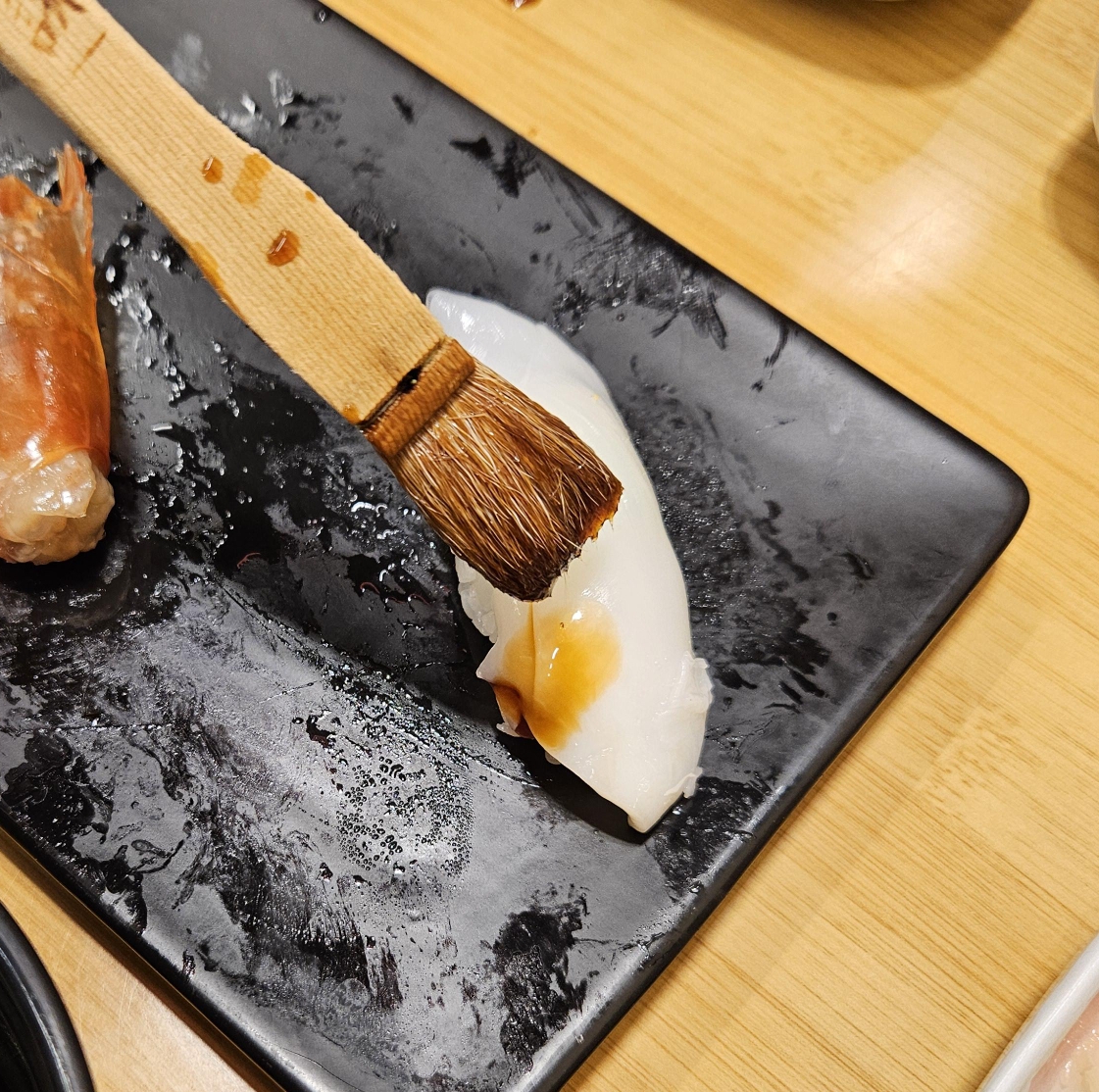 기본으로 주는 된장국과 샐러드 그리고 이 것은 뭐지? 하고 봤는데 간장이다. 붓은 초밥에 간장을 바르는 용도인데 간장을 찍어 먹을 때는 젓가락에서 놓쳐서 간장범벅이 된 짠 초밥을 먹게 될 때가 종종 있는데 그러지 않아도 되어 편했다.