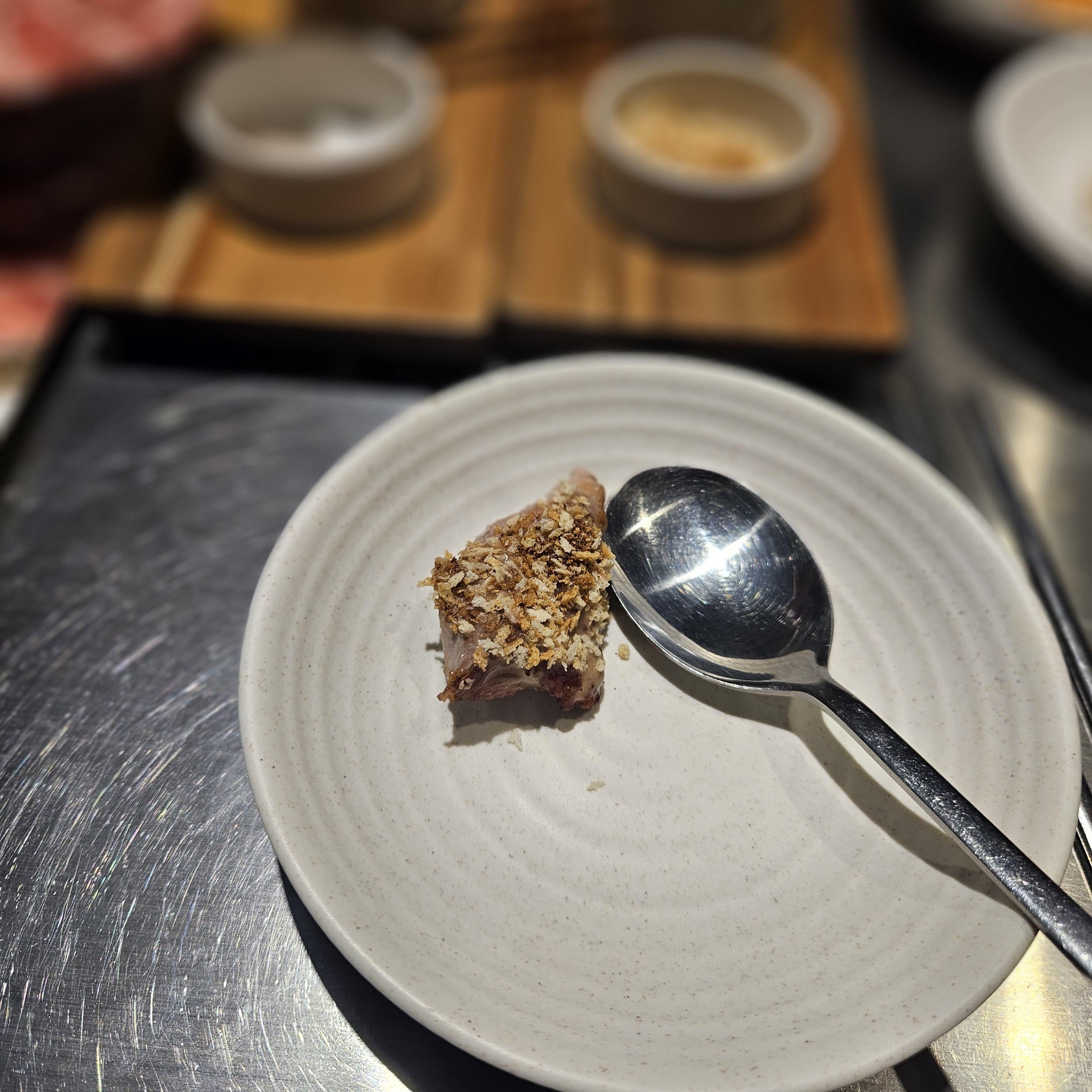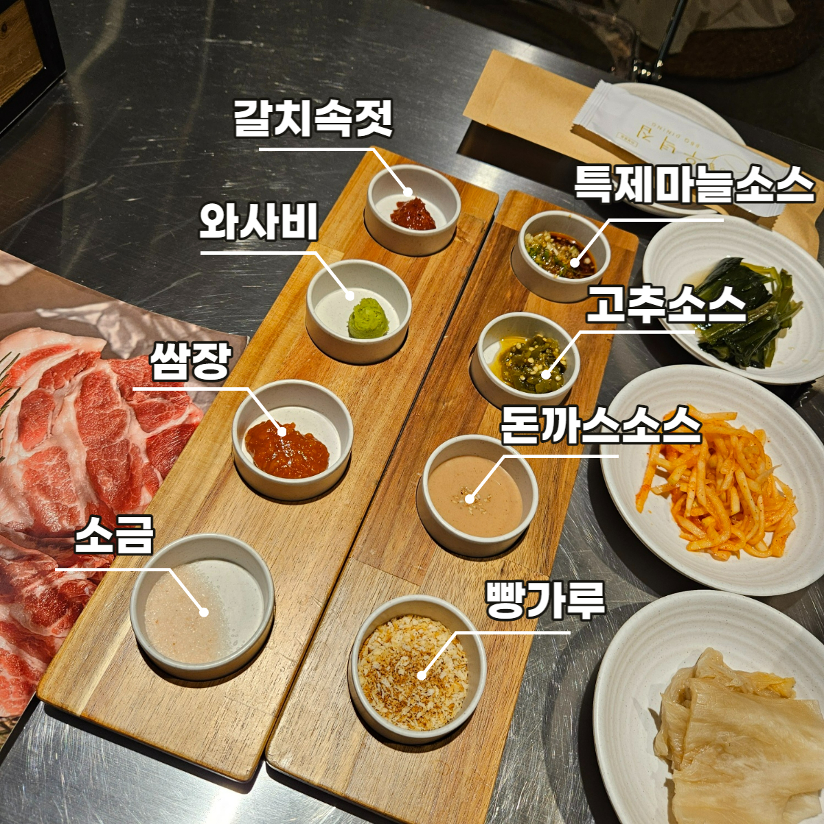 곁들임 소스가 엄청 많다. 소스를 일일이 설명해 주시는데 몇 개는 특제로 직접 다 만든 것이라고 한다. 소금에 찍어먹어도 맛있고 돈가스 소스에 처음 찍고 그 후에 빵가루를 묻혀서 먹기도 하고 특제 마늘 소스에 고기를 풍덩 빠트려서 먹으면 입안에 풍기는 마늘향이 알싸하면서도 그윽하다. 한국인에게 마늘은 필수지. 직원분께서 자랑할 만하네. 후에 고기를 다 굽고 불판 위에 올렸던 참기름 마늘과 멸젓을 쓱 불판에서 빼서 다른 소스와 같이 올려주셔서 고기 곁들임이 더 늘어났네?