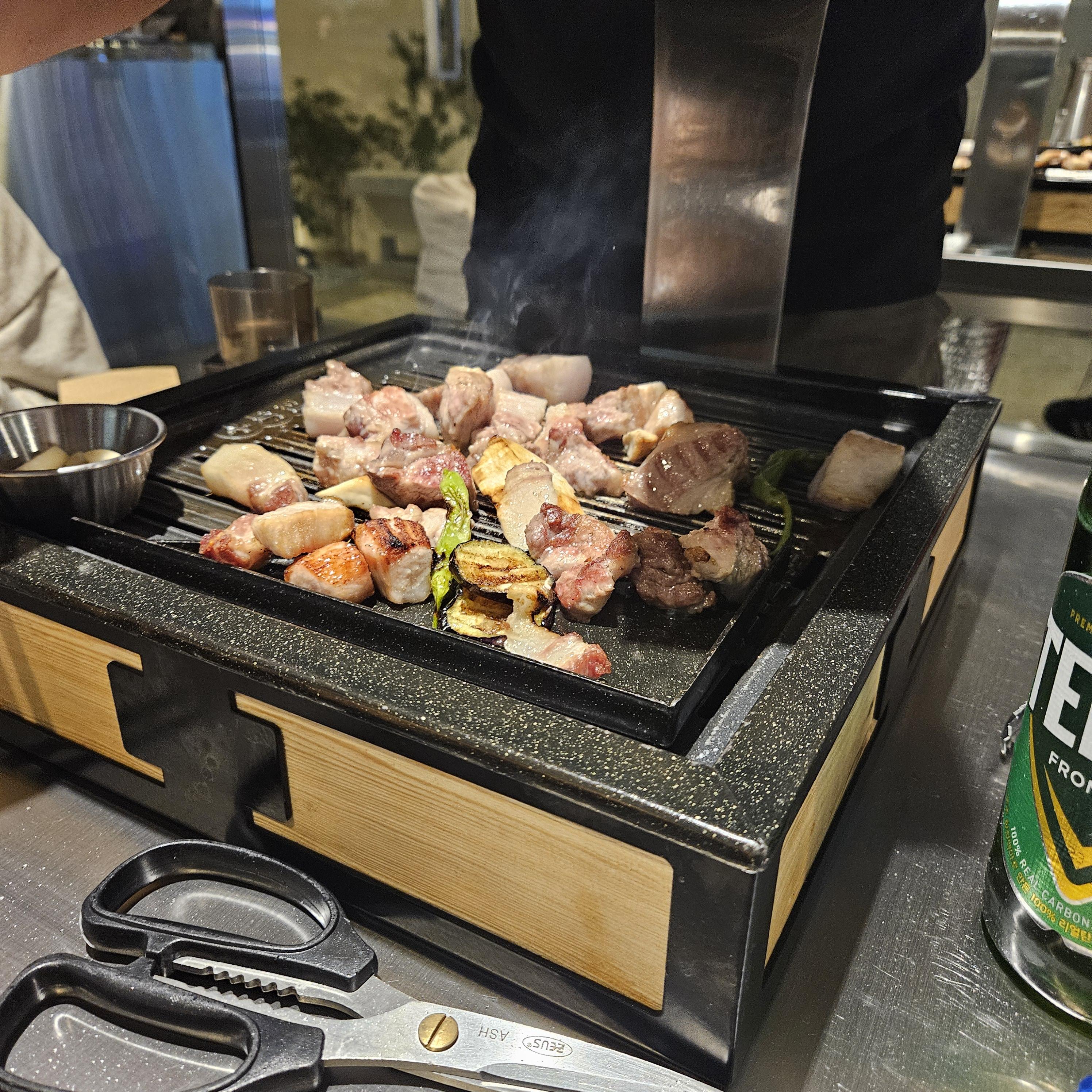 내가 막내라서 회식에는 항상 집게와 가위는 나의 몫이었는데 내가 집게와 가위를 들 일이 없을 만큼 직원분께서 이리저리 테이블 옮겨 다니시며 성심성의껏 다 구워주시고 다 잘라주셨다. 그리고  어떻게 먹어야 맛있는지 일일이 다 설명해 주심.