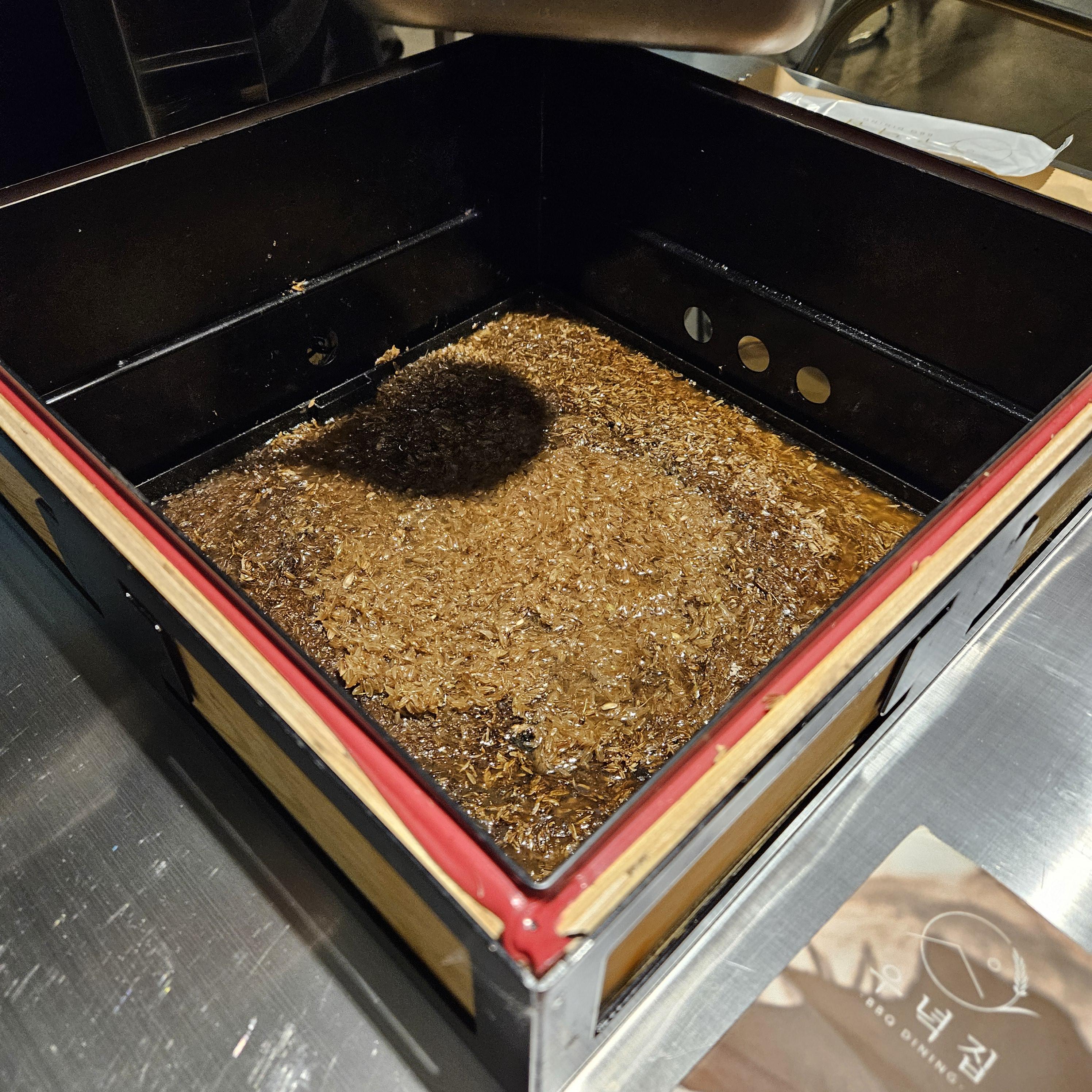 사진 찍는다고 직접 고기를 들고 계셔 주신 직원 분 덕분에 고기가 조명빨 제대로 받았네. 오른쪽 사진은 숯불이 들어오기 전 훈연을 위해 대정 보리 왕겨가 밑에 깔려있는 모습.