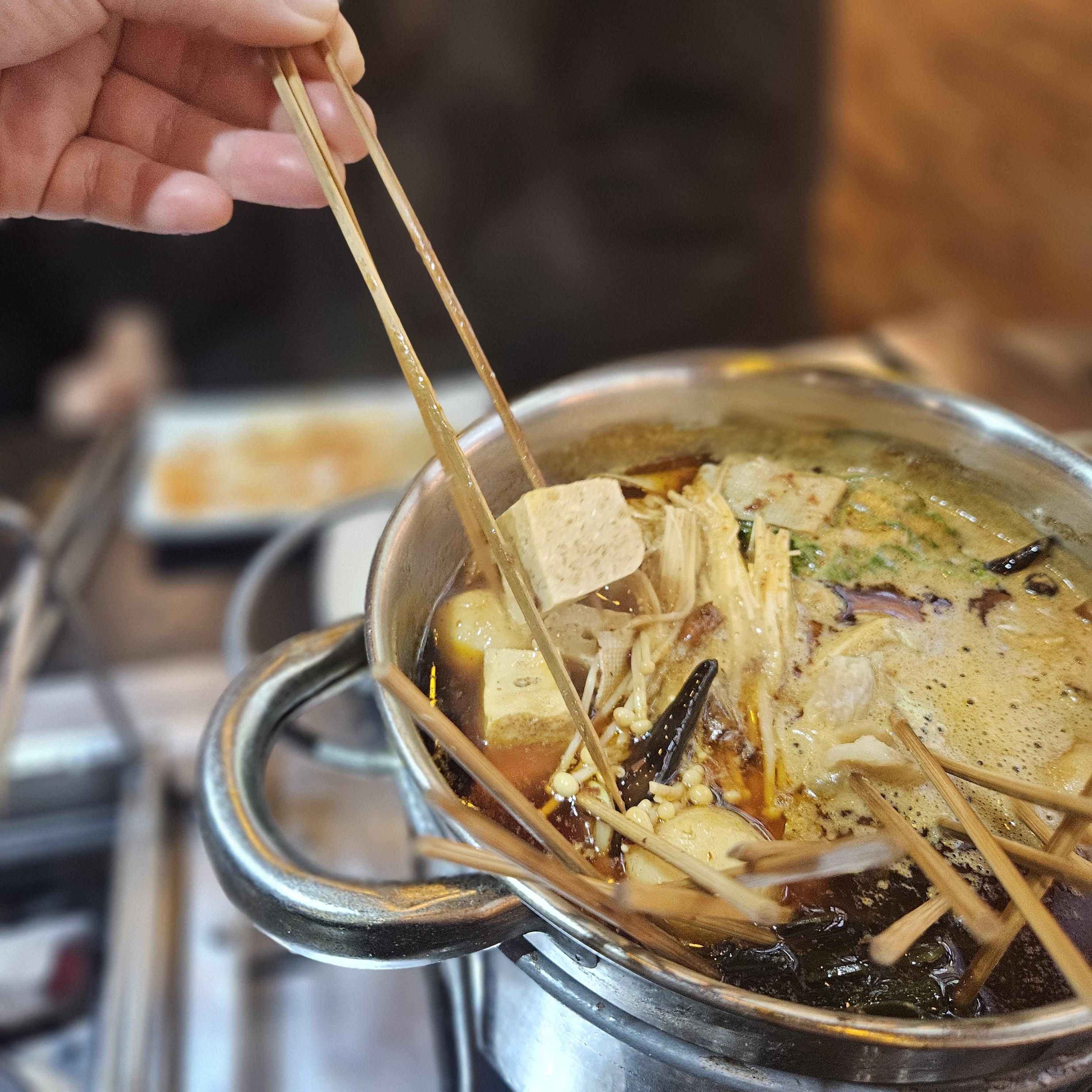 샤브샤브는 천엽/건두부/냉동두부/미역/송이버섯/배추/팽이버섯/피쉬볼/당면이 조금씩 들어있는데 25,000원으로 아담한 솥냄비? 에 담겨져서 나온다. 추가로 필요한 것은 각각 3,000원씩. 보통 우리가 평상시 먹는 샤브샤브는 국물을 먹는데 이 샤브샤브는 육수가 기름져서 먹을 수 있다기보다는 건더기에 육수가 배기게 푹 담가놓고 건더기만 먹어야 했다. 이것이 본토의 방식인 건가 싶었다. 맛있기는 했지만 나는 마라탕의 국물파라 조금 아쉬웠다.