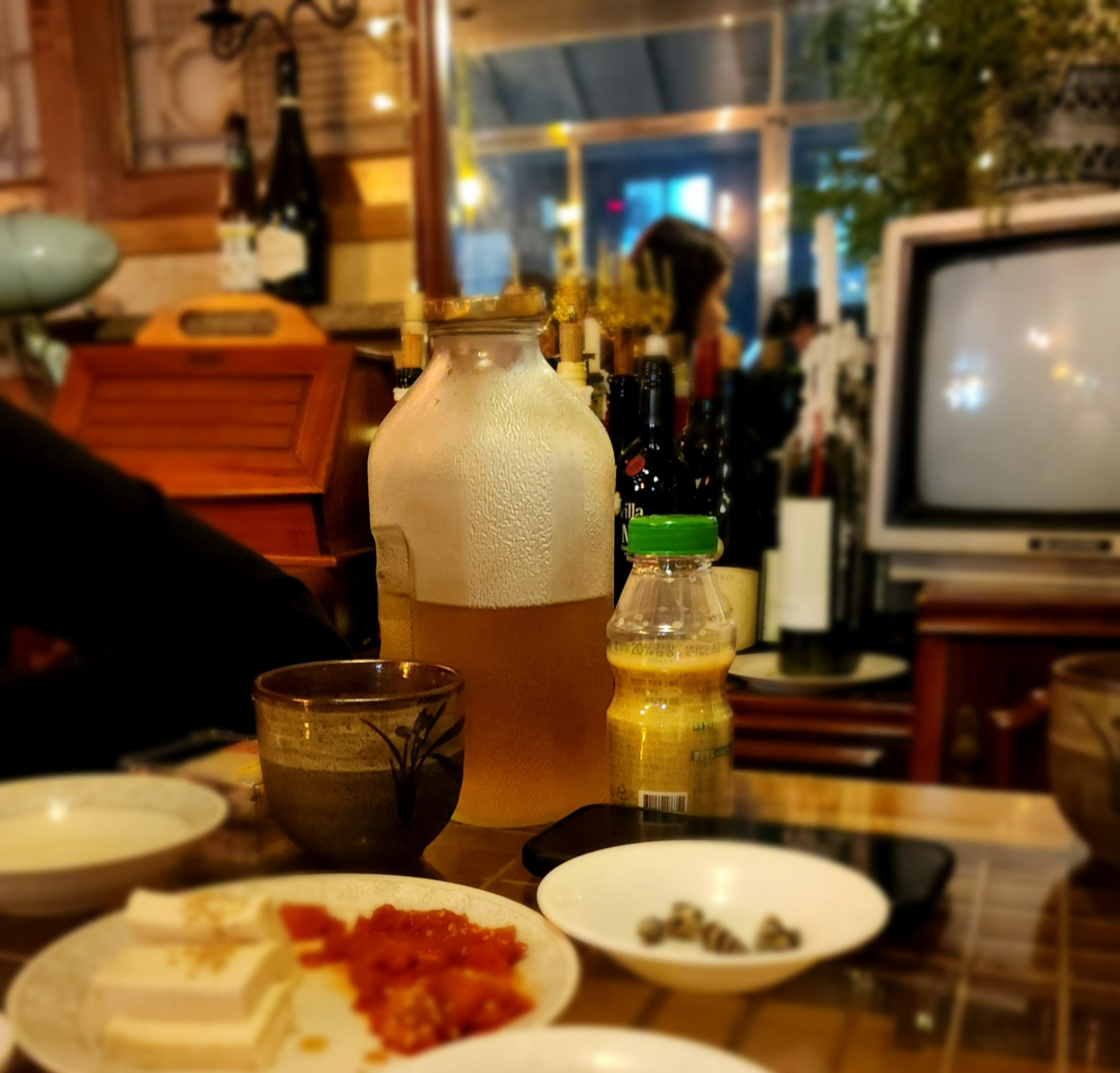 옛날 '점빵'이라고 불리던 곳을 개조해 놓은 것 같은 이곳은 조용한 골목 안에 유달리 북적거려서 나의 시선을 강탈해 버렸다. 과거와 현재가 공존하는 그야말로 힙한 공간. "우리 할머니도 이 유리병에 보리차를 담아주셨었지." 옛 추억이 새록새록 피어나는 곳. 분위기가 맛있어서 음식도 맛있게 느껴지는 이곳에서는 시그니처 아롱사태 수육을 꼭 먹어보라 넌지시 추천드린다. 흥에 겨운 젊은이들의 왁자지껄한 소리가 귀에 거슬리지 않고 이 장소 특유의 배경음으로 들리는 신기한 곳.