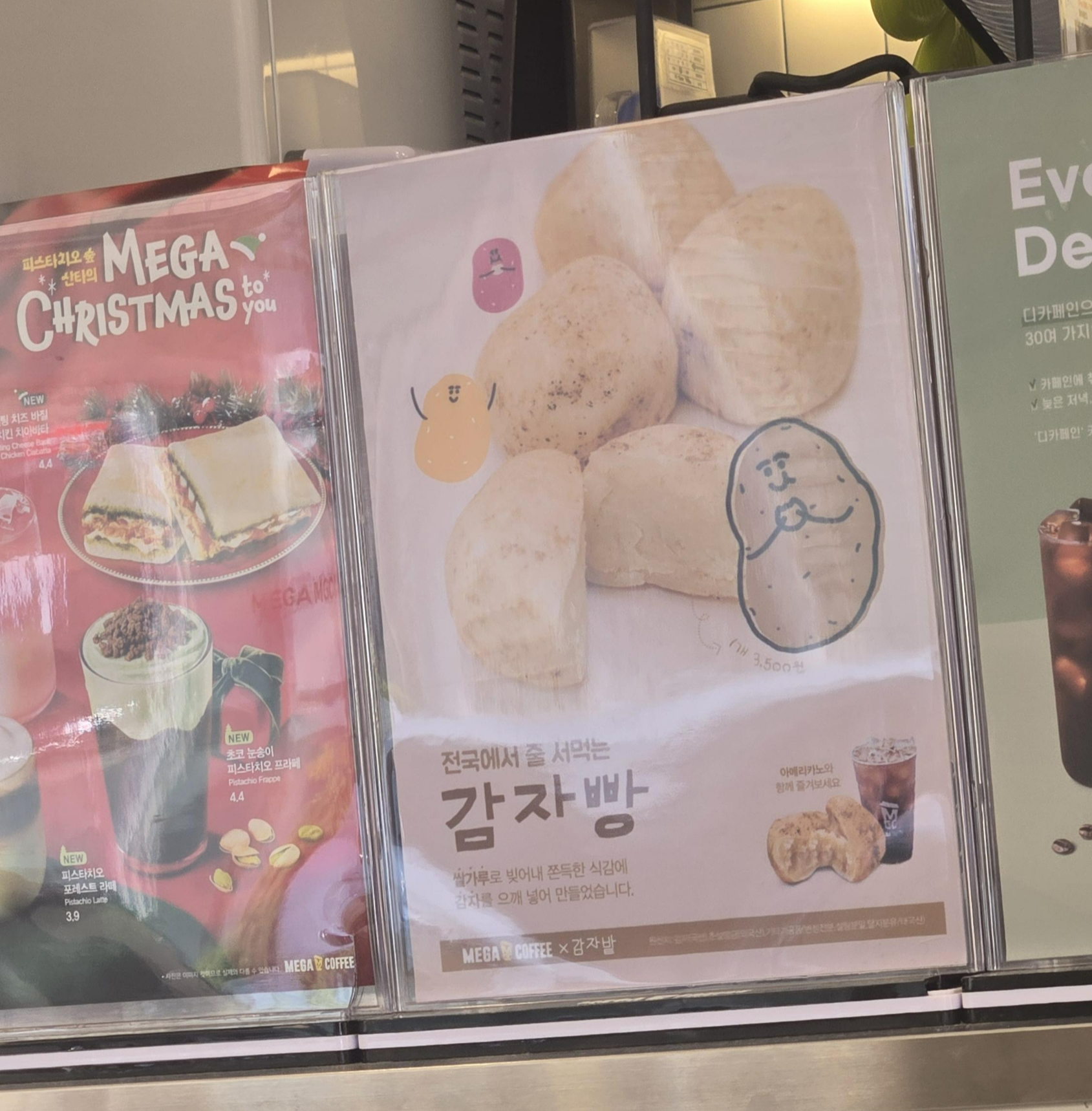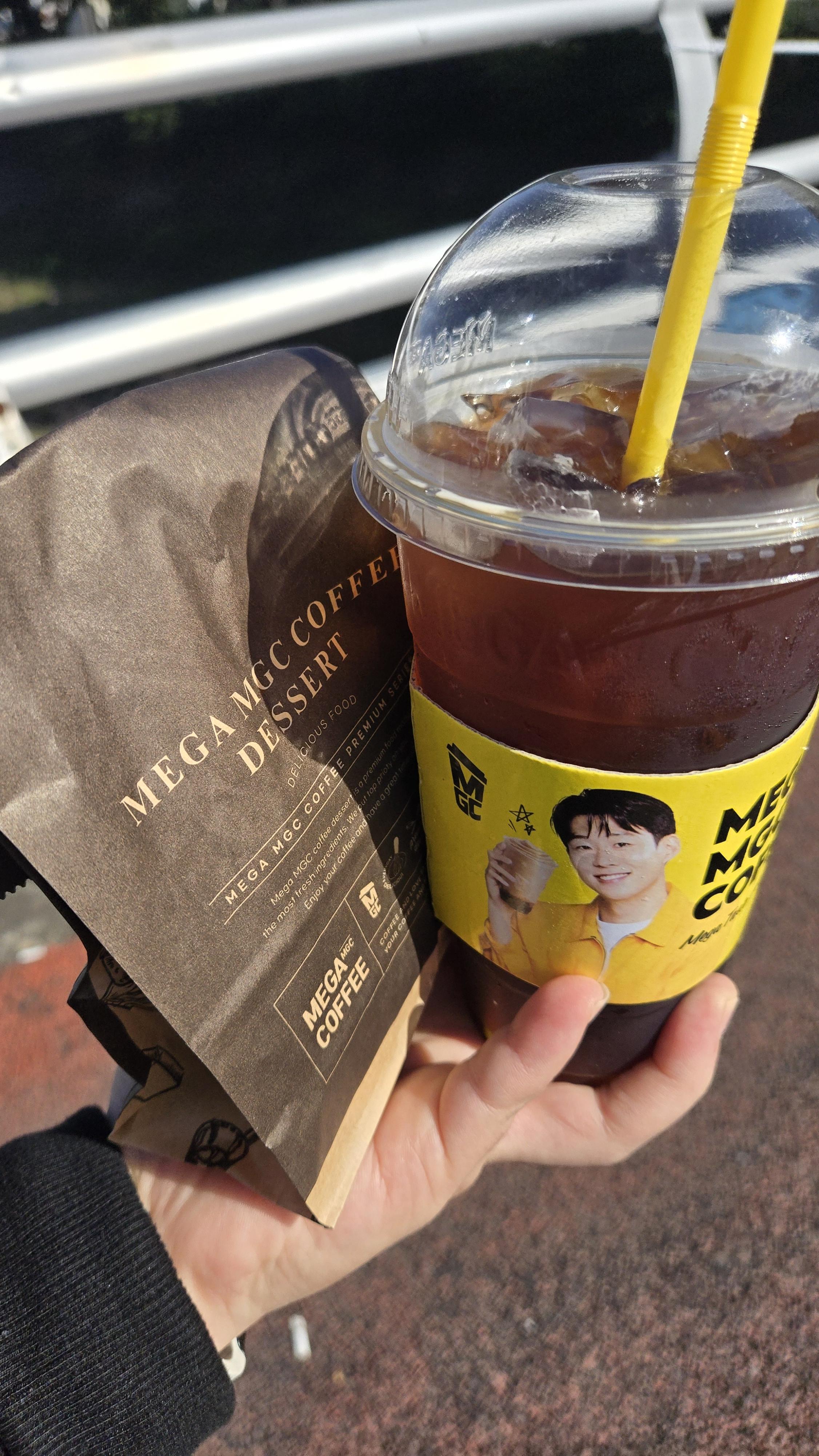 이렇게 갑자기 메가커피에 대해서 말하는 이유는 오늘 하루는 독서하는 시간을 갖고 싶어서 독서에 곁들일 커피가 당기는데 카누는 안 당겼거든. 오늘은 200원짜리 커피보다 2,000원짜리 커피가 마시고 싶은 날이랄까? 냉큼 만료일은 앞둔 쿠폰들을 보며 걸어서 5분 거리에 있는 메가커피를 다녀오겠다 하니 오사장이 감자빵을 사 오란다. 메가커피에서 커피밖에 안 마셔본 나로서는 엥? 거기 그런 것도 파냐며 나 매번 키오스크에서 어차피 나는 아메리카노 아이스 니까. 다른 칸은 볼 겨를도 없었지. 일단 사 와볼게.